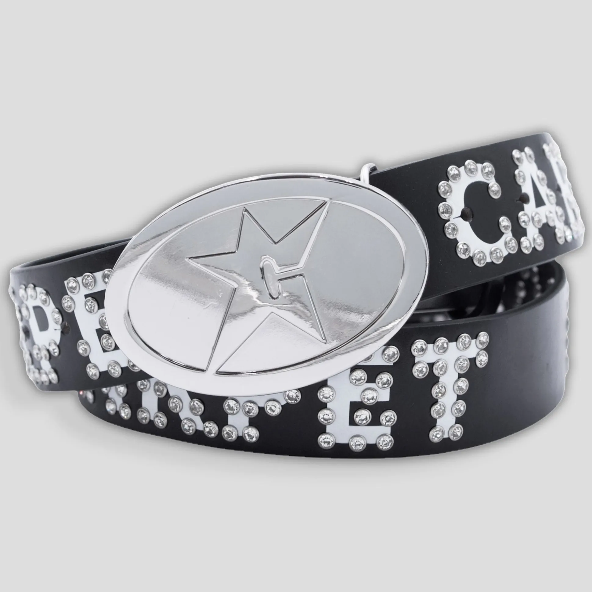 New Carpet Company season 19 now in at Pass~Port Store & Gallery. The Carpet Co leather belt includes a heavy metal logo buckle with rhinestone lettering.