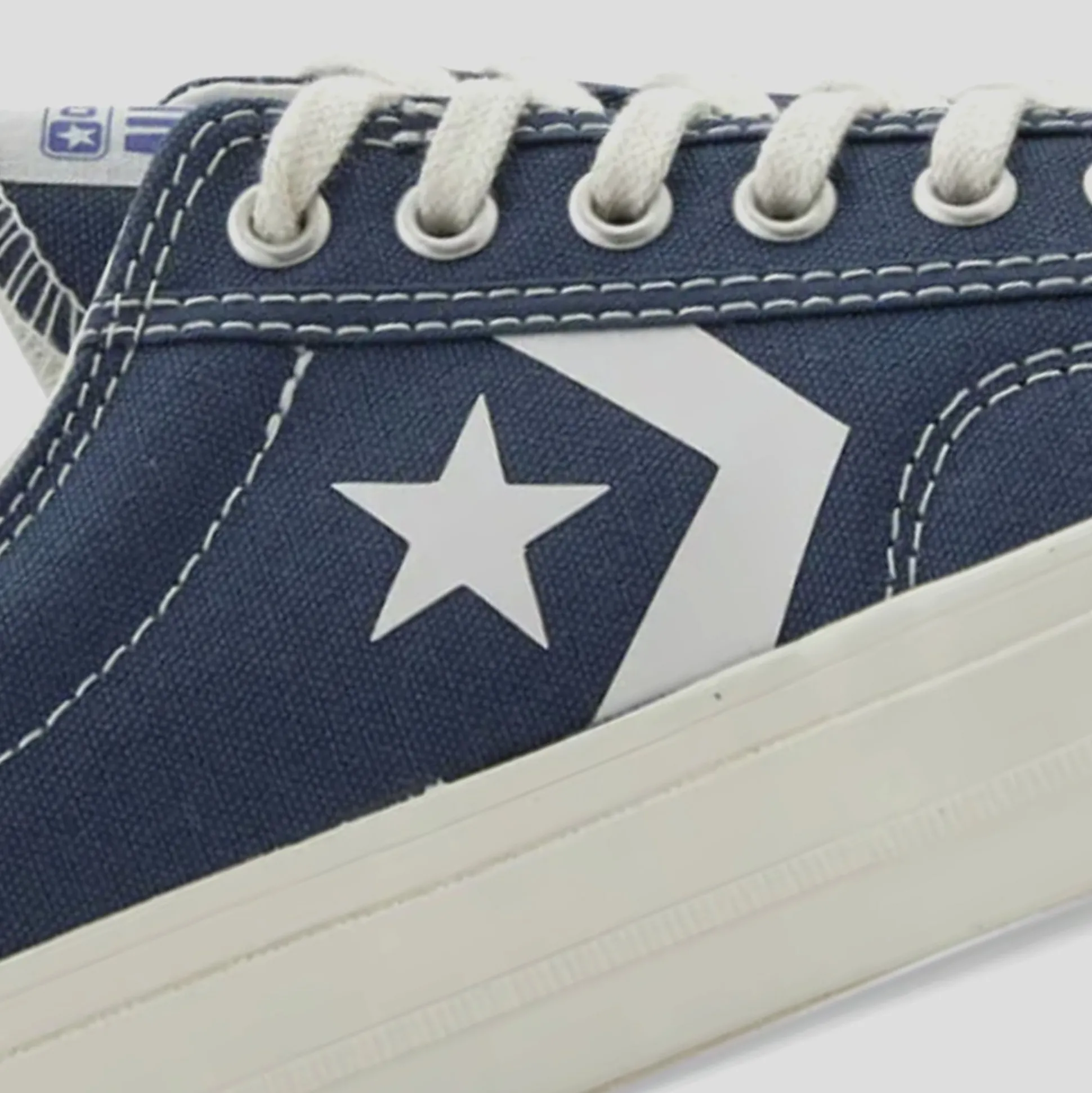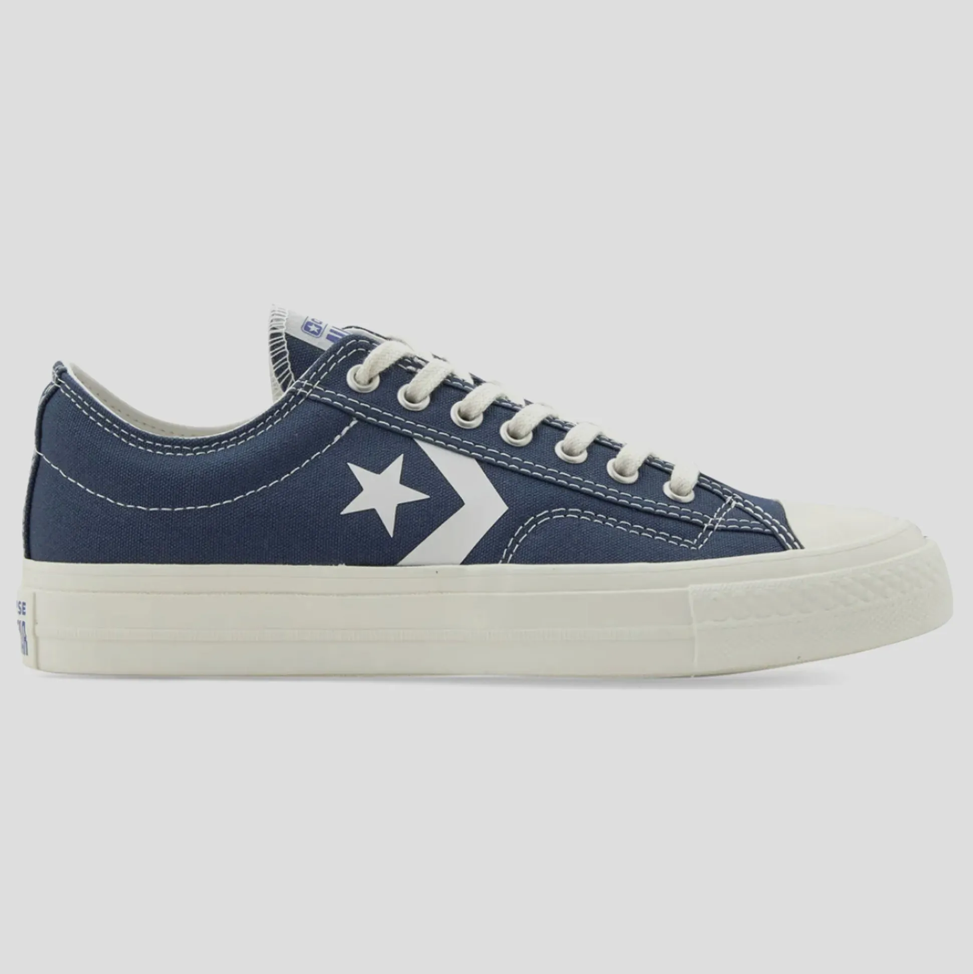 The Men’s Star Player 76 by Converse. The Converse skate shoe is a low-top profile with a heavyweight canvas upper featuring a leather Star Chevron, woven brand label on the tongue and a vintage-style logo plate.