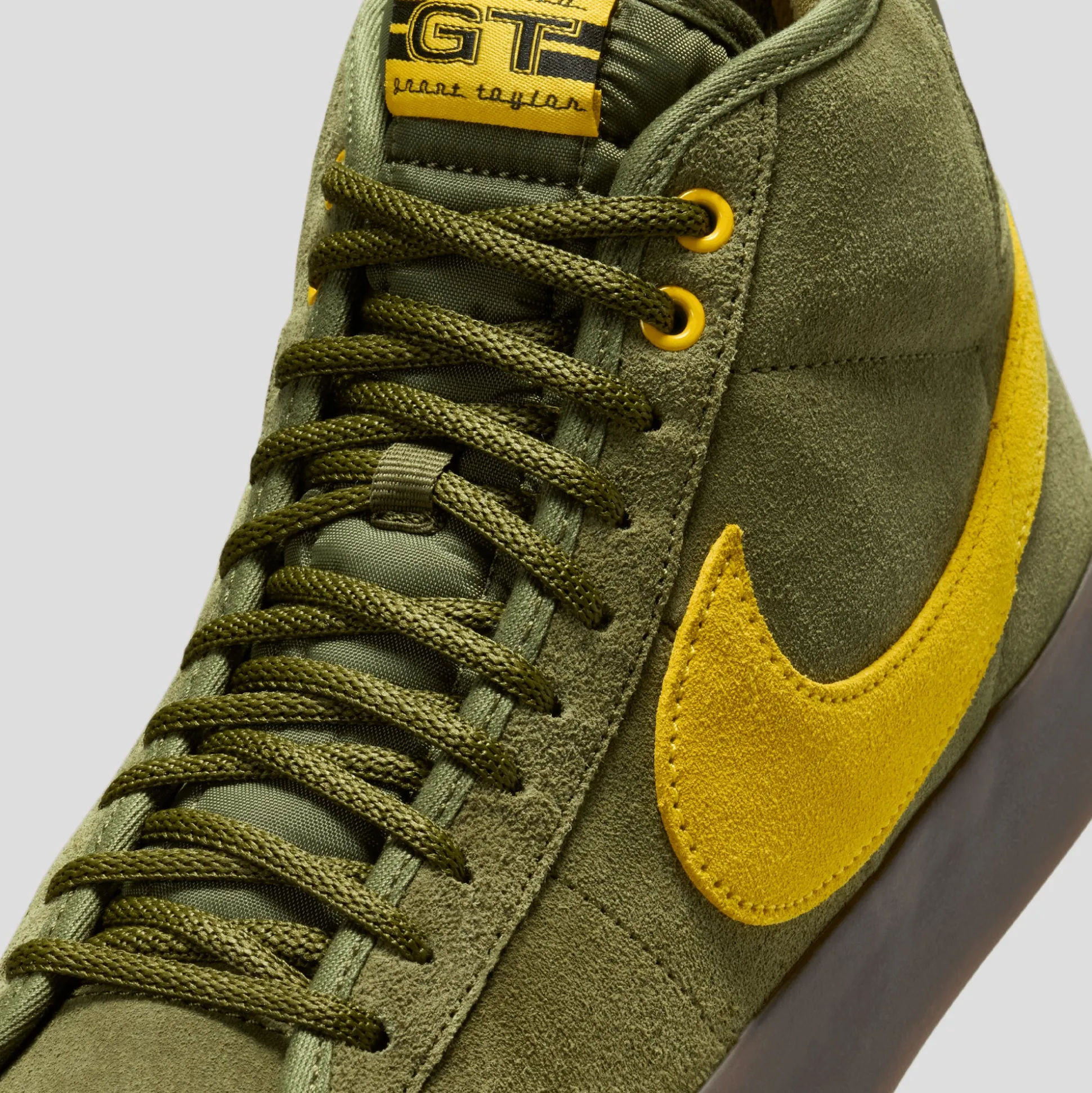 Nike SB & Anti Hero come together on the Blazer Mid & Dunk High. Grant Taylor’s signature shoe flying the flag, it features a durable Rough Green suede construction with pops of Amarillo yellow. Complete with semi-translucent taping, the clear outsole reveals a zoomed-in view of Grant’s thrashed and loved Antihero “eagle” deck.
