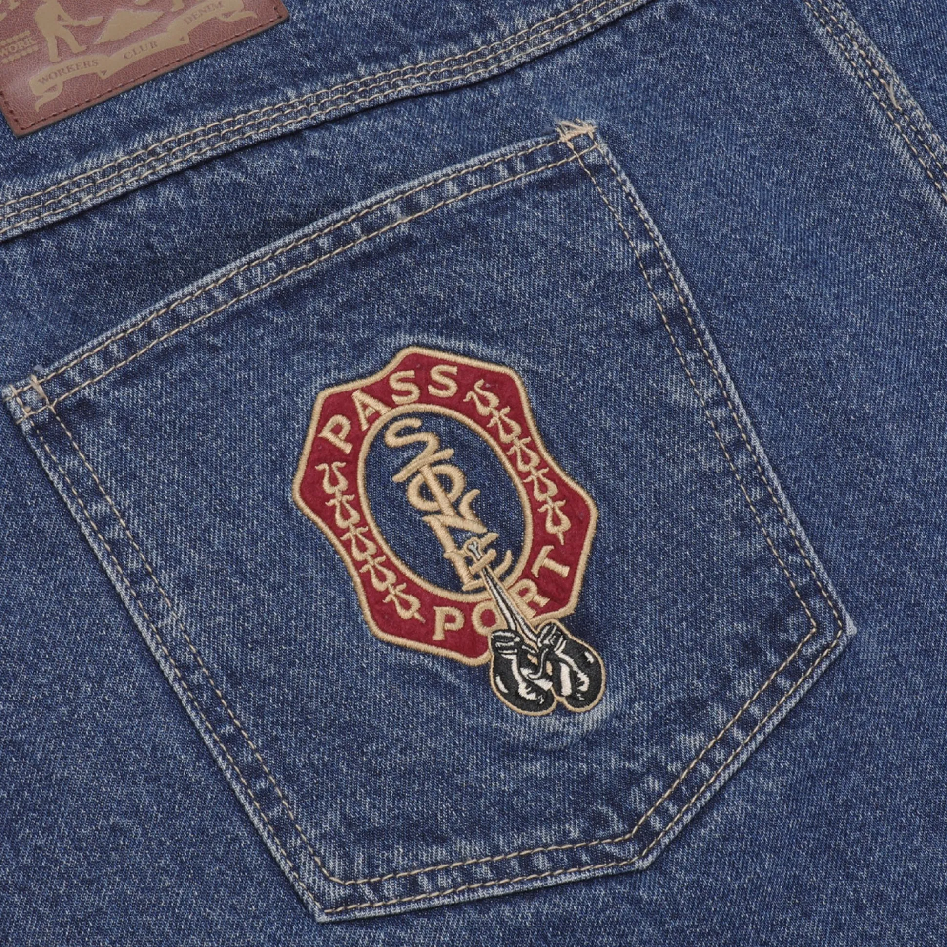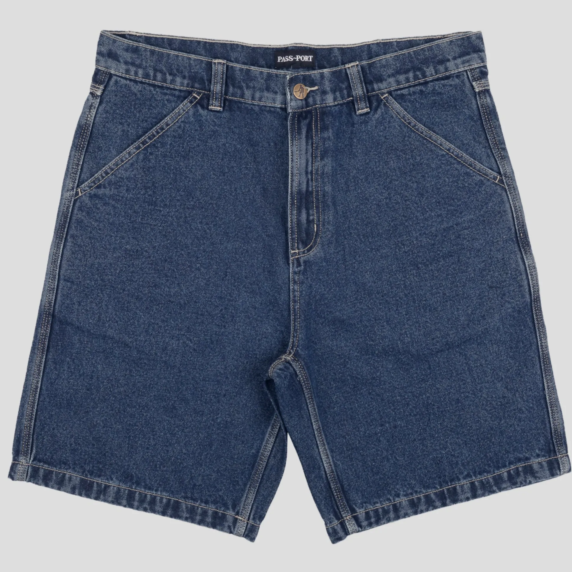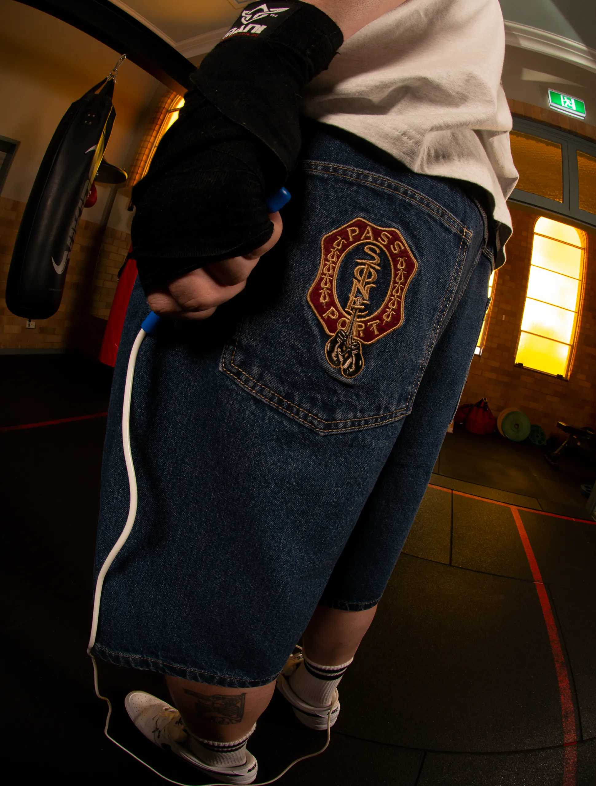 The Workers denim shorts is made from 100% cotton 16oz rigid denim and fine yarn for extra strength. The denim jean features gold contrast stitching, double direct embroidery on back pockets as well a faux leather label on waist.