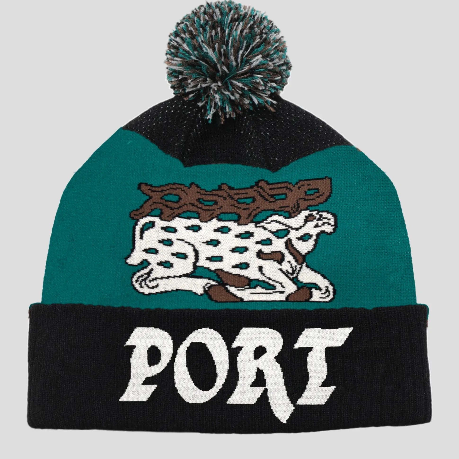 Pass~Port Antler Pom beanie from range #41. The Antler Pom beanie is a knit construction made from 100% acrylic yarn which features pom pom on top direct embossed graphic on front and back.
