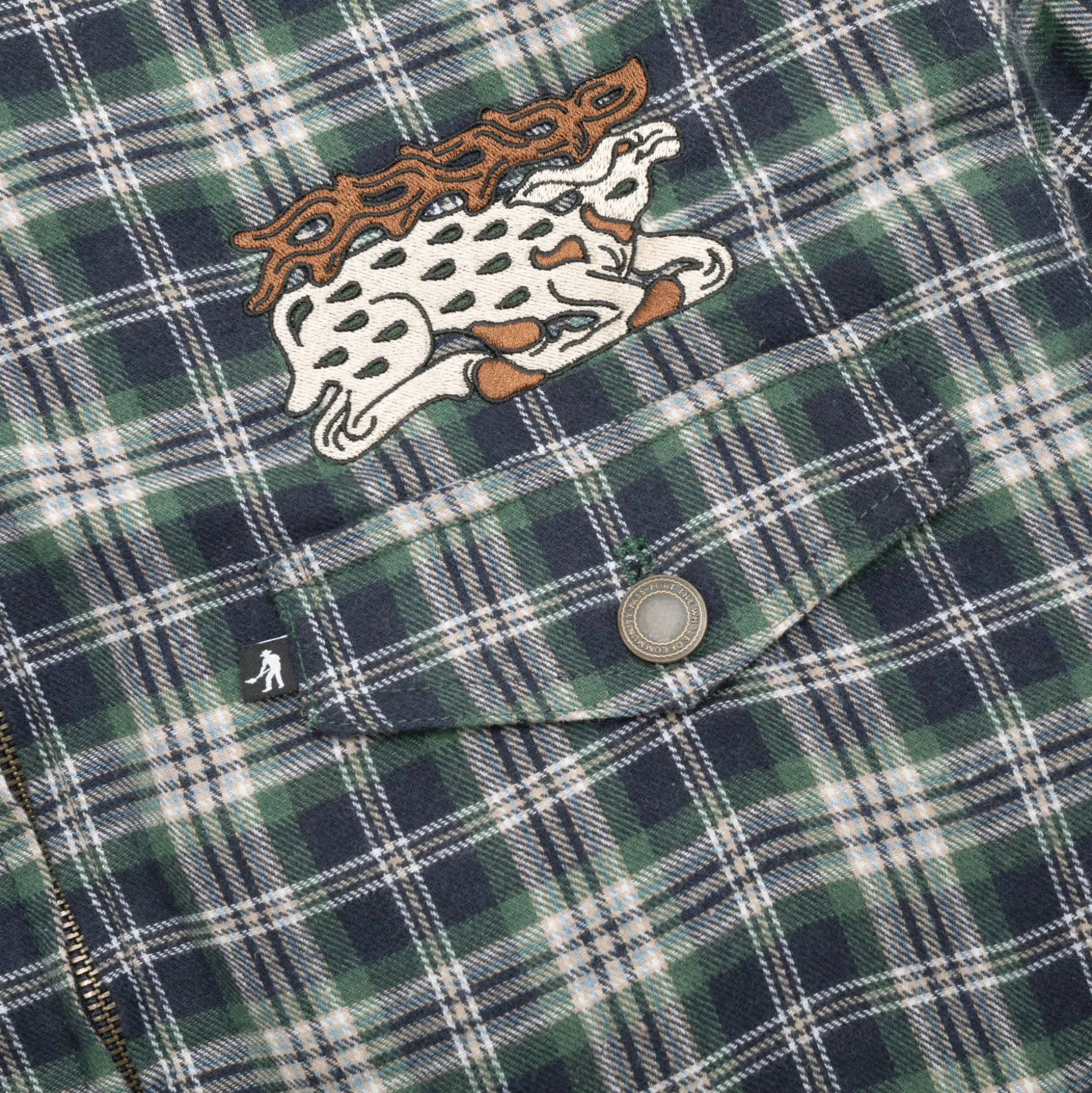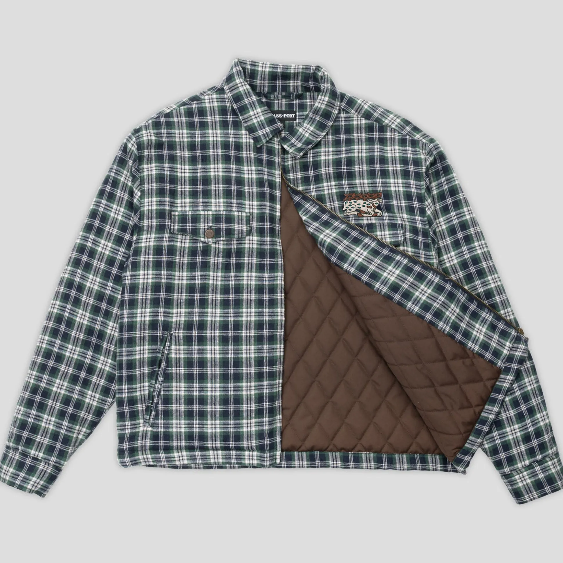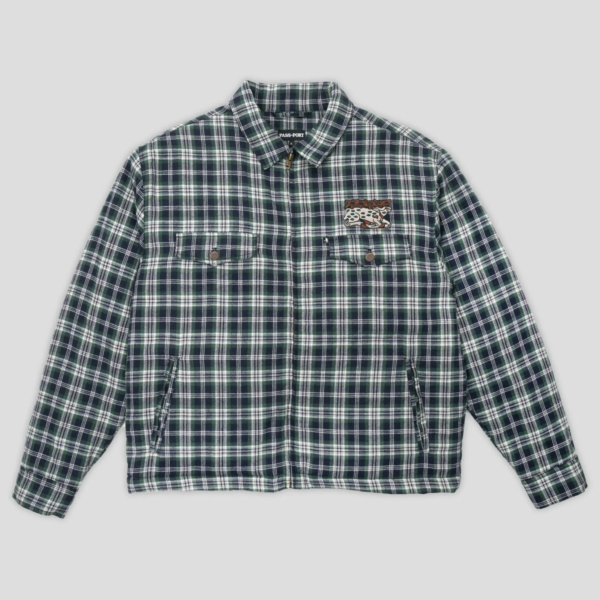 Pass~Port Antler Zip Flannel Jacket in navy / green from range #41. The Antler Zip jacket is made from 100% soft cotton with cotton poplin lining. The Flannel features direct embroidery and recycled zip.