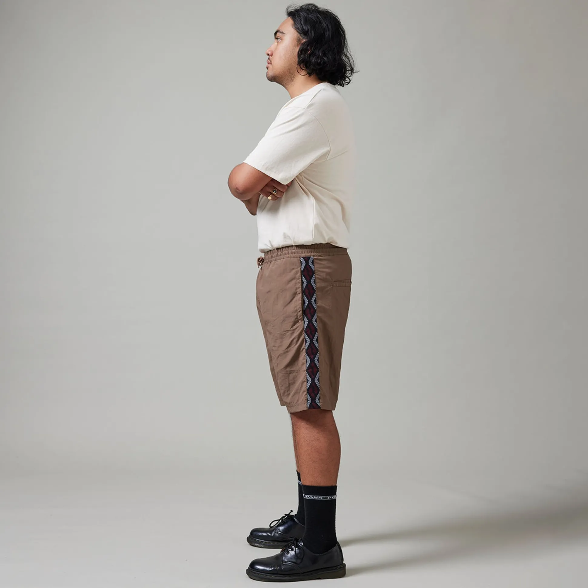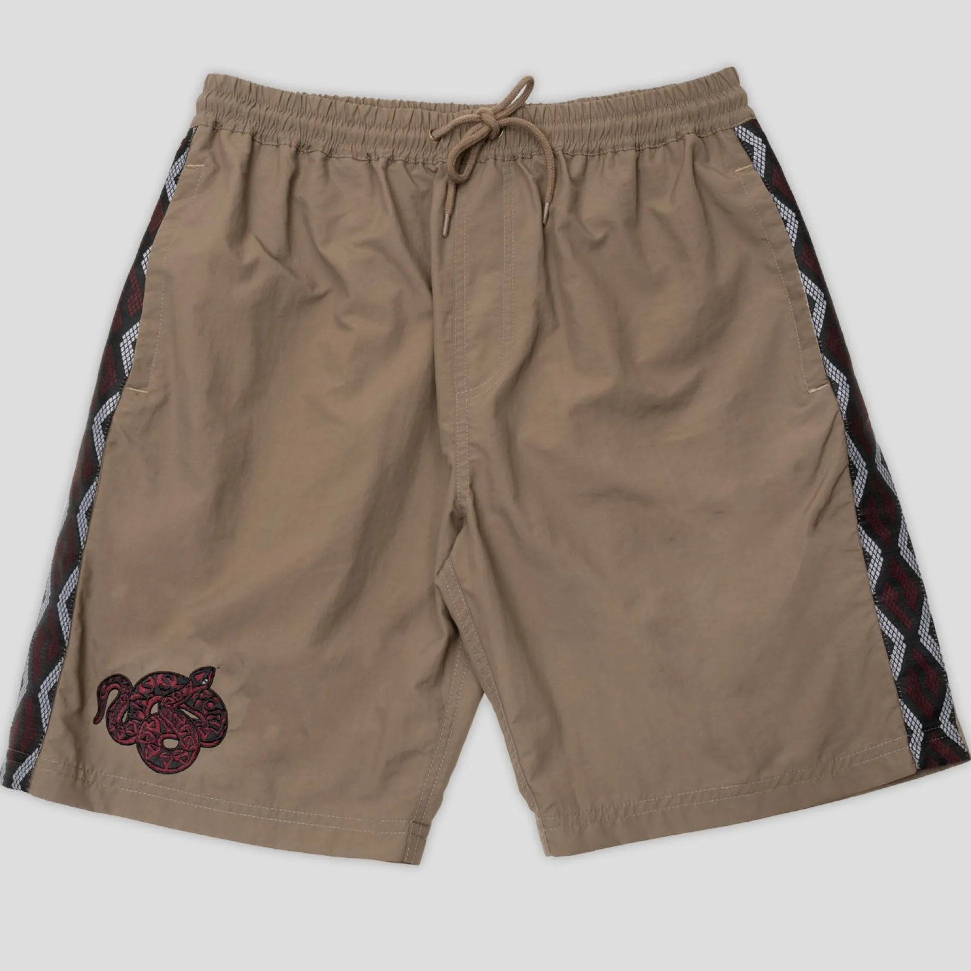 Pass~Port Coiled RPET casual short in sand for range #41. The Coiled beach short is of made from 100% recycled water bottles (RPET polyester) with direct embroidery and mesh lined pockets.