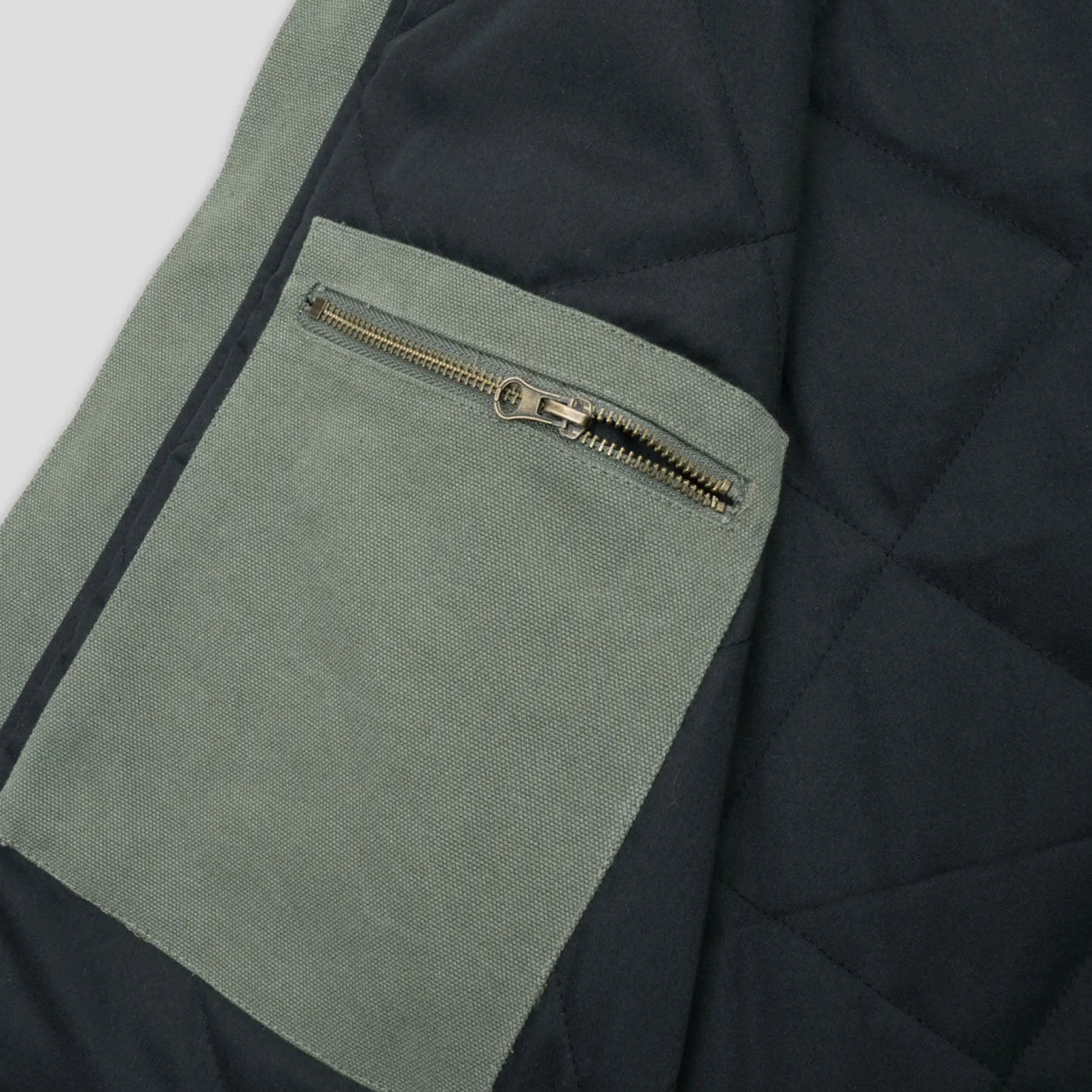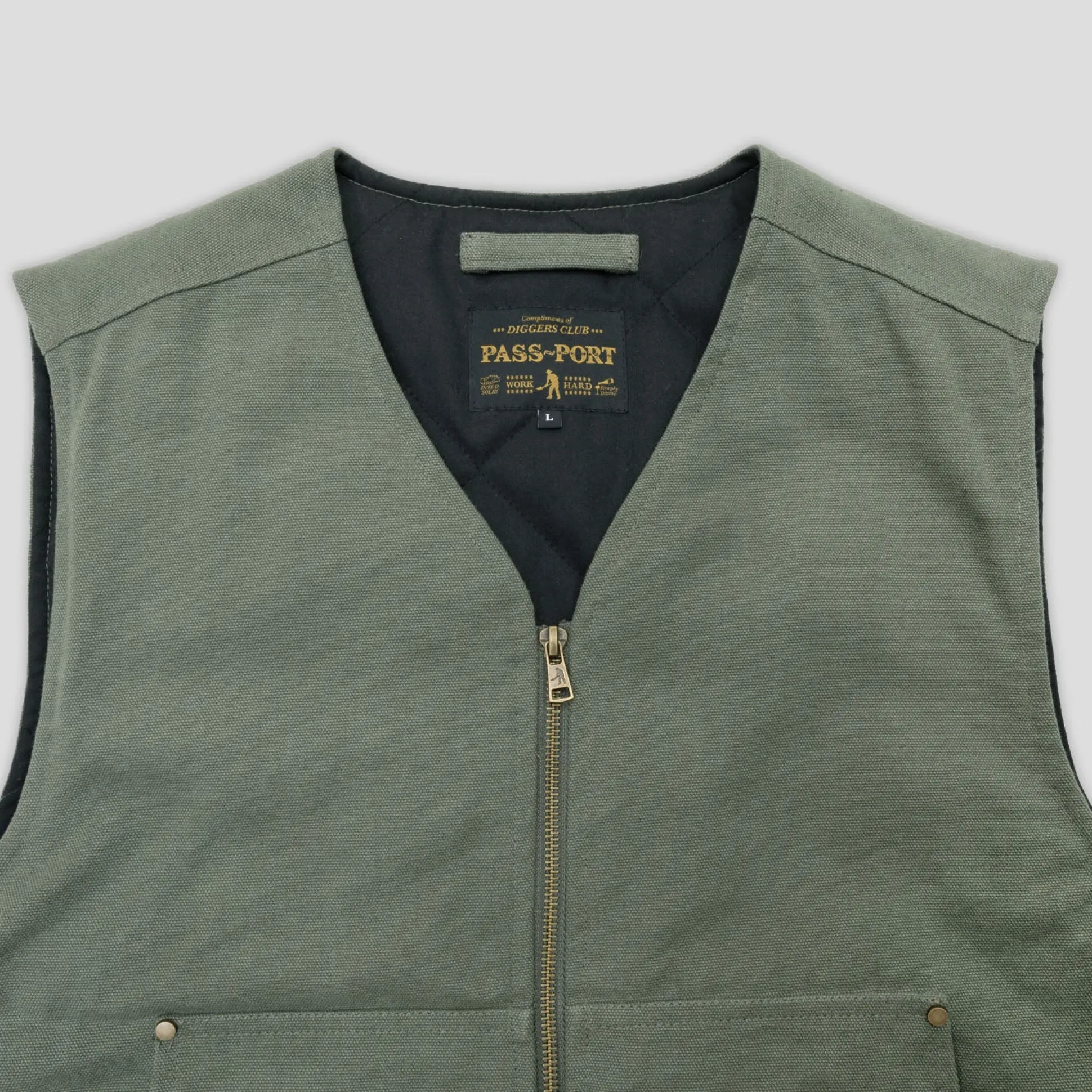 Pass~Port Diggers Club Vest in mud from range #41. The Pass~Port canvas vest is made from 100% heavy duty washed canvas and features digger man embroidery on front. The Diggers Club vest is lined with cotton poplin and features 2 internal pockets and 4 external pockets.