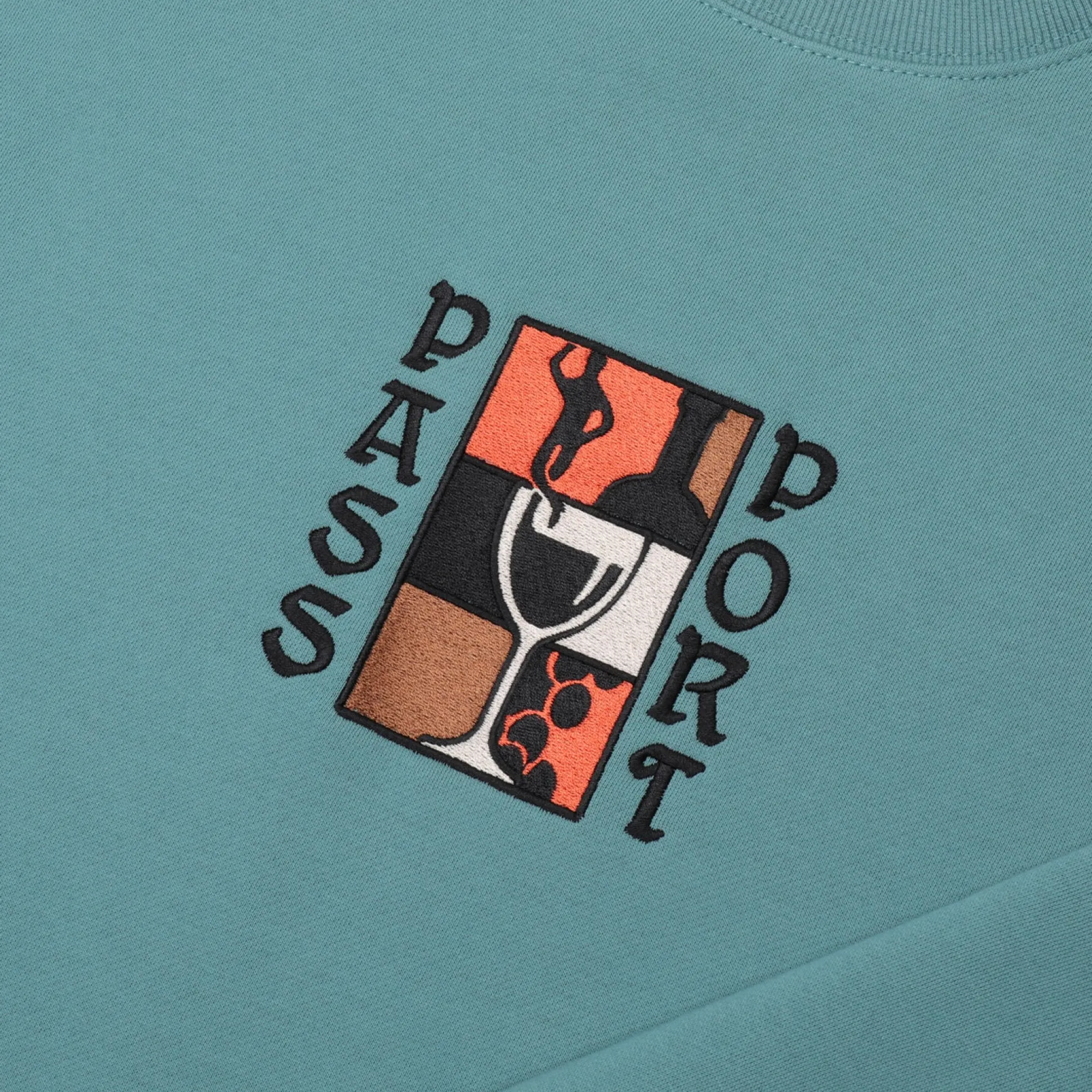 Pass~Port Dine Em’ crewneck in washed out teal from range #42. The Pass~Port jumper is made from a cotton polyester blend and features a embroidered graphic on front which is finished in the classic Pass~Port sweater fit.