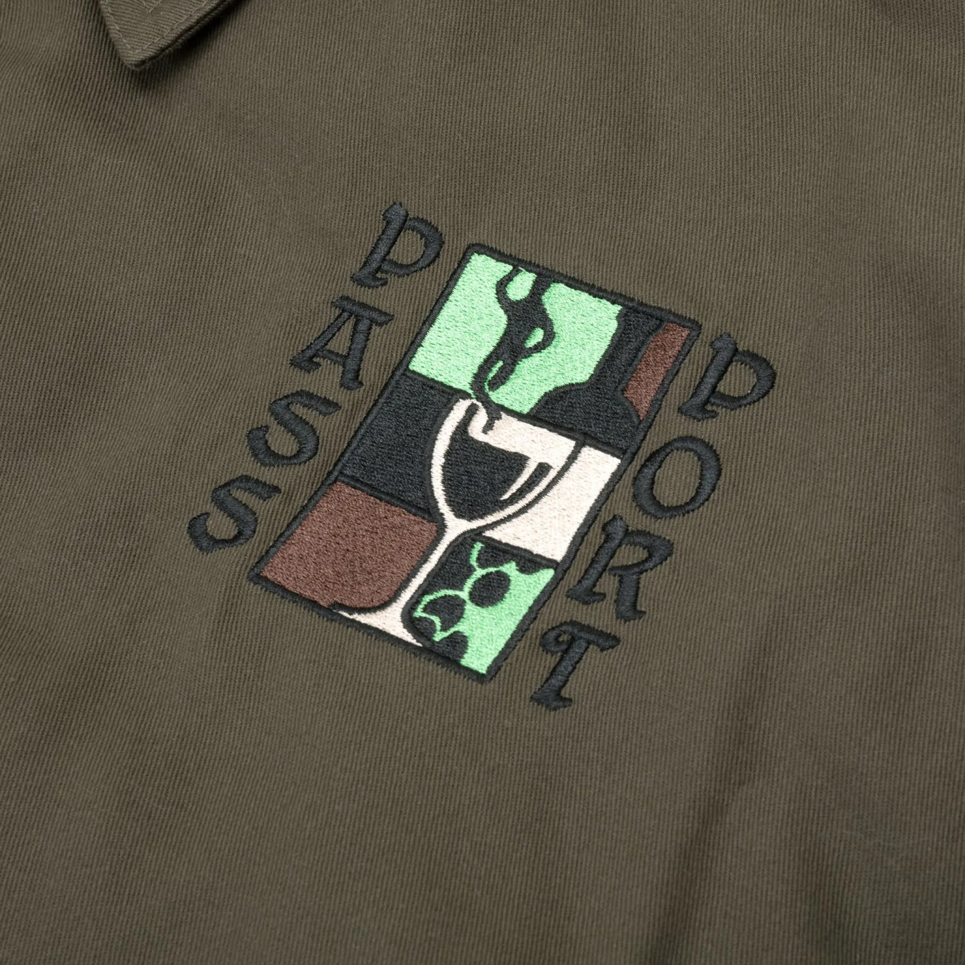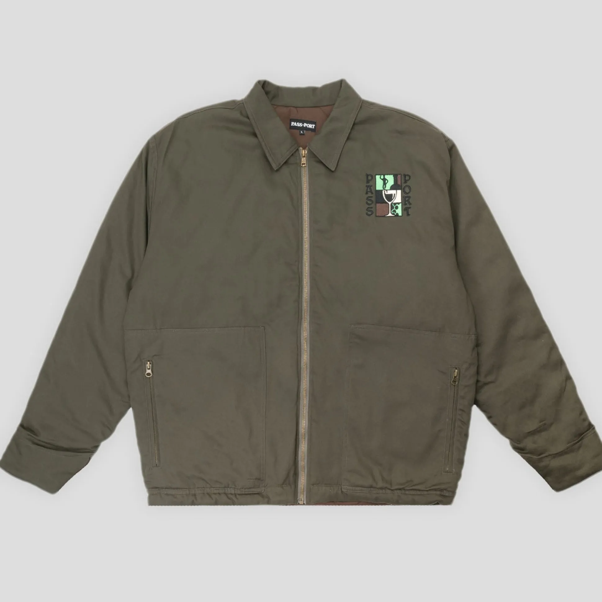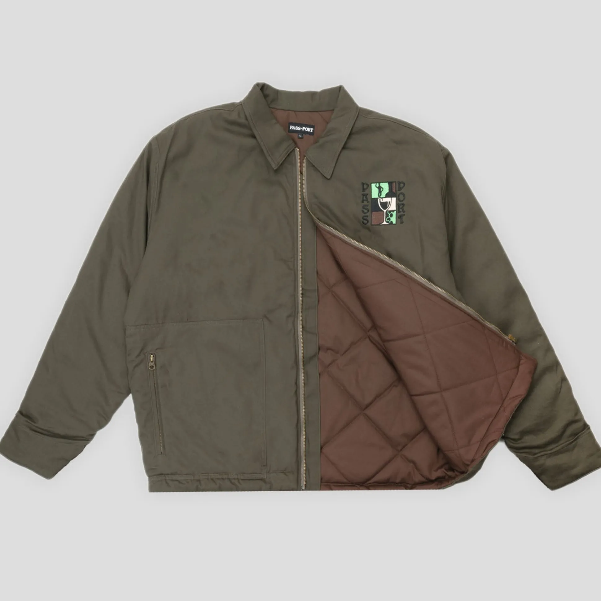 Pass~Port Dine Em’ Workers jacket in olive from range #42. This Pass~Port jacket is made from 100% cotton and is lined with a quilted cotton poplin. The Dine Em’ jacket also features embroidery graphic on front with adjustable wrist cuffs.