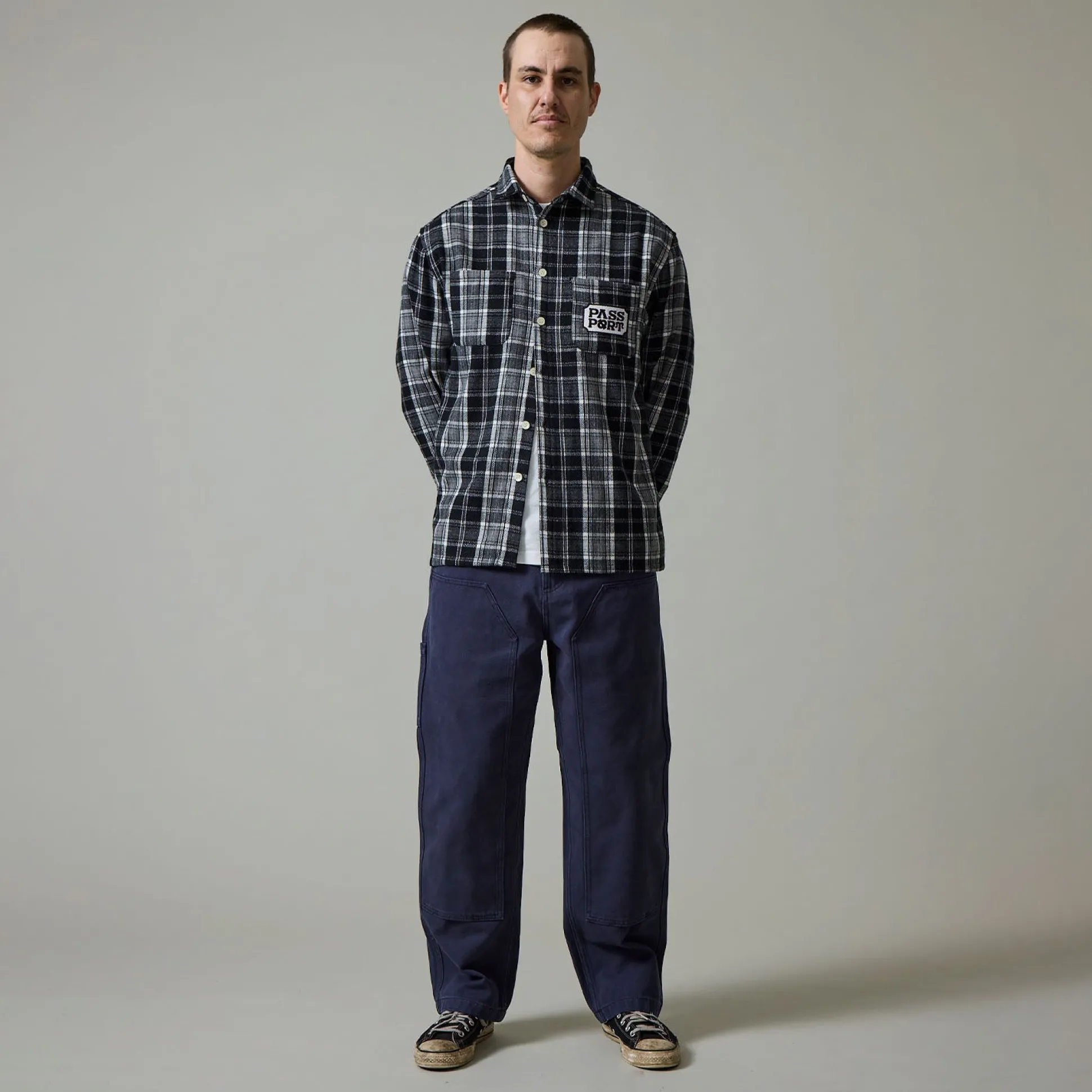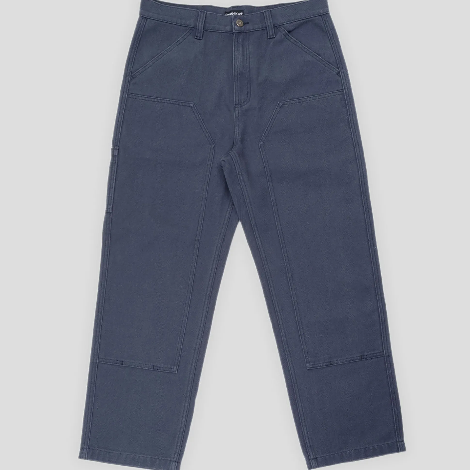 Pass~Port Double Knee Diggers Club pant in navy from range #42. A update to the favourite staple the Diggers Pant. The Double knee pant is made from 100% cotton heavy duty canvas and has been updated with double paneling in the knees. Made for hard work these trousers feature the digger embroidery on back pocket as well tonal triple stitch construction.