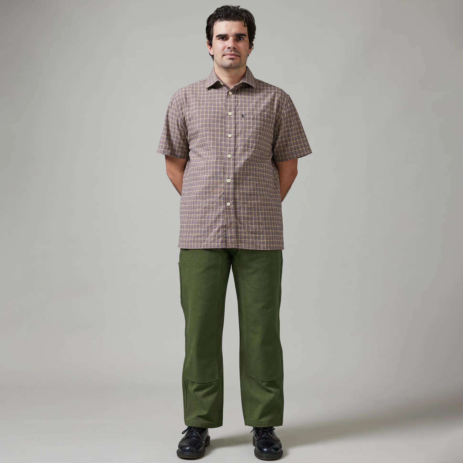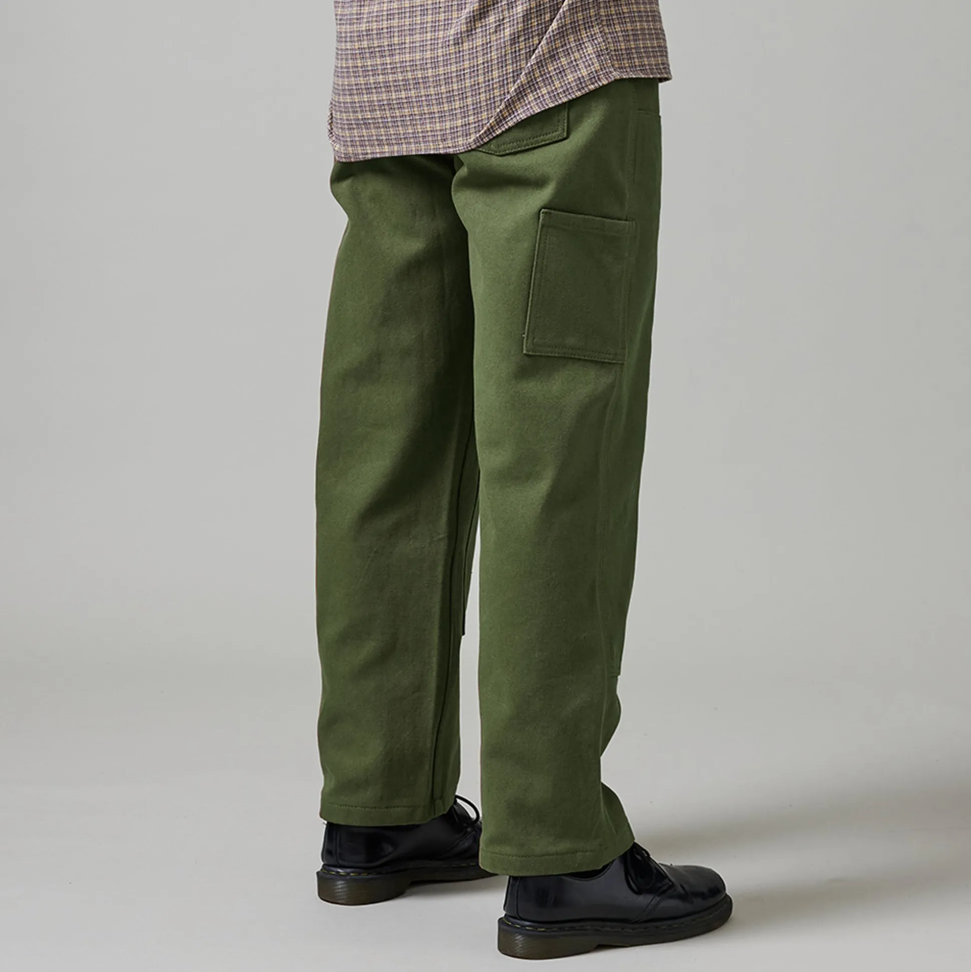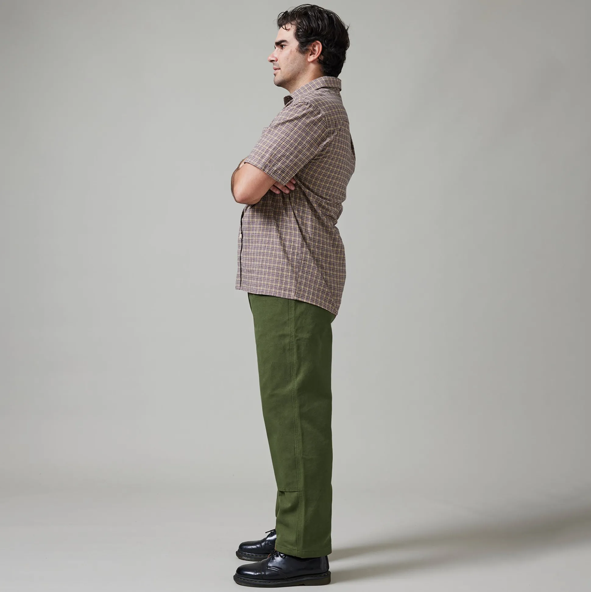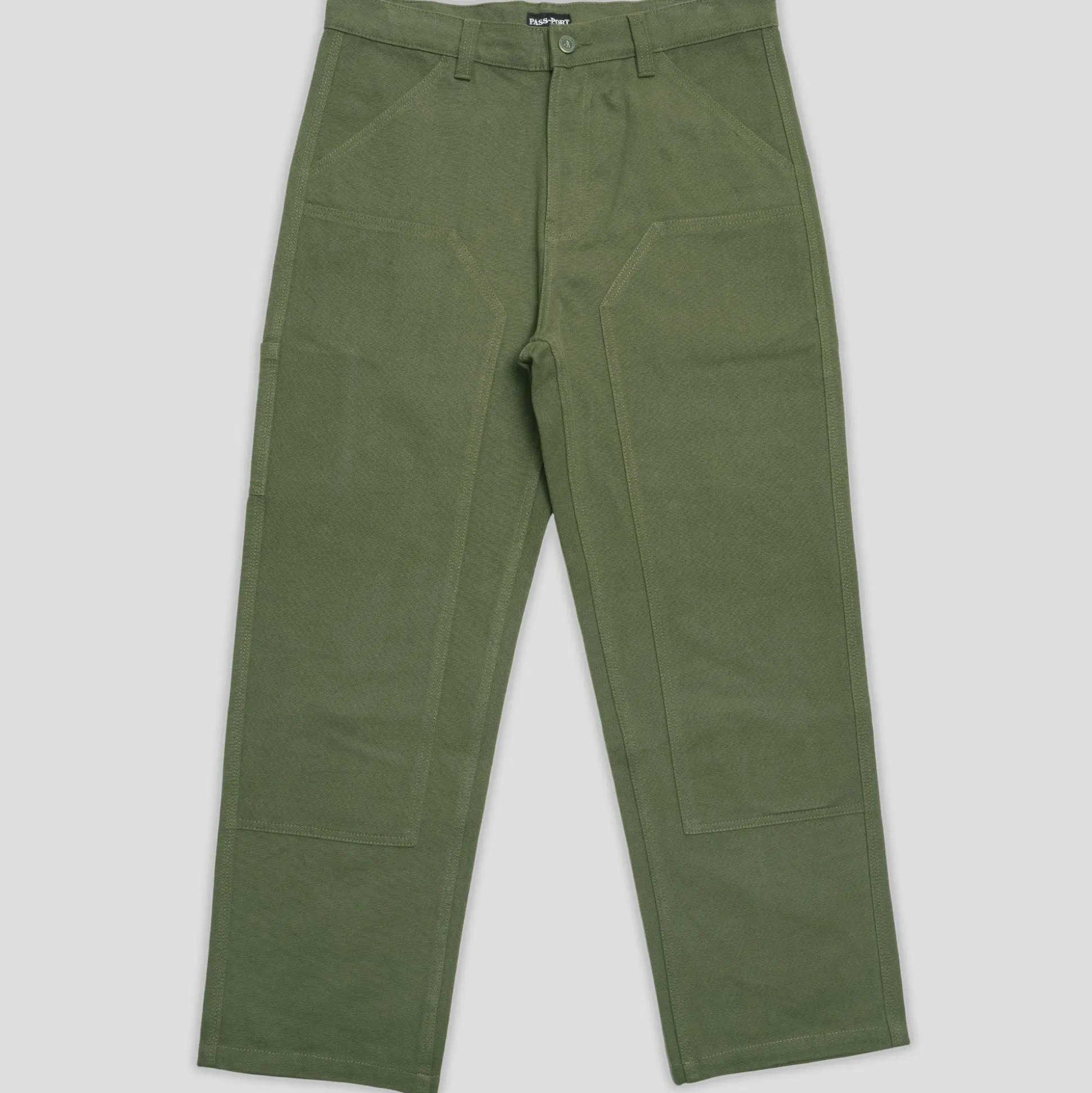Pass~Port Double Knee Diggers Club pant in olive from range #40. A update to the favourite staple the Diggers Pant. The Double knee pant is made from 100% cotton heavy duty canvas and has been updated with double paneling in the knees. Made for hard work these trousers feature the digger embroidery on back pocket as well tonal triple stitch construction.