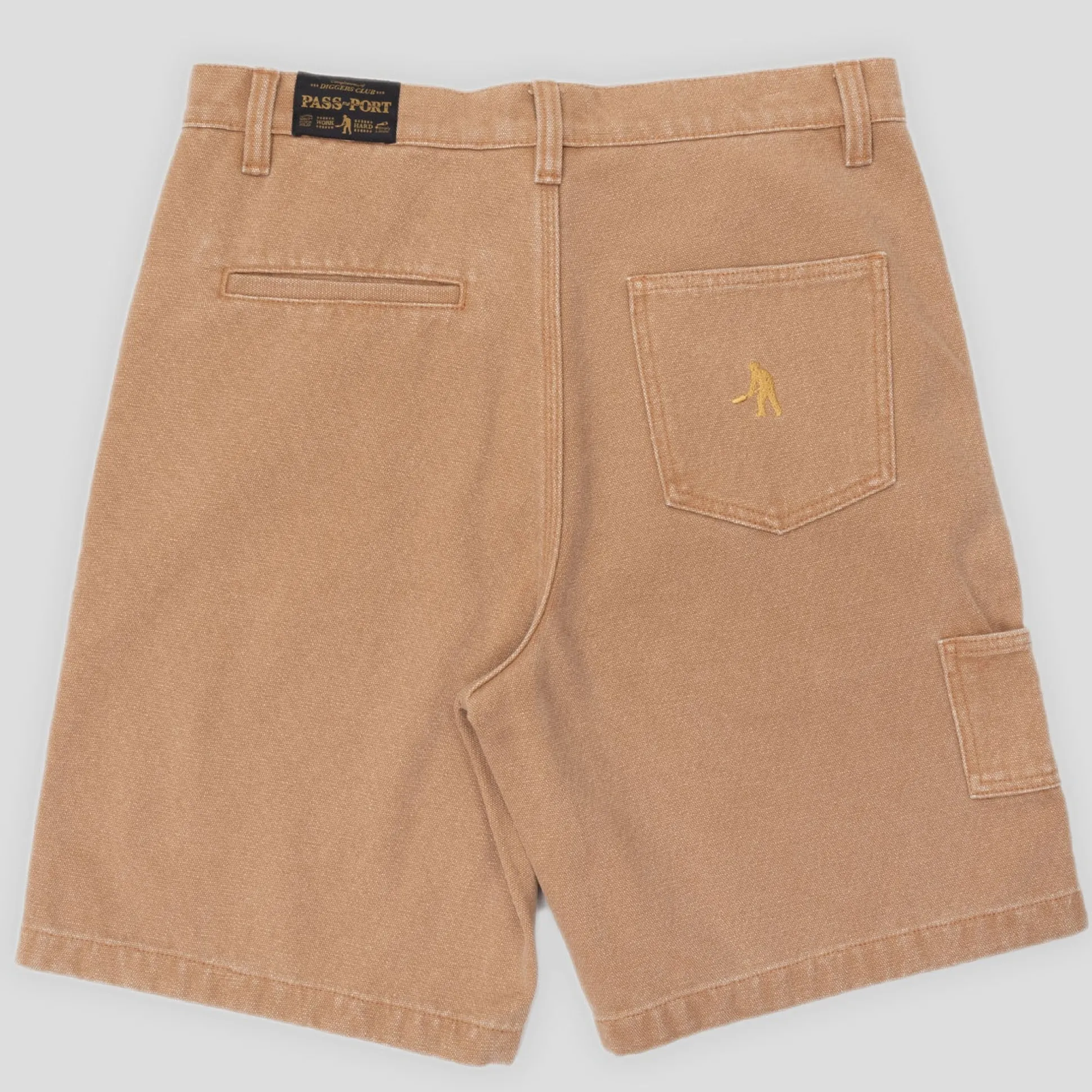 Pass~Port Double Knee Diggers Club short in caramel from range #42. A update to the favourite staple the Diggers short. The Double knee short is made from 100% cotton heavy duty canvas and has been updated with double paneling in the knees. Made for hard work these trousers feature the digger embroidery on back pocket as well tonal triple stitch construction.