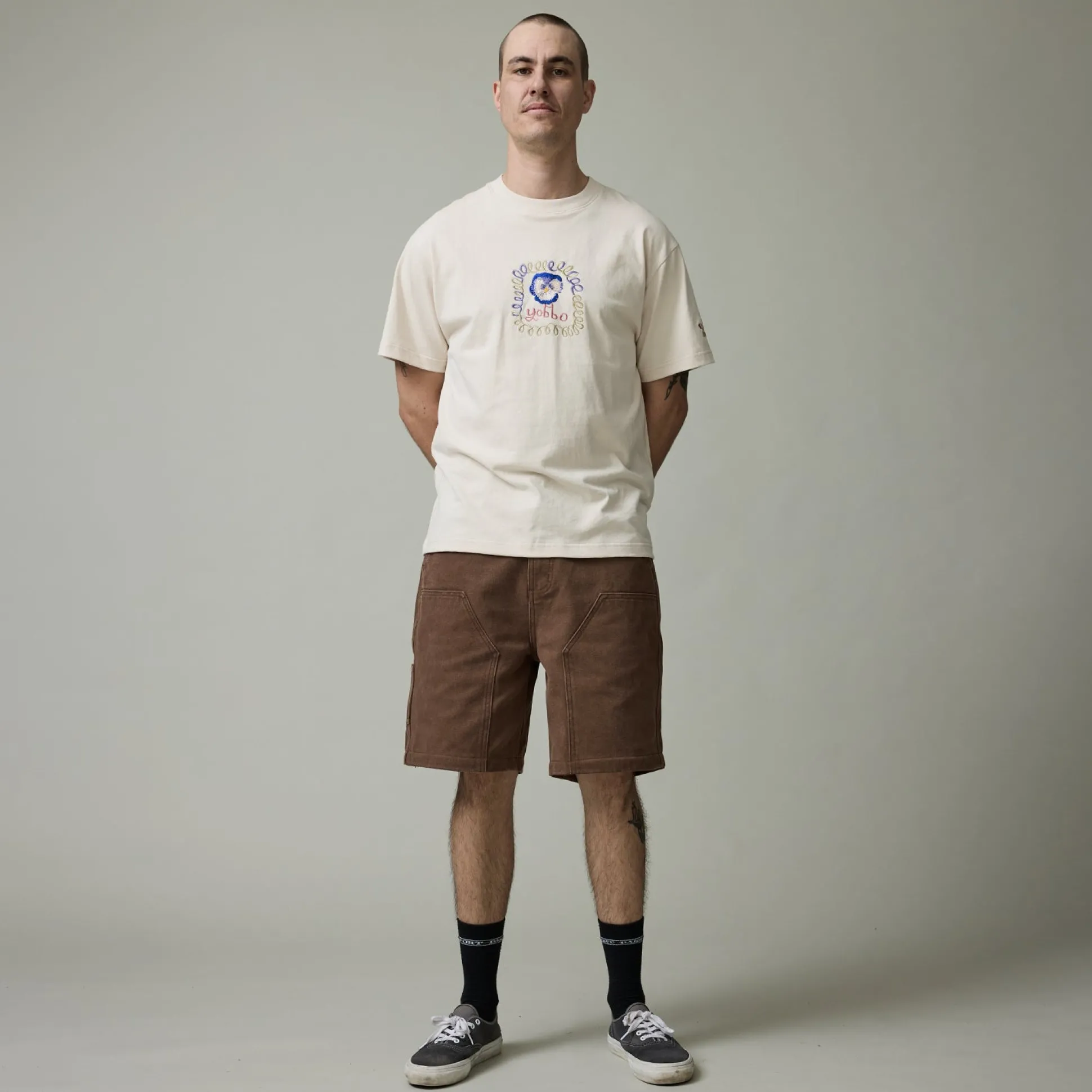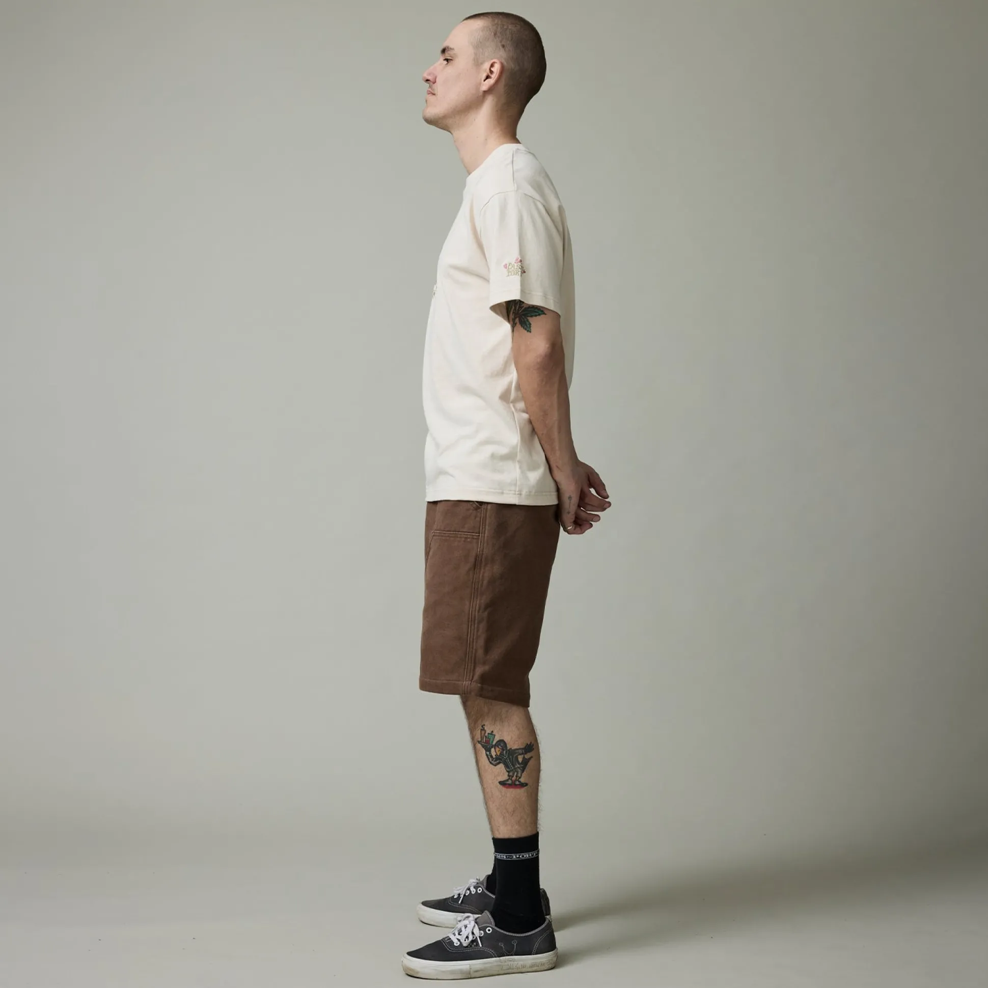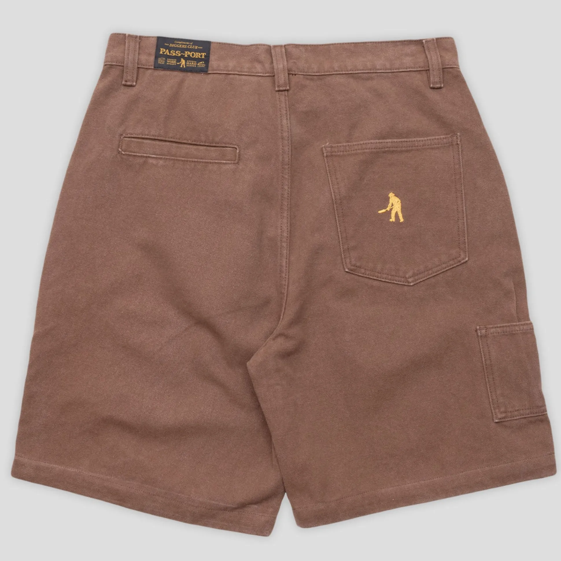 Pass~Port Double Knee Diggers Club short from range #43. The Double knee pant is made from 100% cotton heavy duty canvas and has been updated with double paneling in the knees. Made for hard work these trousers feature the digger embroidery on back pocket as well triple stitch construction.