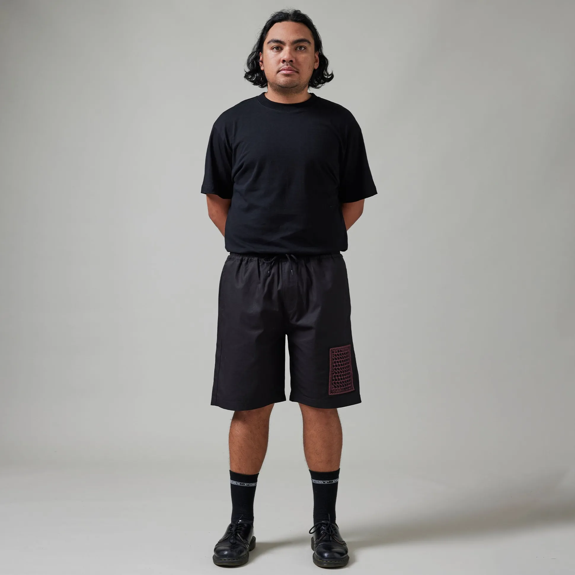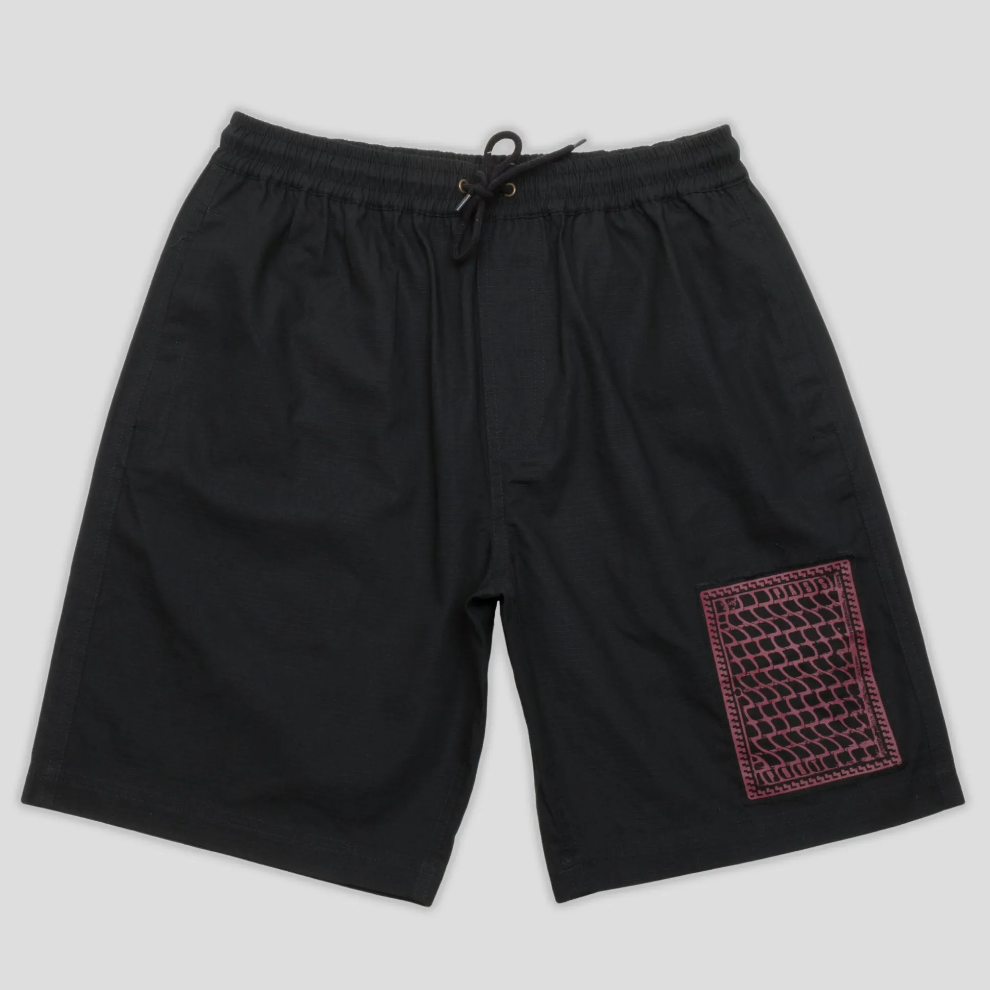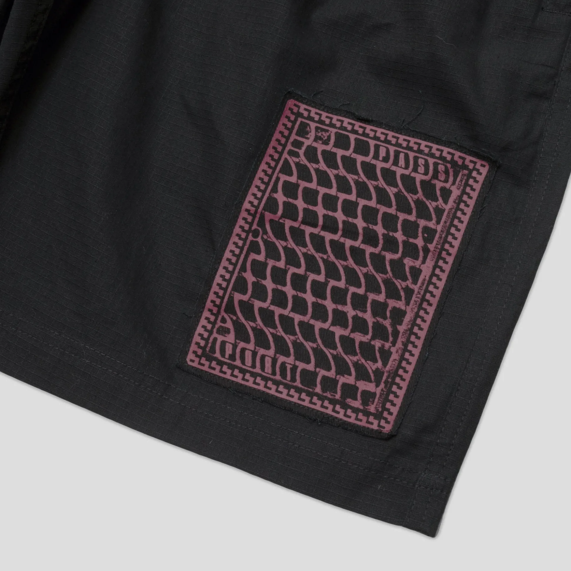 Pass~Port Drain Ripstop casual short in black for range #40. The ripstop shorts are made from 100% cotton ripstop and feature sewn screen printed patch and draw string adjustment.