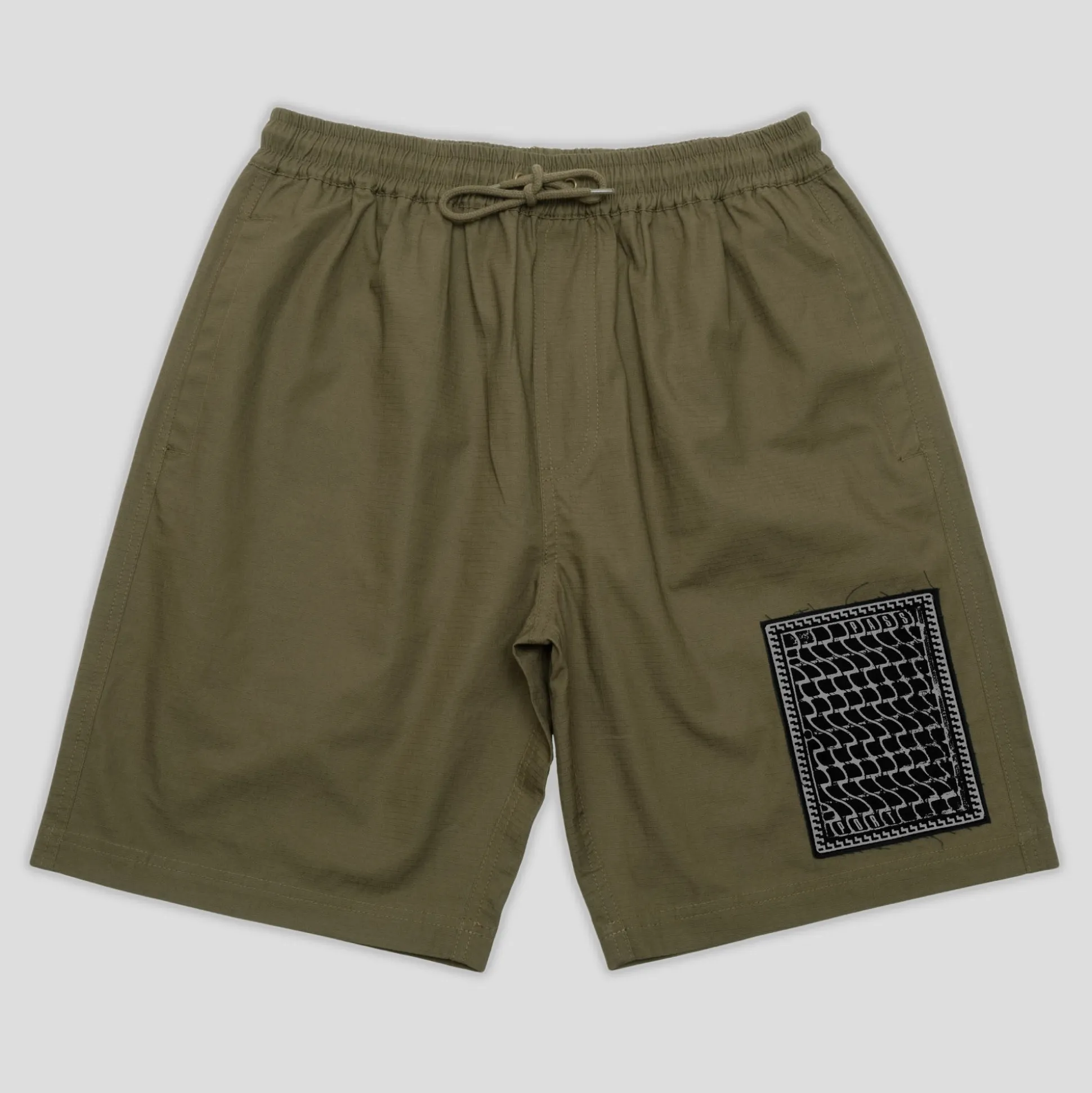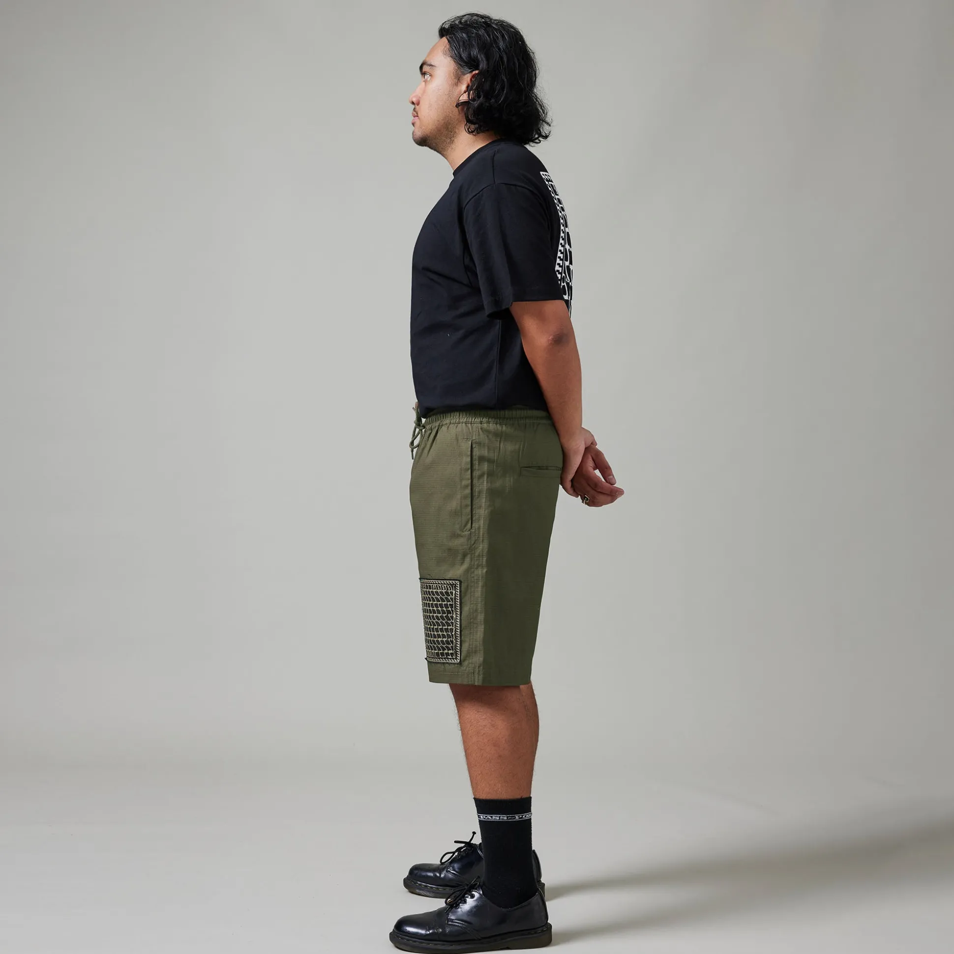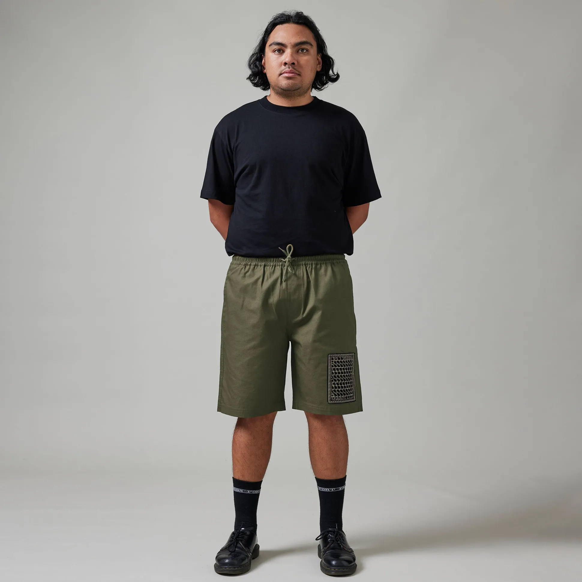 Pass~Port Drain Ripstop casual short in olive for range #40. The ripstop shorts are made from 100% cotton ripstop and feature sewn screen printed patch and draw string adjustment.