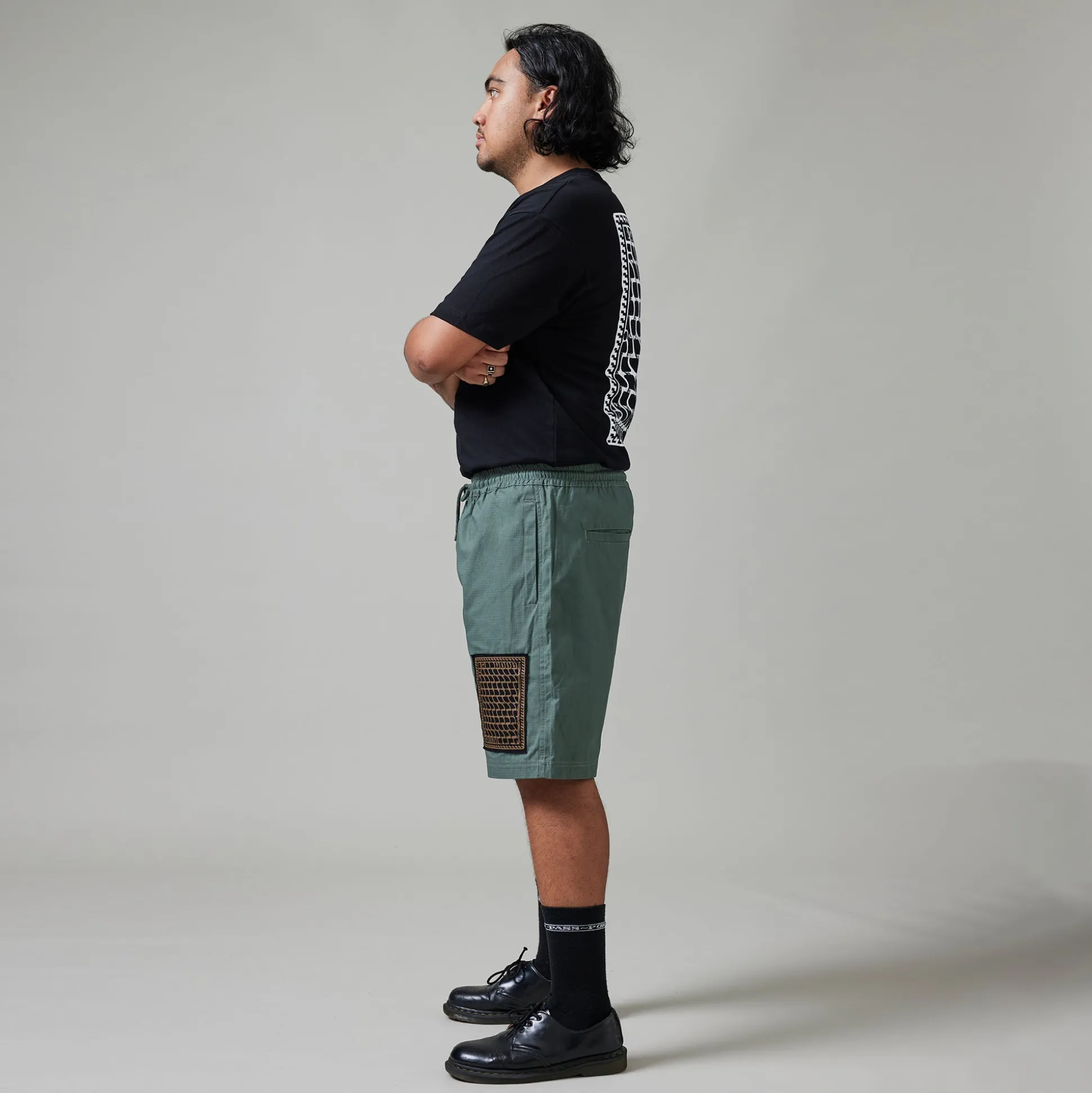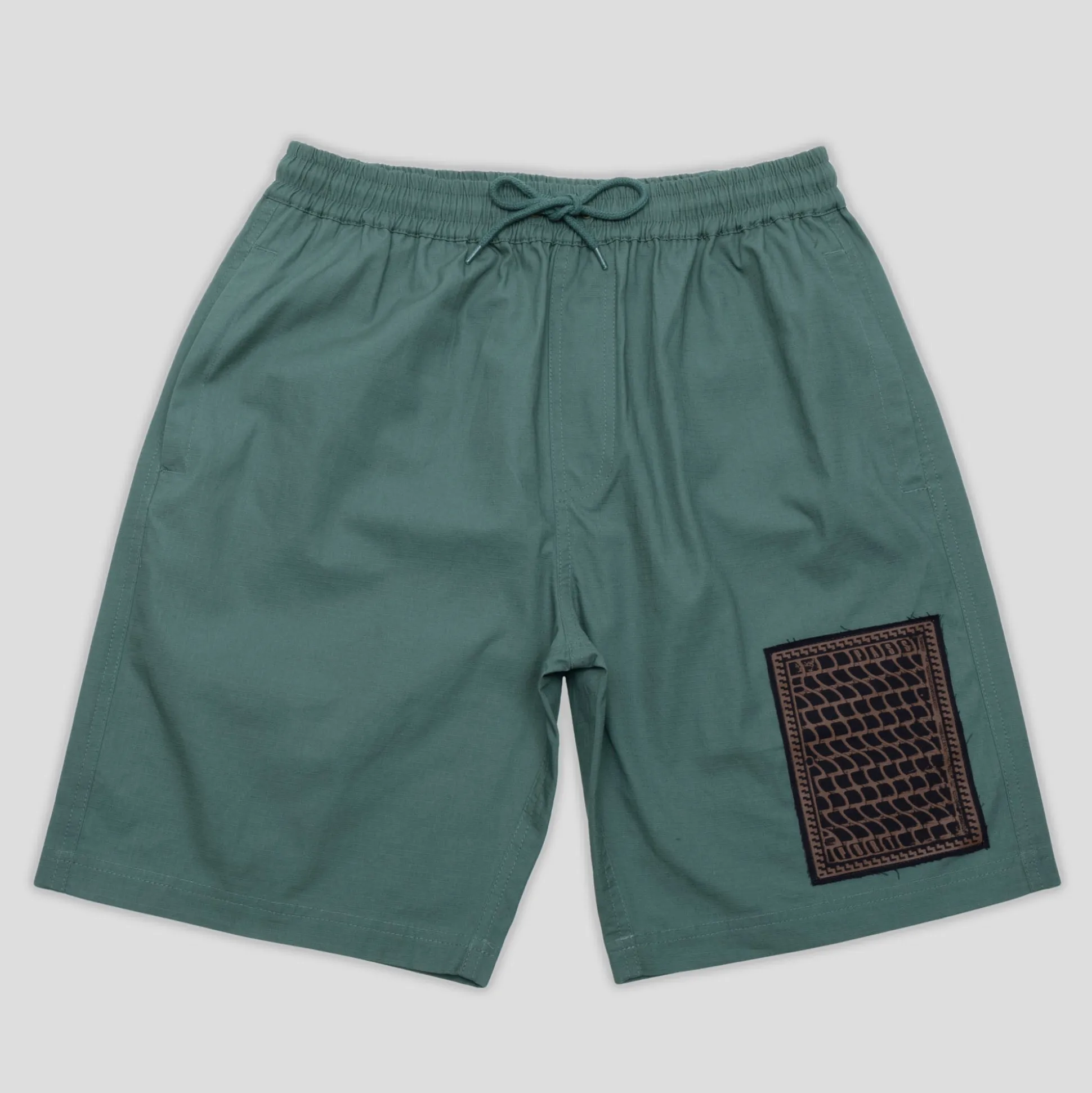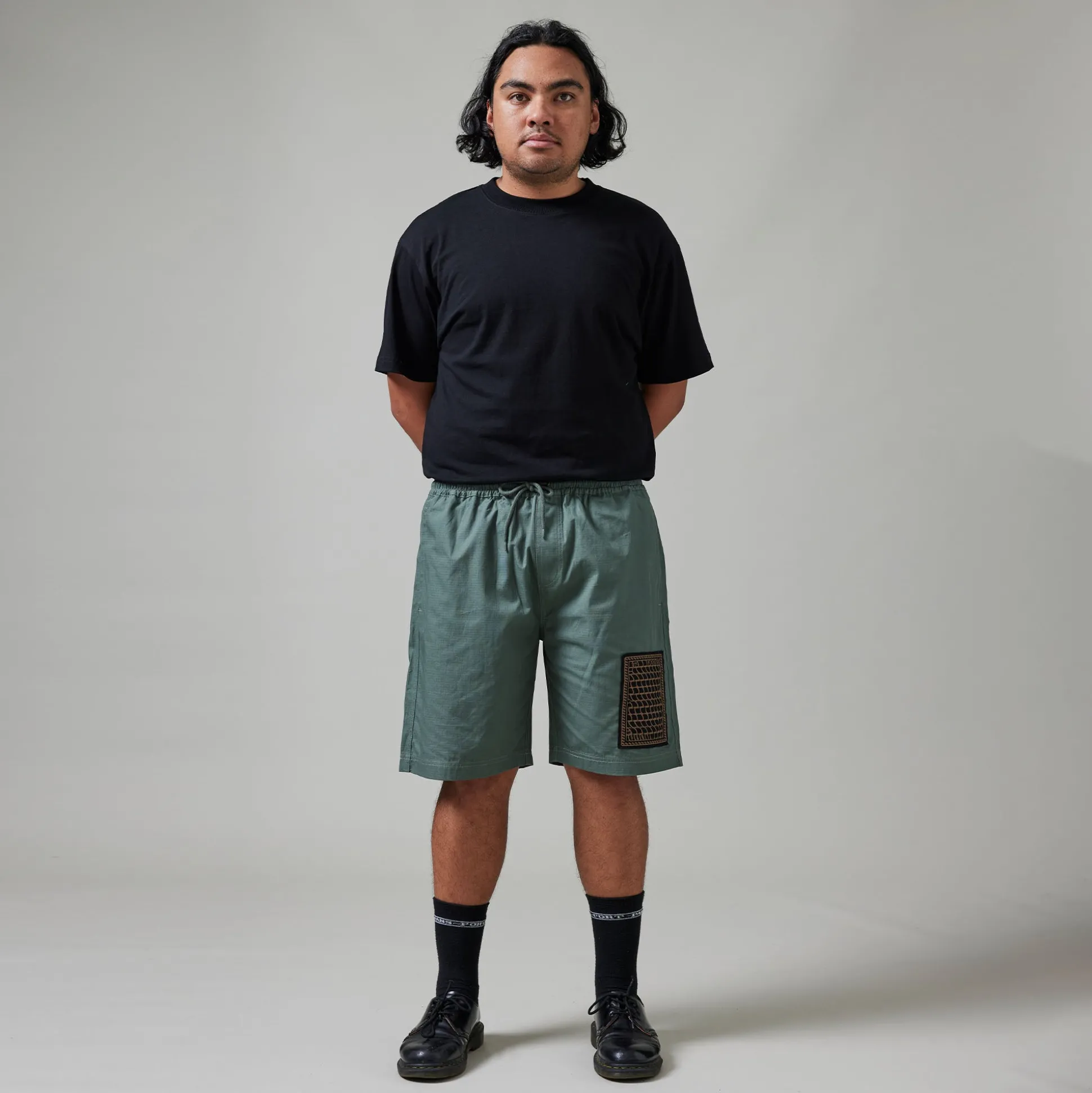 Pass~Port Drain Ripstop casual short in sage for range #40. The ripstop shorts are made from 100% cotton ripstop and feature sewn screen printed patch and draw string adjustment.