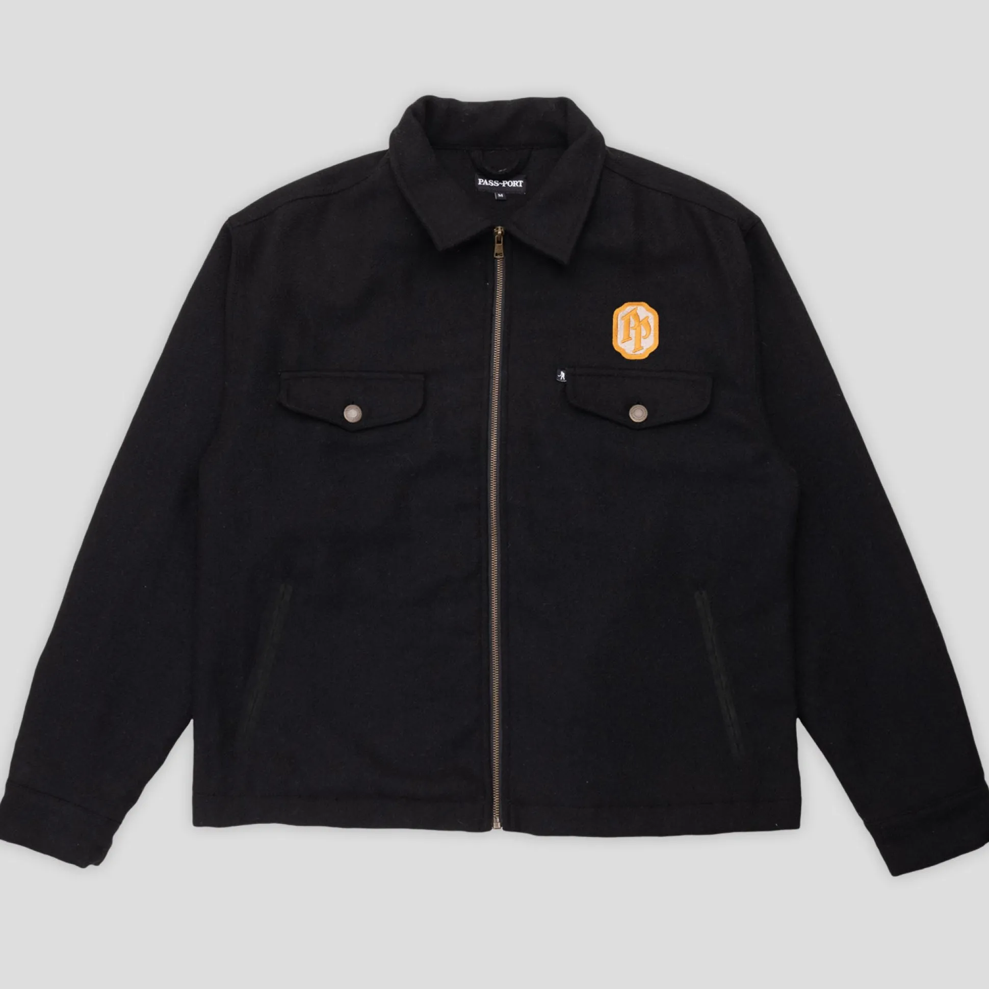 Pass~Port Emblematic Wool Zip Jacket from range #44. The Pass~Port casual workwear jacket is made from a wool and polyester blend and is lined with cotton poplin for warmth. The coat also features a direct embroidery detail above the breast pocket.