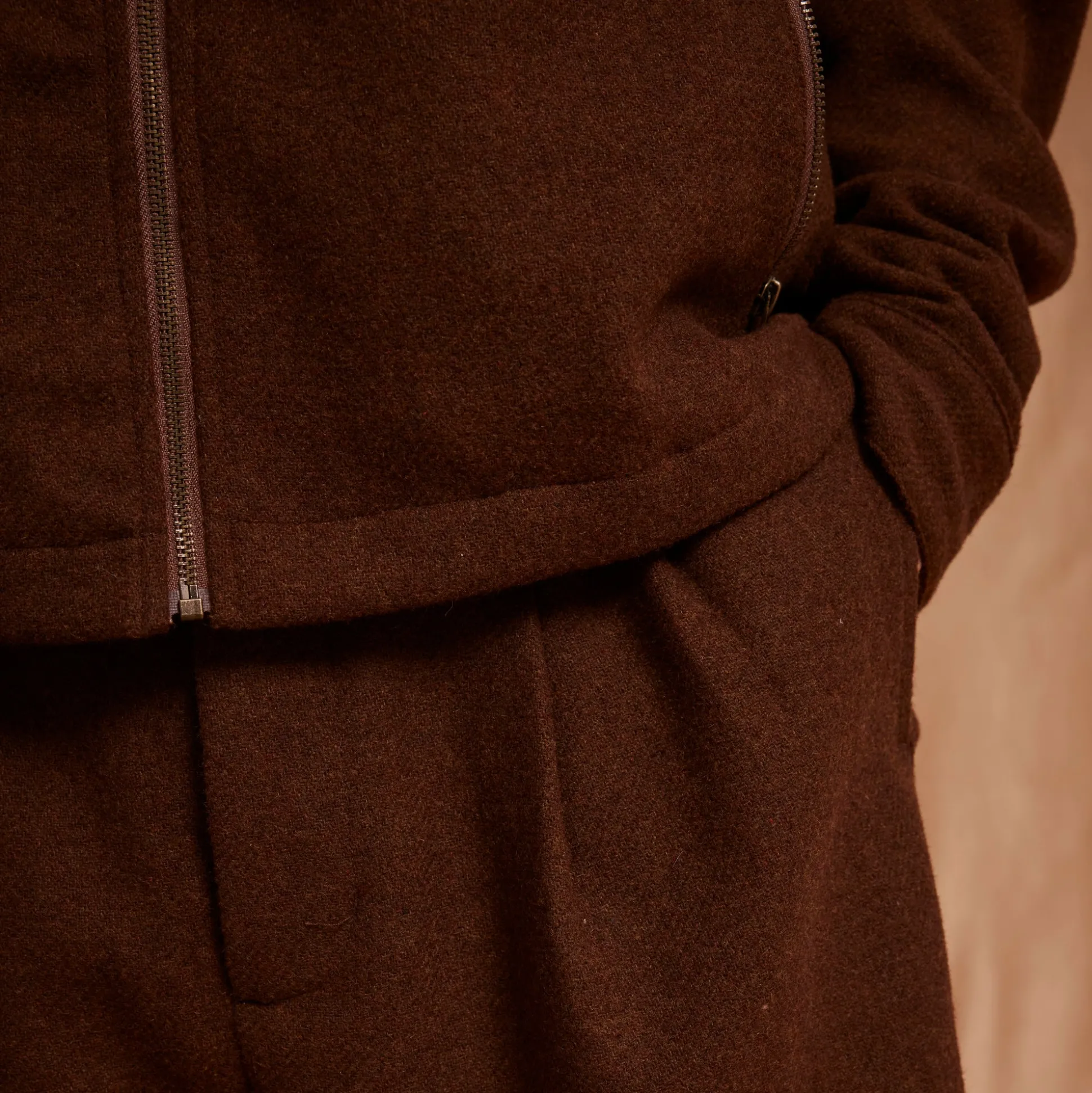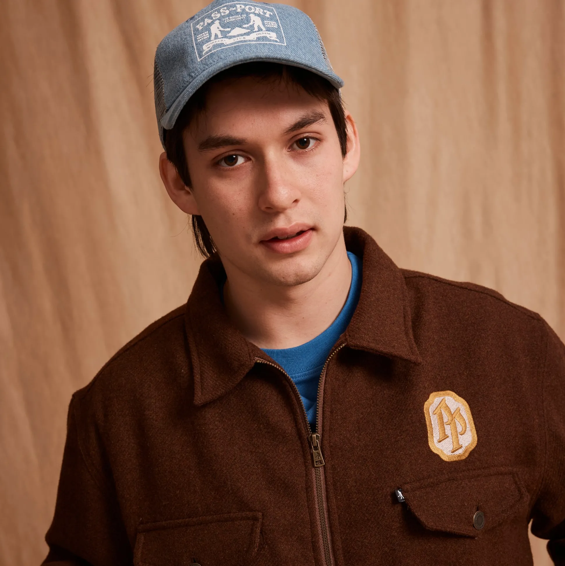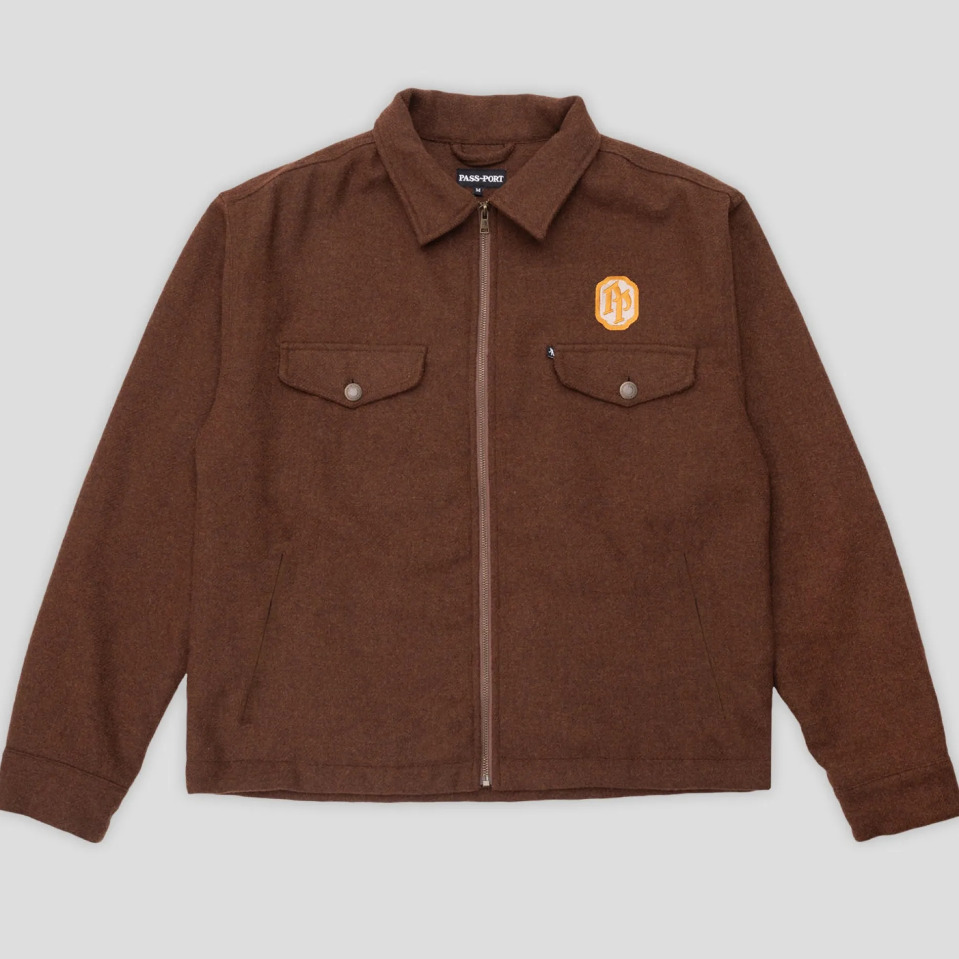 Pass~Port Emblematic Wool Zip Jacket from range #44. The Pass~Port casual workwear jacket is made from a wool and polyester blend and is lined with cotton poplin for warmth. The coat also features a direct embroidery detail above the breast pocket.