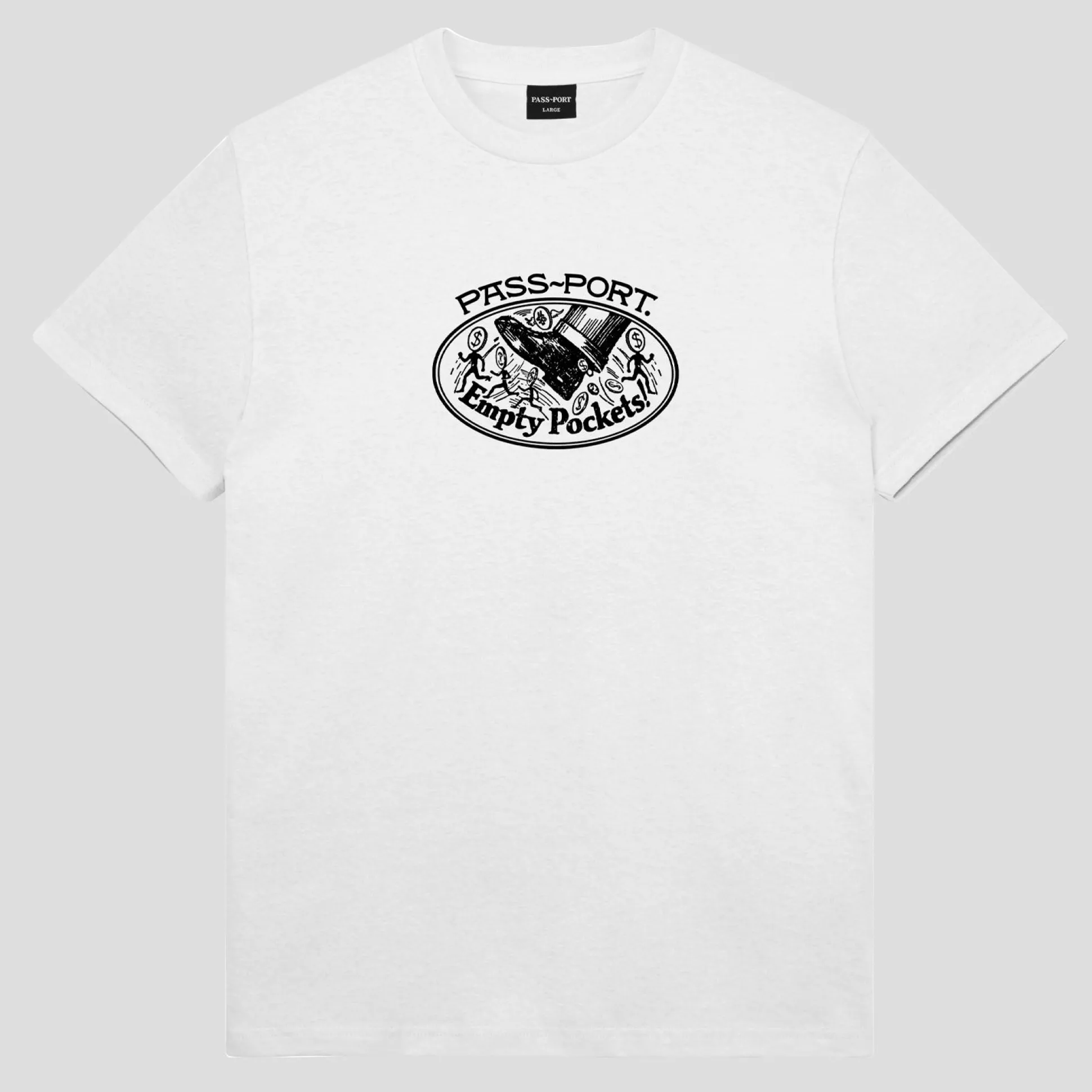 Pass~Port Empty Pockets Tee in white from range #42. The Pass~Port t-shirt is made from 100% cotton which features screen print on front and is finished in the classic Pass~Port tee fit.