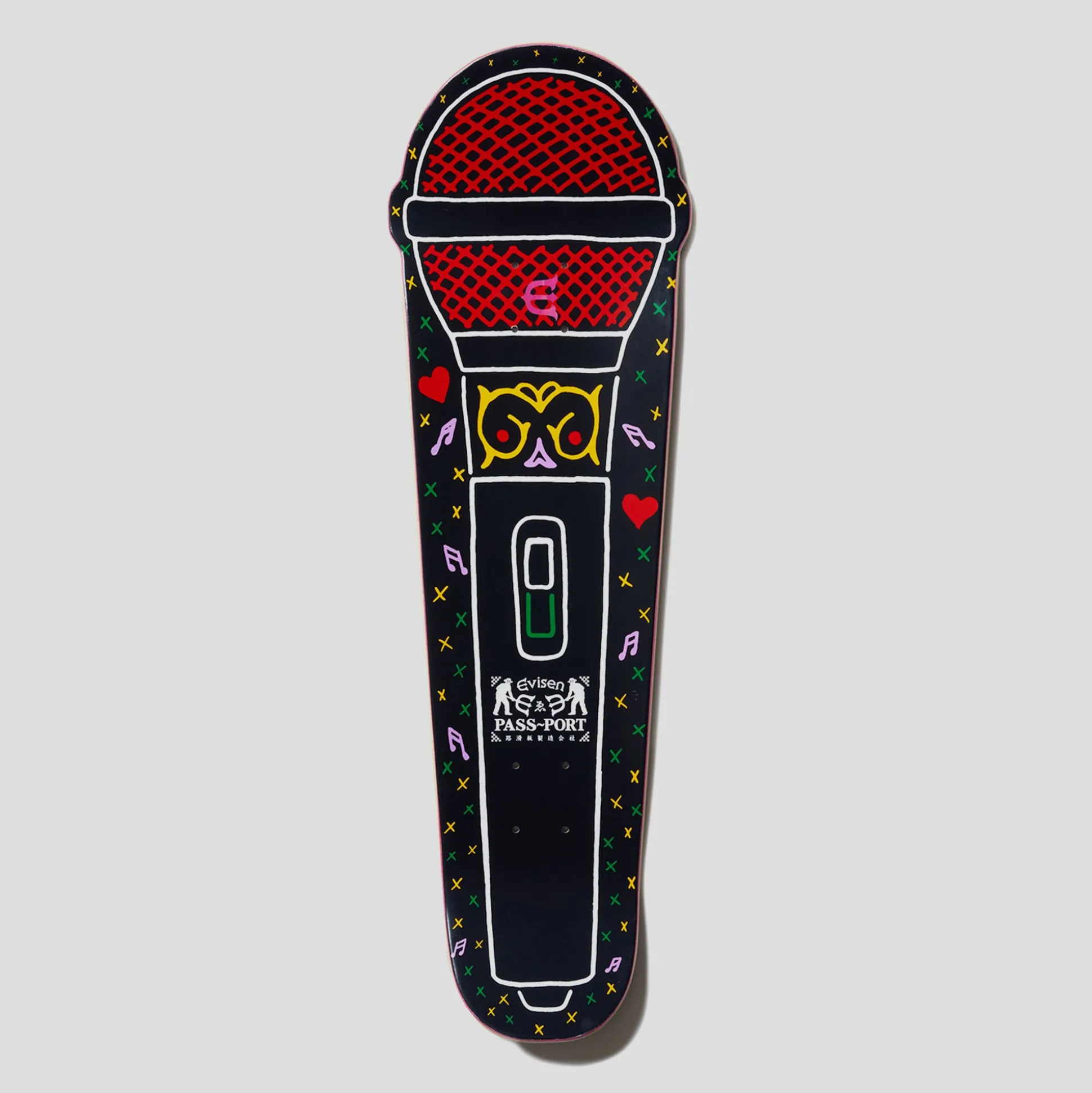 Up Where We Belong Deck deck from Pass~Port & Evisen is a 10″ deck in a microphone shape deck. The artwork on this skate deck is on collaboration with Australian artist Marcus Dixon.
