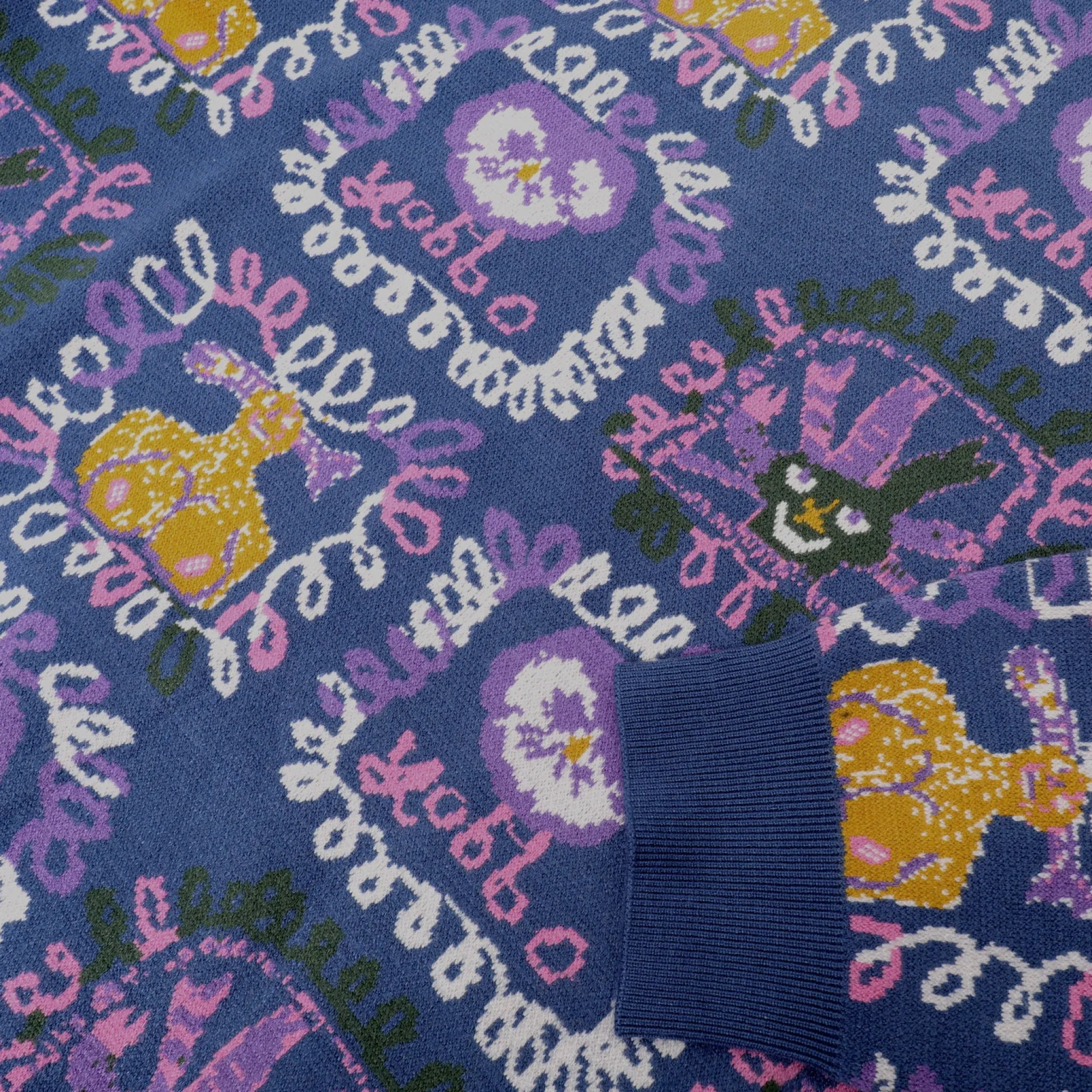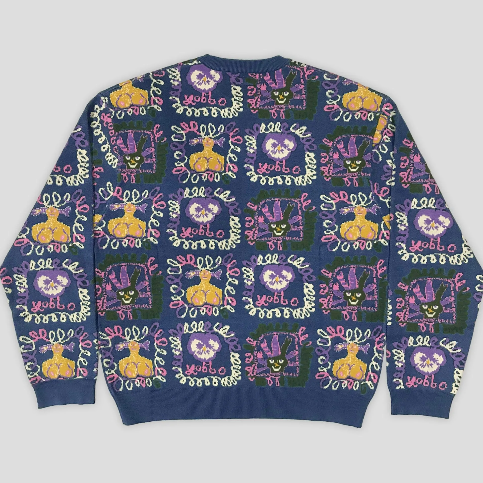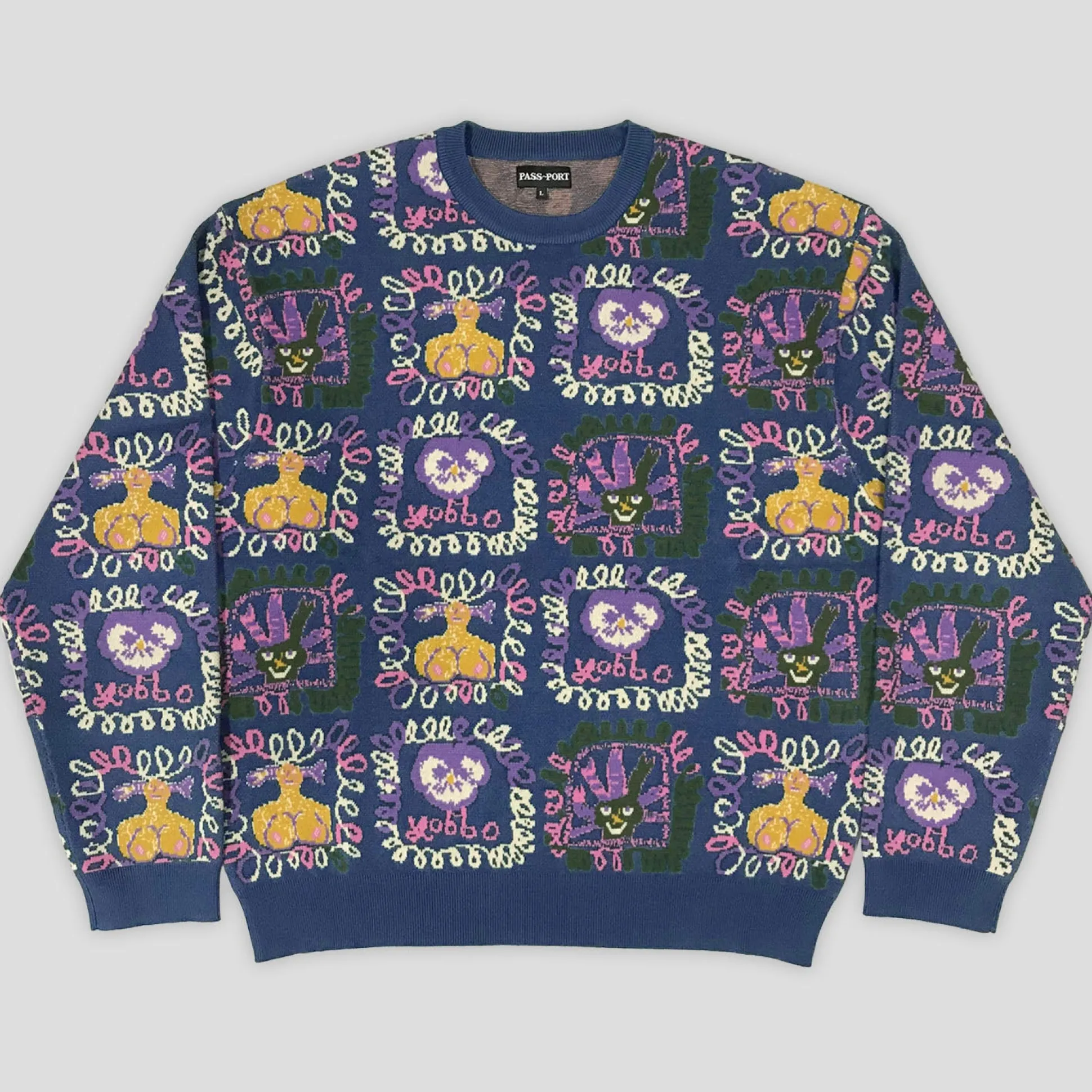 Pass~Port Faces Knit sweater from range #43. The Pass~Port Knit sweater is made from 100% acrylic and features cuffed sleeves and bottom. The crewneck also features a jacquard pattern on front and back by artist Molly Turner.