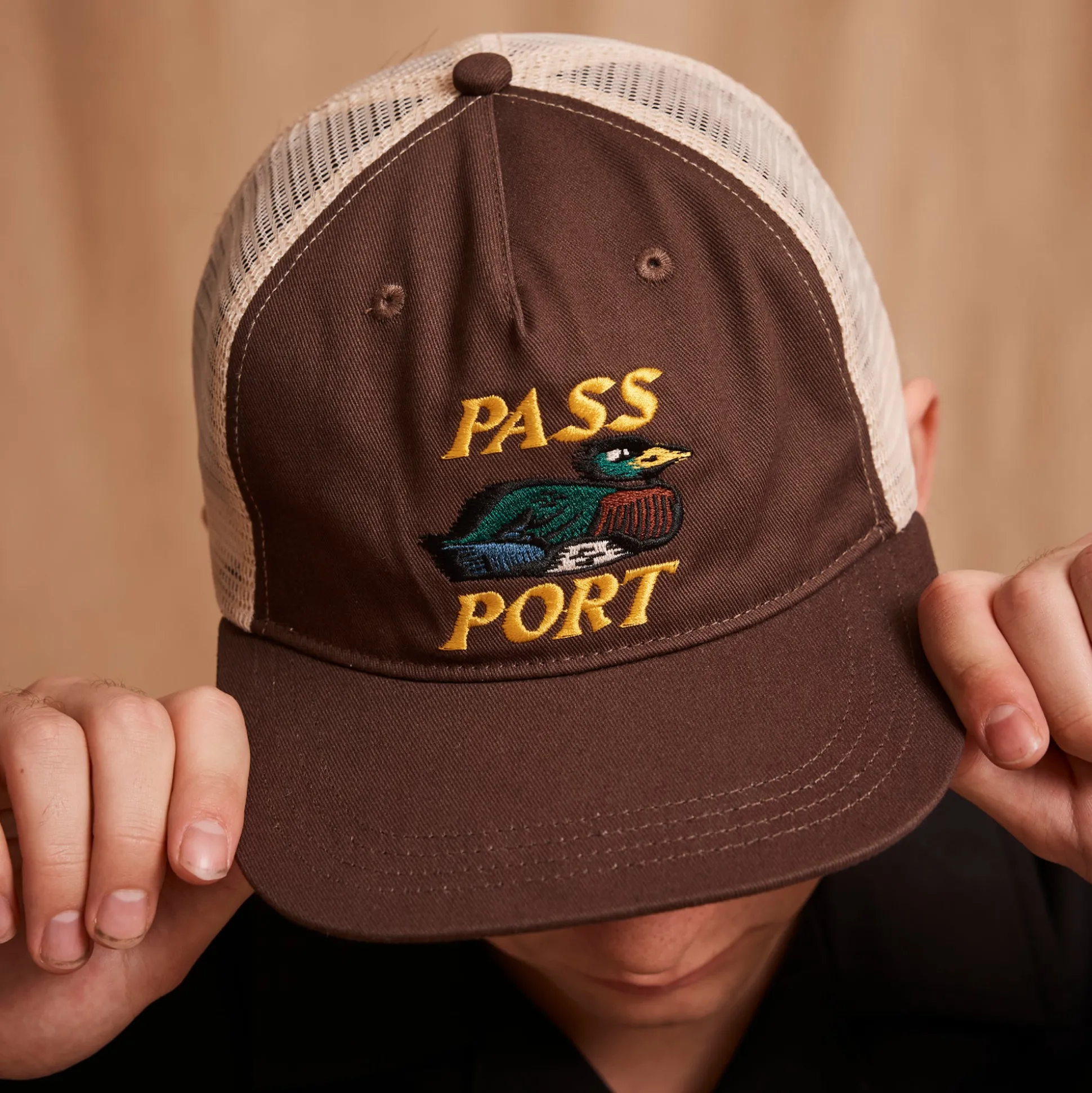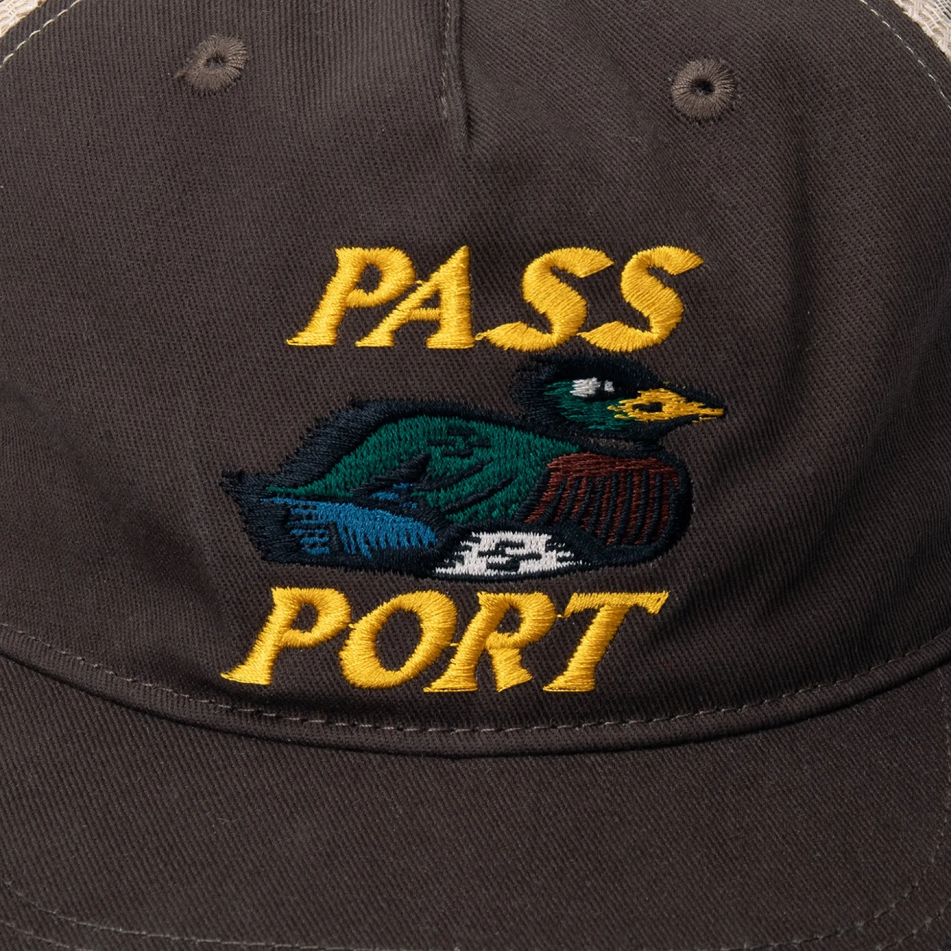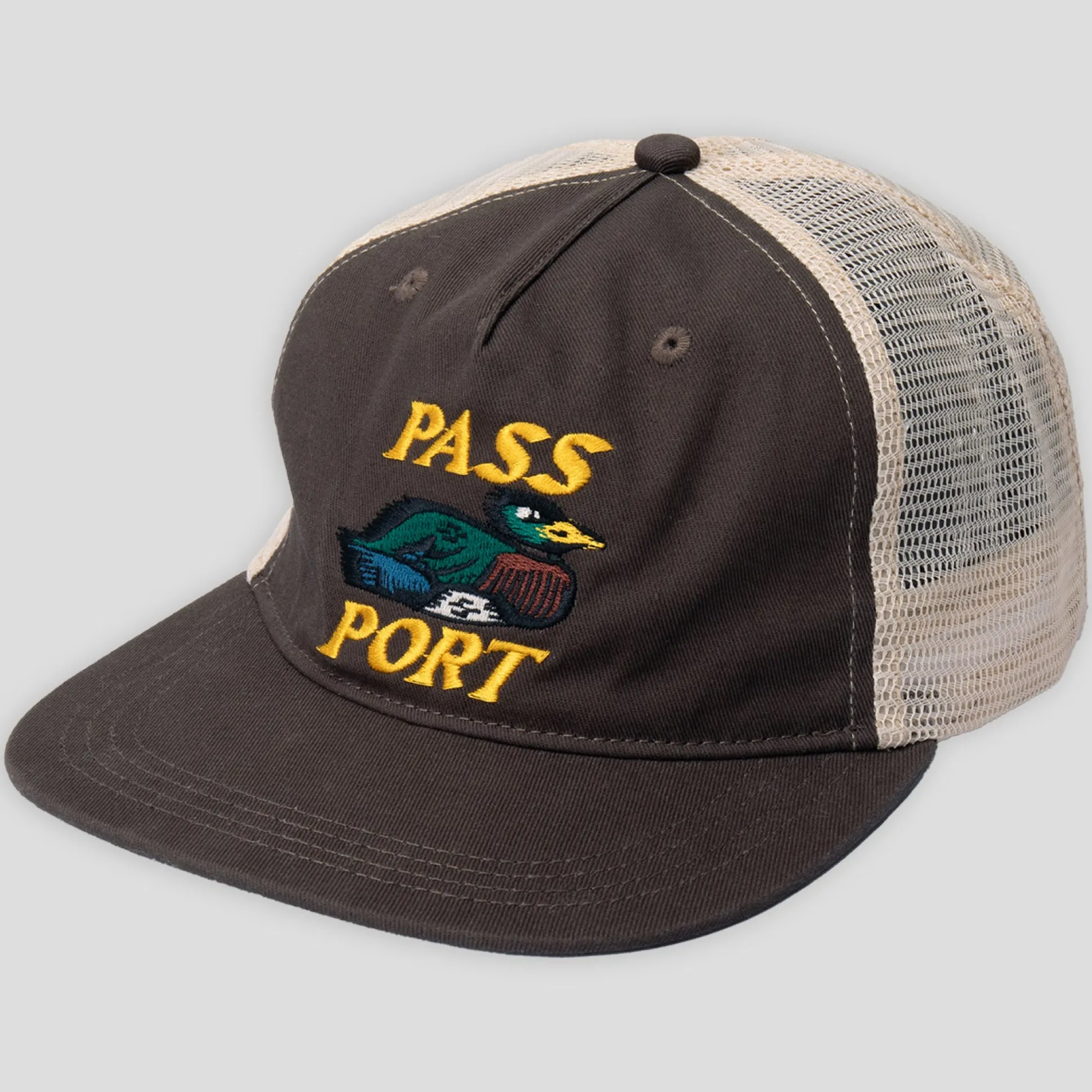 Pass~Port Fast Duck Workers trucker hat from range #44. The Pass~Port cap is made from heavy cotton twill and recycled polyester mesh backing. This trucker cap features adjustable strapback with brass buckle and has direct embroidery on front.