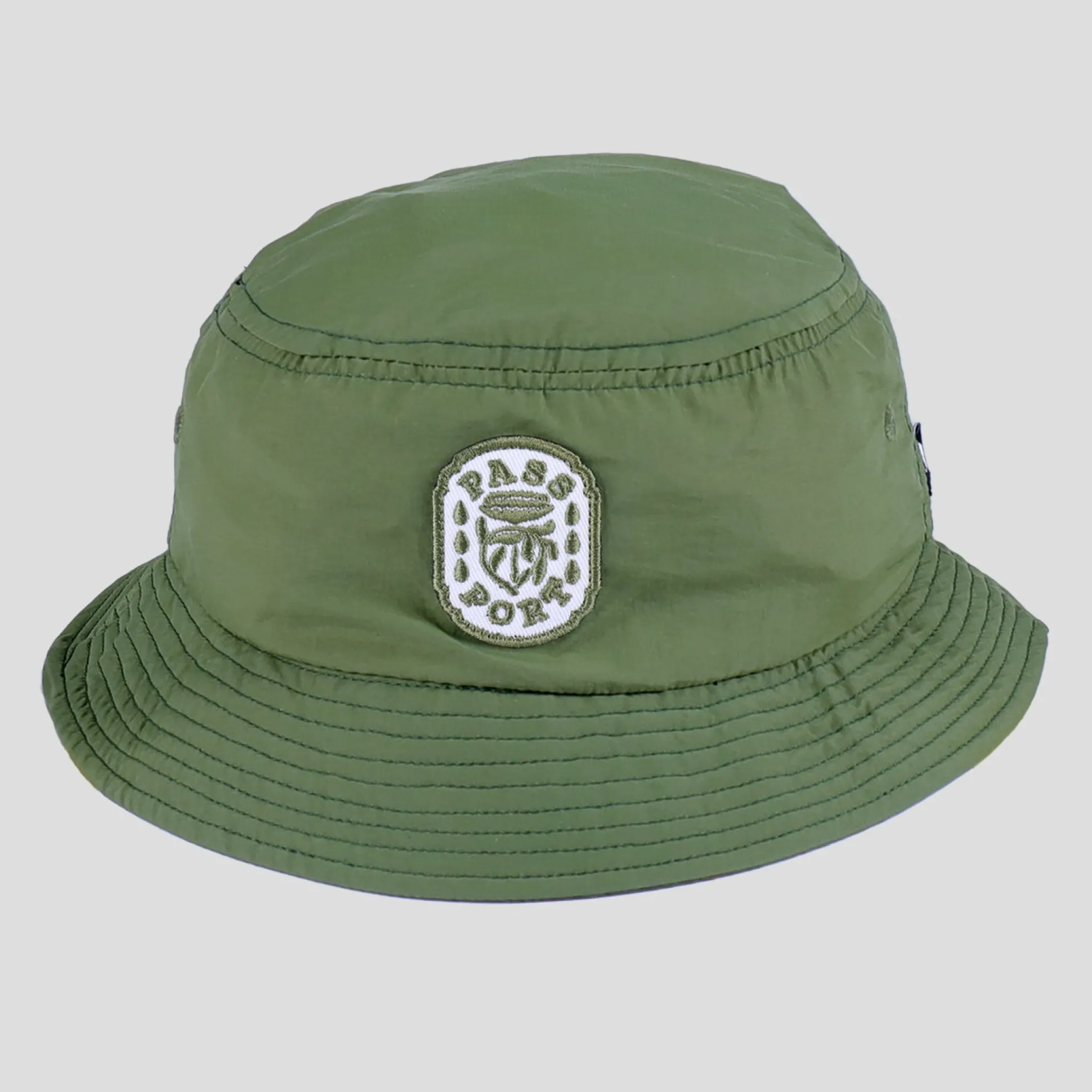 Pass~Port Fountain RPET bucket hat in olive from range #39. Pass~Port RPET program, made from 100% recycled water bottles (RPET polyester) with direct embroidery patch on front.