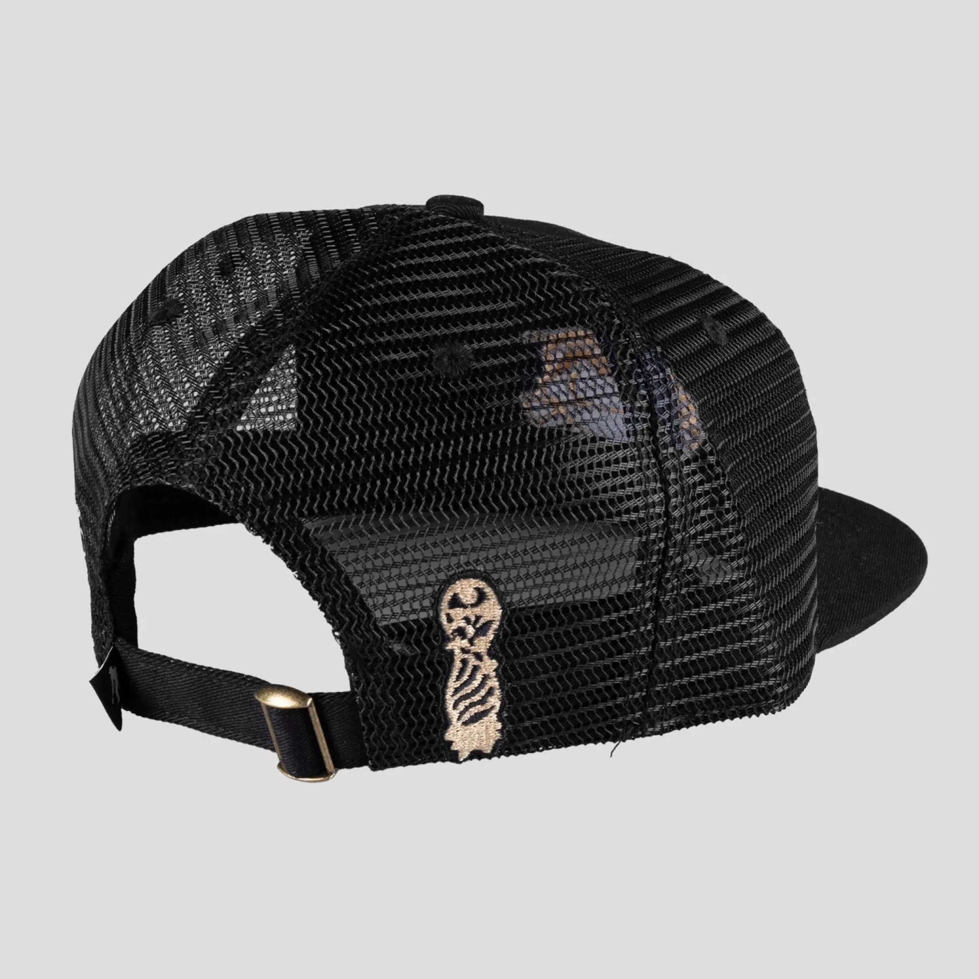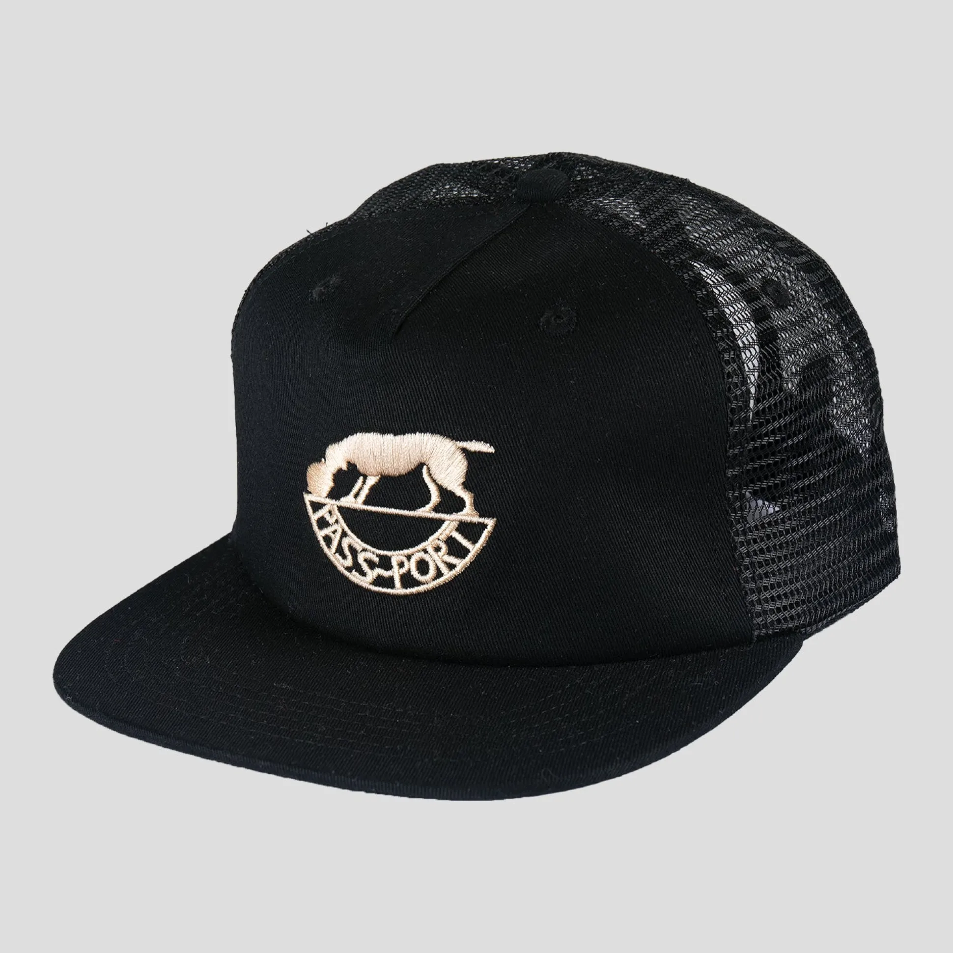 Pass~Port Fretworks Workers trucker hat from range #43. The Pass~Port cap is made from canvas twill and recycled poly mesh backing. This trucker cap features strap sizing adjustment and has embroidery on front and back.