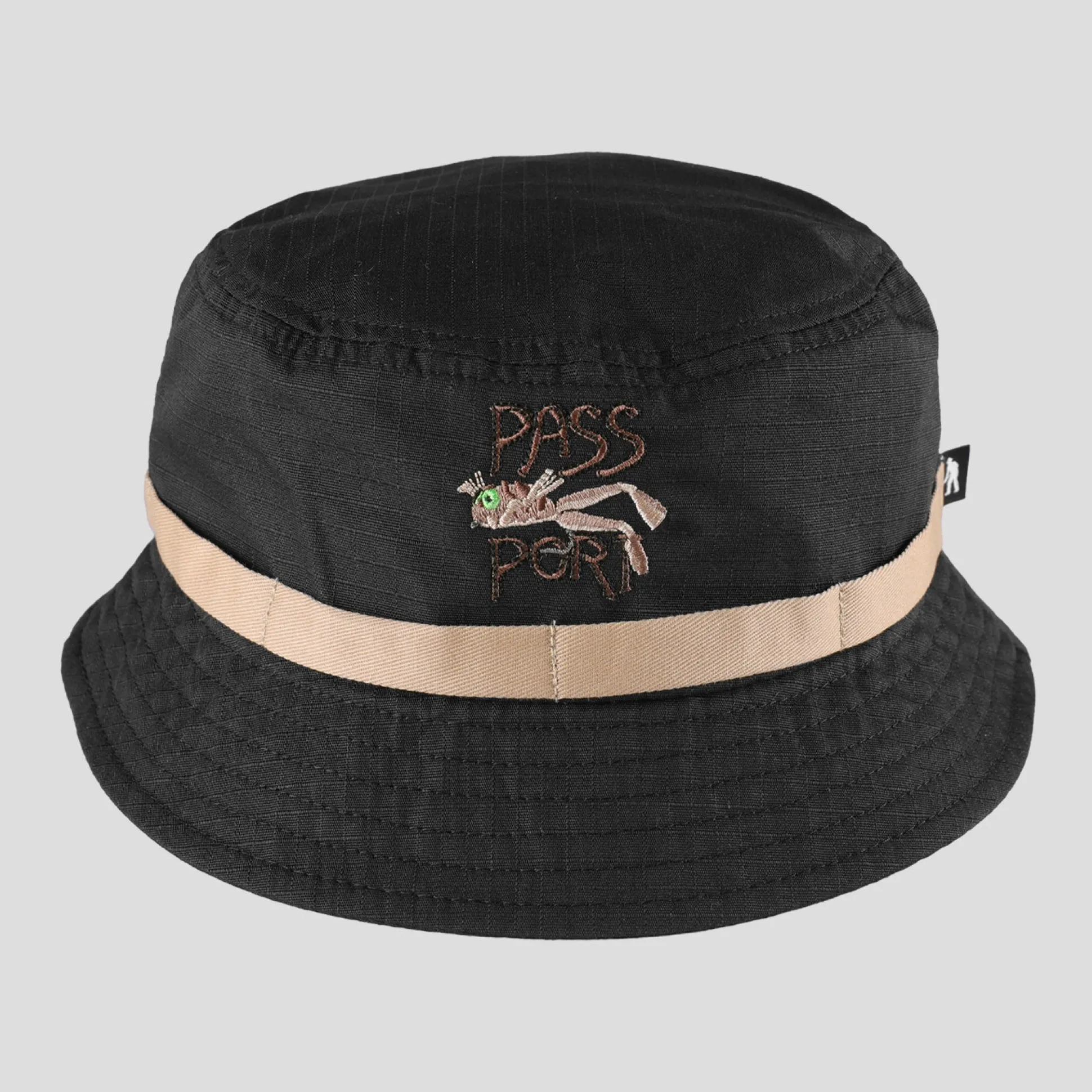 Pass~Port Frog Lure bucket hat from range #43. The Pass~Port bucket hat is made from 100% ripstop cotton canvas. The wide brim hat features direct embroidery on front and lure strap to hang your fishing lures.
