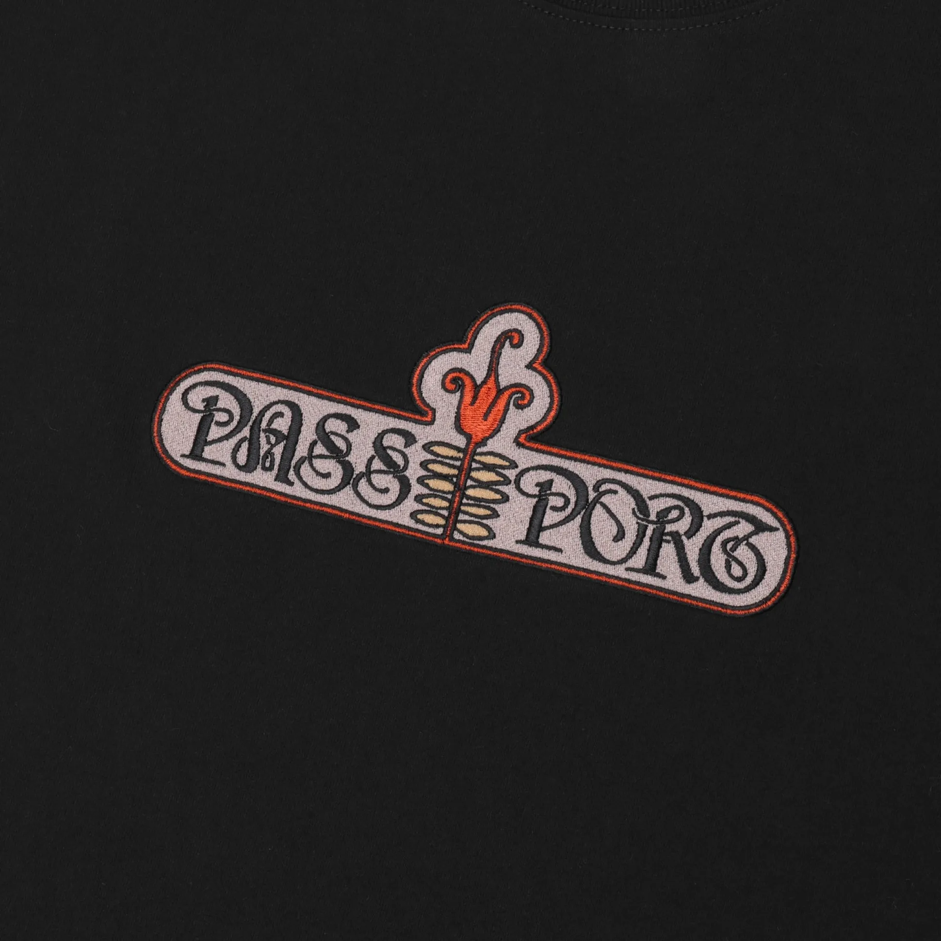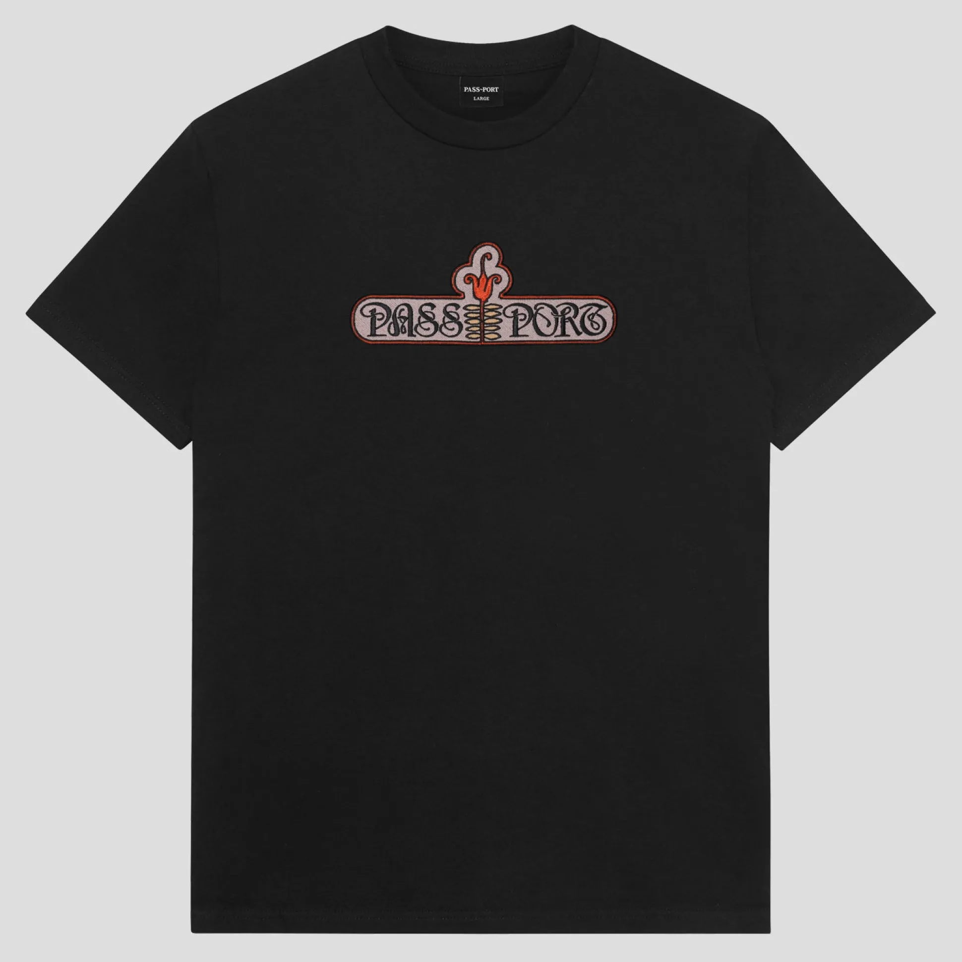 Introducing Range #44: The Pass-Port Gardenia Tee in black is made from 100% cotton and features a directly embroidered graphic on the front. It offers the signature Pass-Port fit.