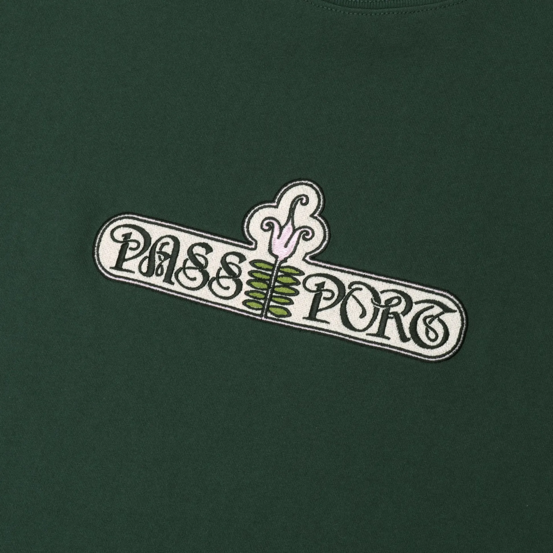 Introducing Range #44: The Pass-Port Gardenia Tee in forest green is made from 100% cotton and features a directly embroidered graphic on the front. It offers the signature Pass-Port fit.