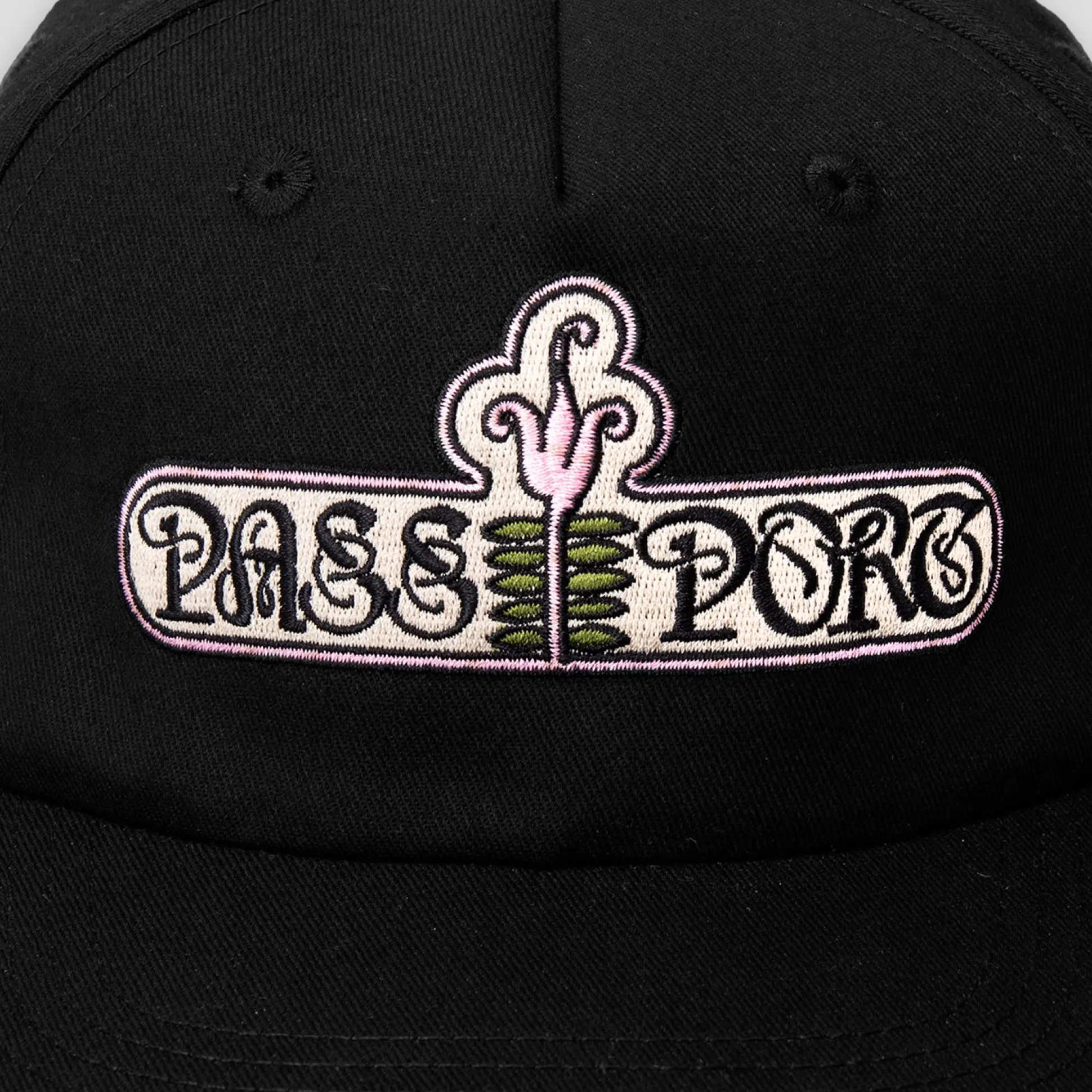 Pass~Port Gardenia workers cap from range #44. The Pass~Port workers cap is a 5 panel construction made from 100% heavy cotton twill and features direct embroidery detailing with adjustable strapback with brass buckle.