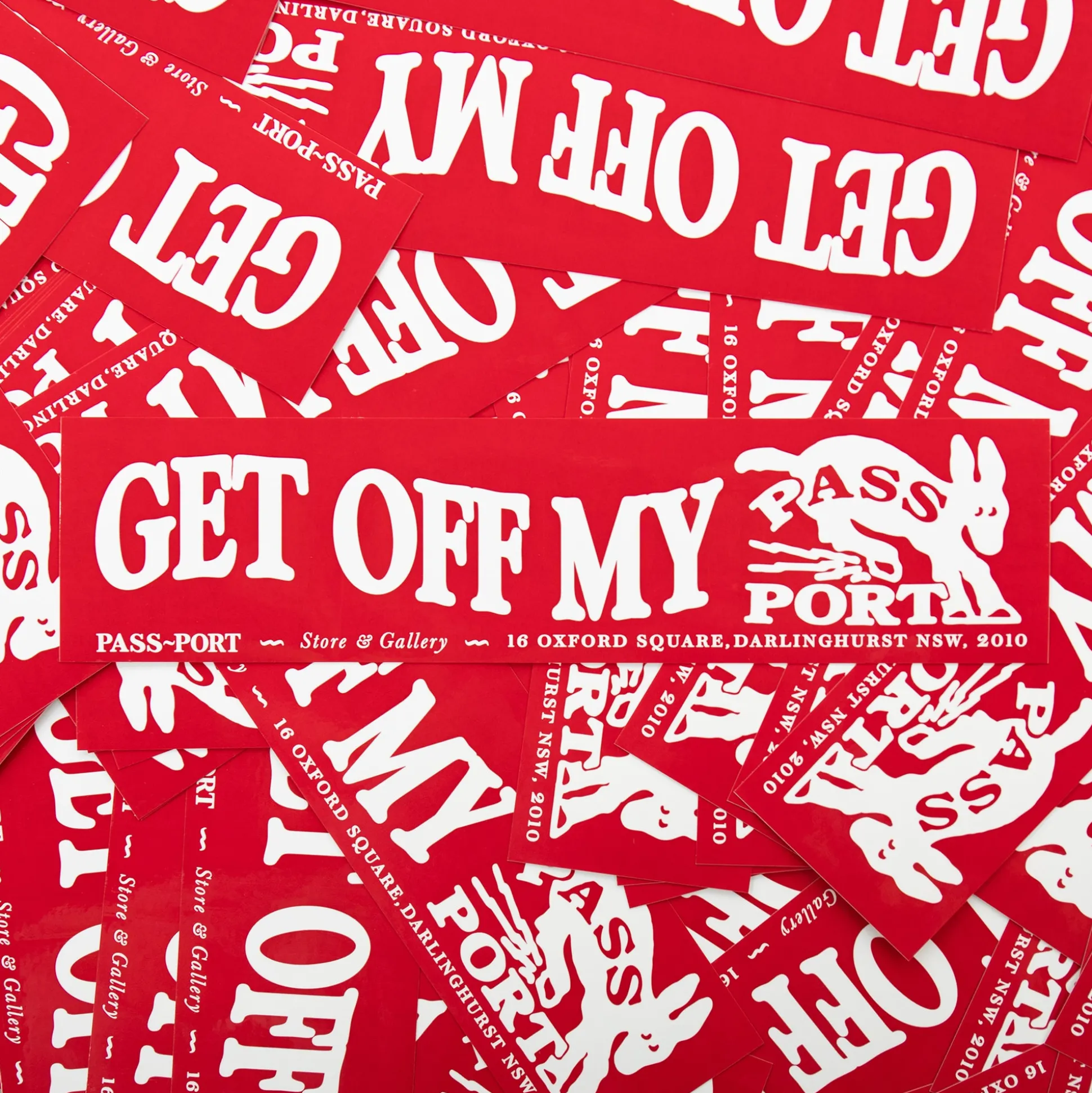 Pass~Port Store & Gallery’s ‘Get Off My Ass’ bumper sticker. A classic sticker for any form of transport, featured in red and white vinyl that will let people know on the roads.