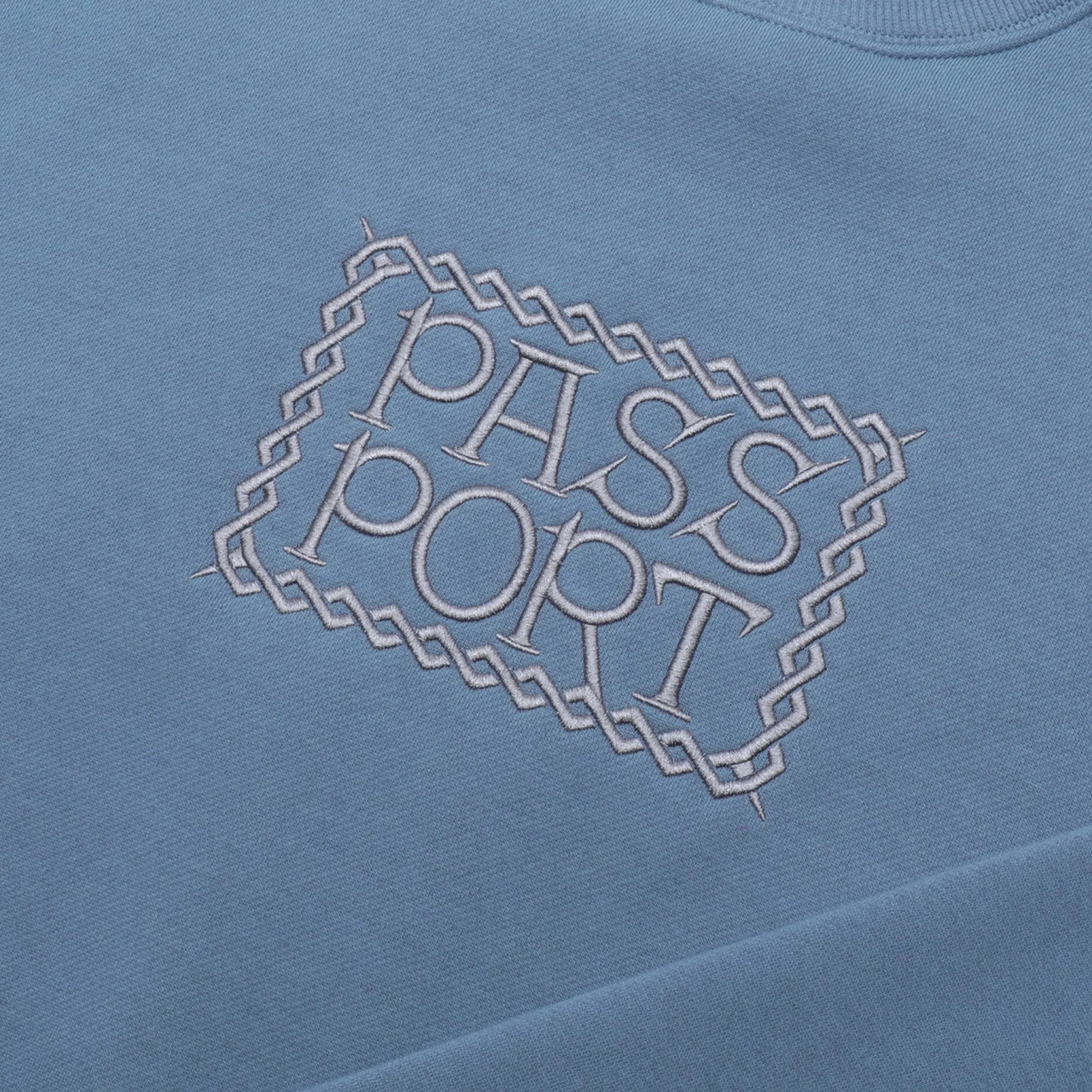 Pass~Port Invasive Embroidered crewneck in washed out blue is apart of the fleece collection for range #40. The Invasive Pass~Port jumper is made from a cotton polyester blend and features embroidery on front in the classic Pass~Port sweater fit.