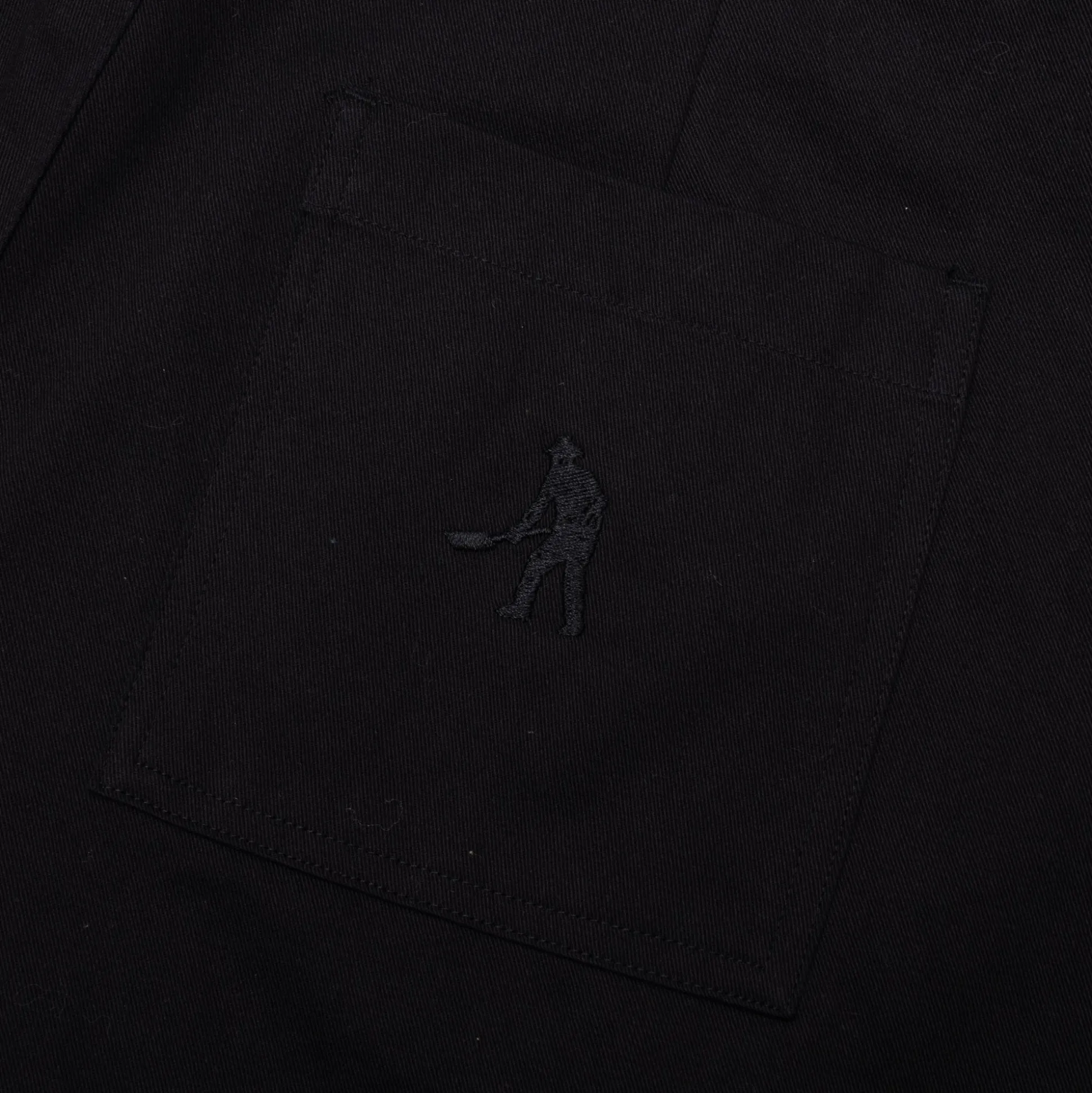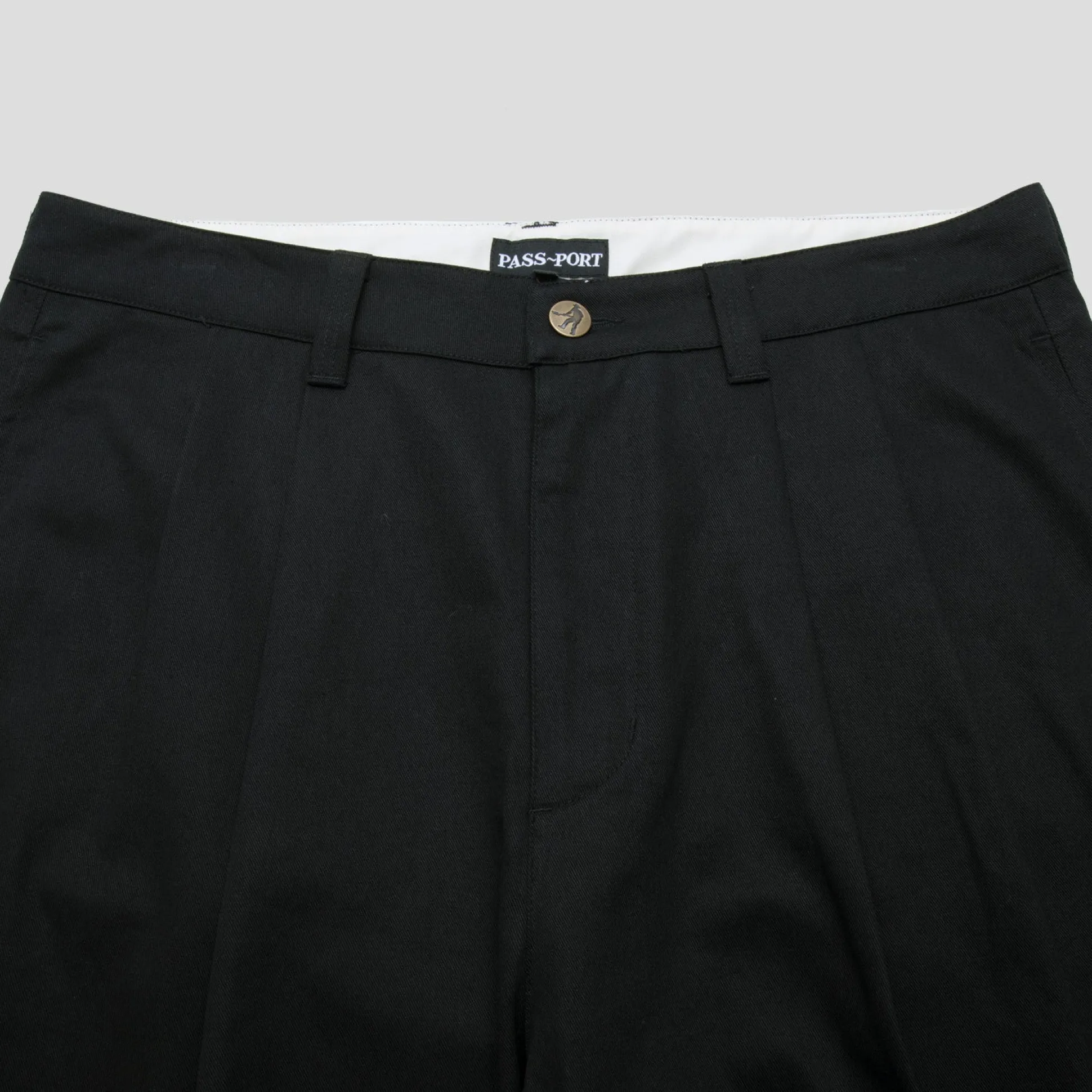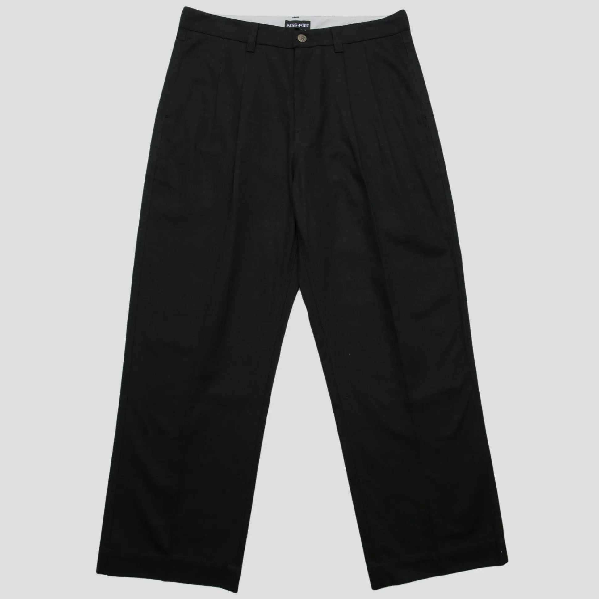 Pass~Port Leagues Club pant in black from range #39. Made from 100% cotton twill and features double pleats with stitched Leagues Club patch on back. The trouser also has signature digger embroidery on back pocket.