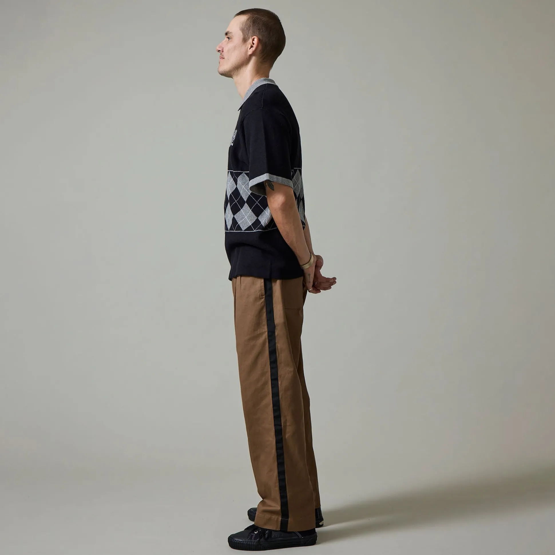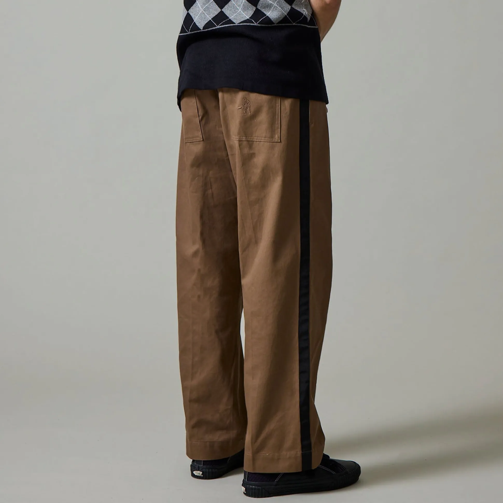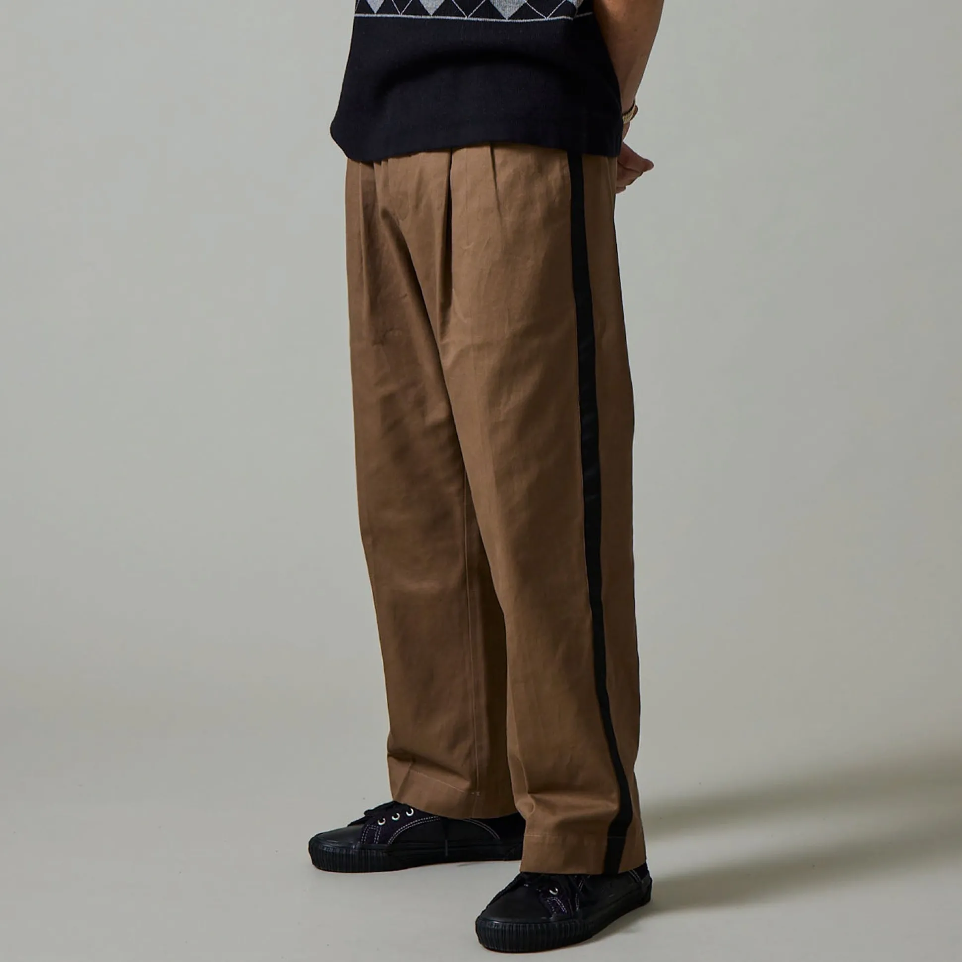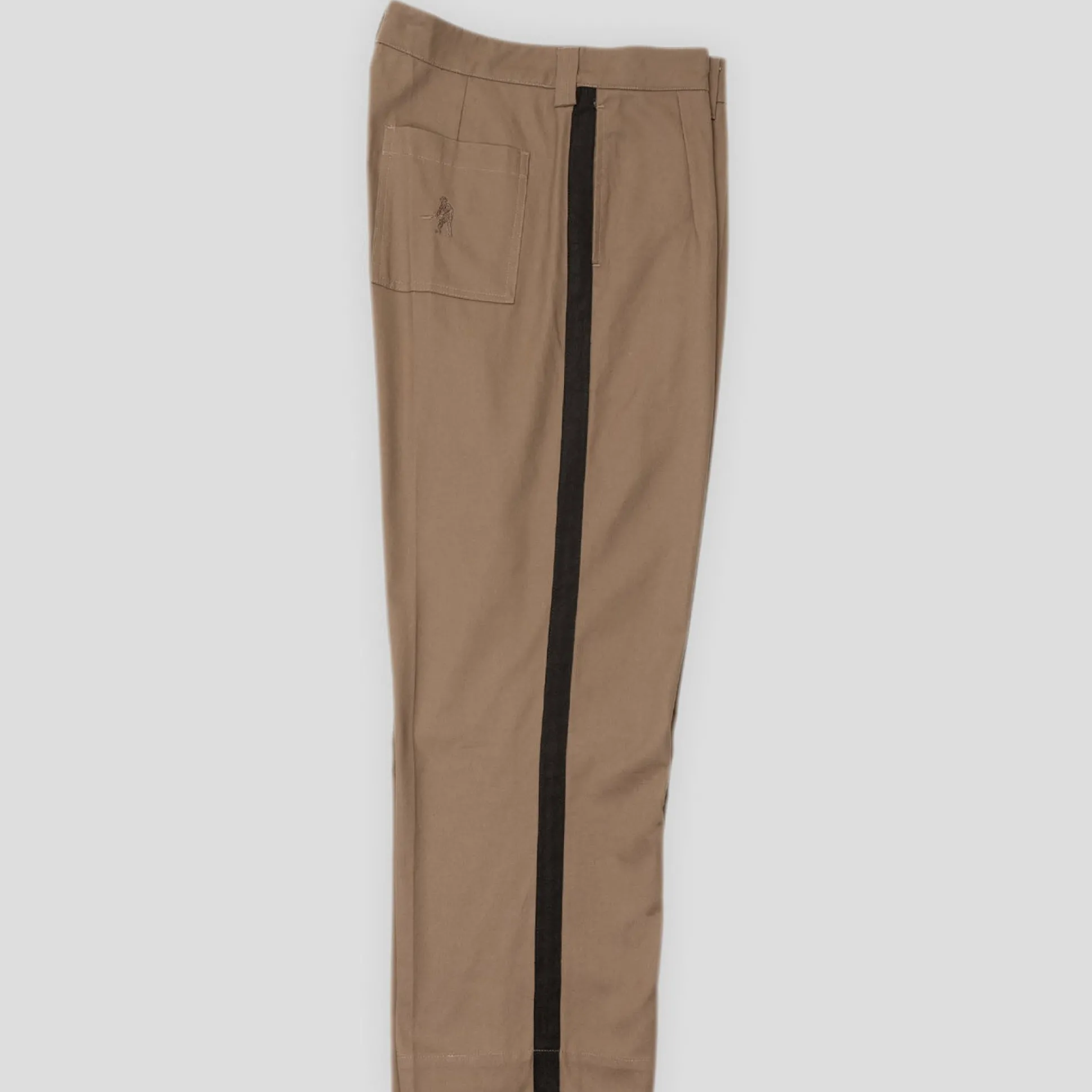 Pass~Port Leagues Club striped pant in taupe / black from range #42. The Leagues club trouser is made from 100% cotton twill and features double pleats and custom button. The striped trouser introduces a new detail with contrast stripe down each side.