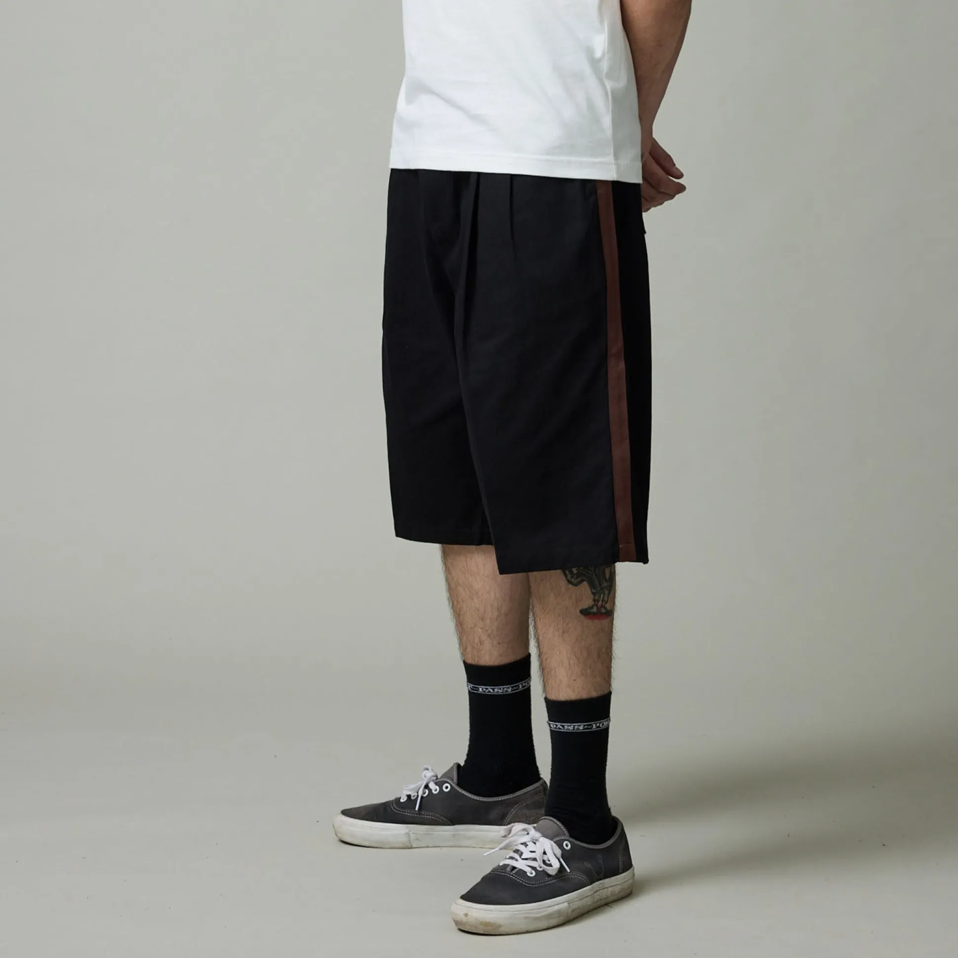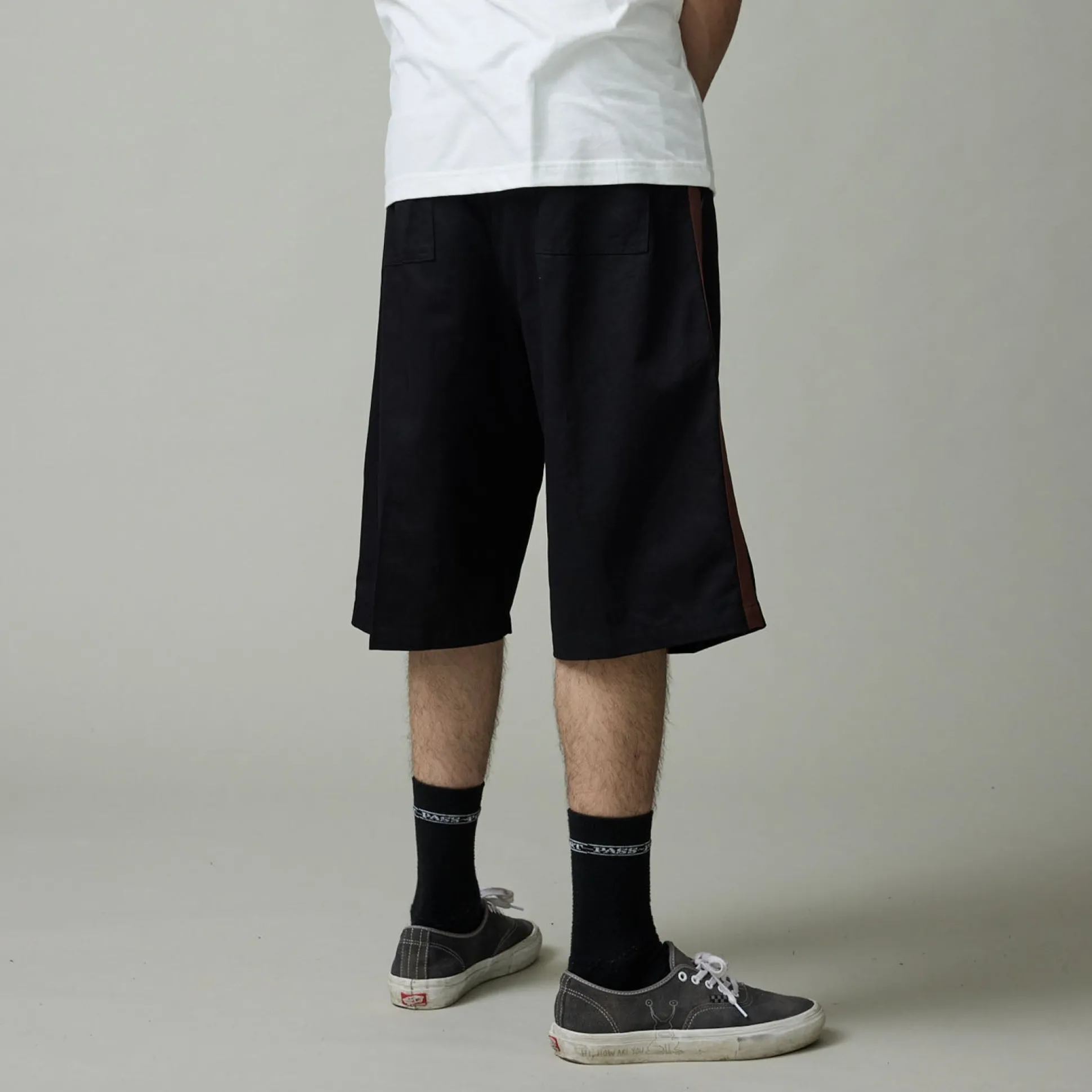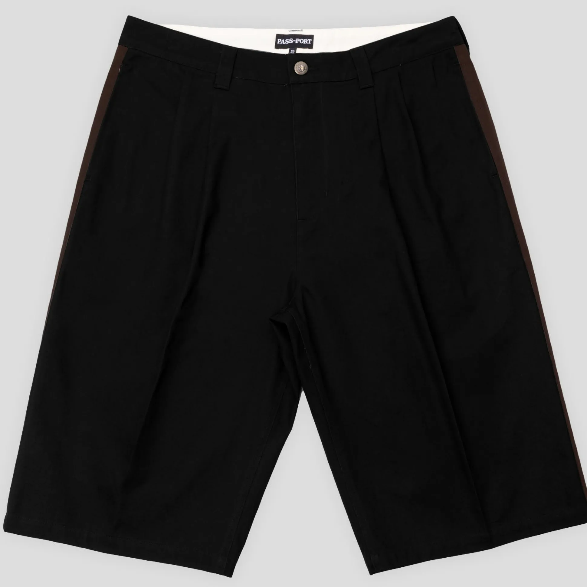 Pass~Port Leagues Club short in black / brown from range #42. This short is made from 100% cotton twill and features double pleats with contrast side stripe down the leg