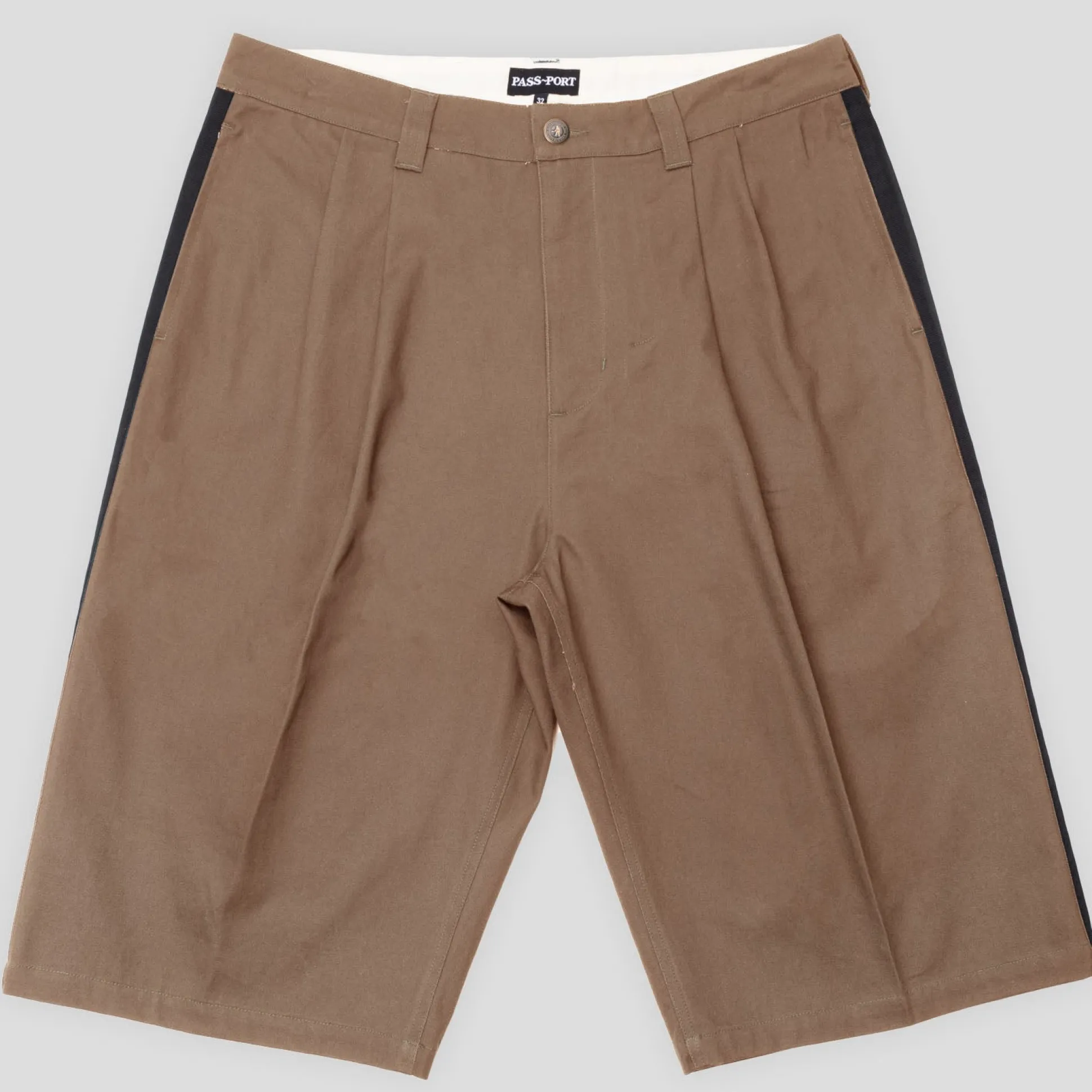 Pass~Port Leagues Club short in taupe / black from range #42. This short is made from 100% cotton twill and features double pleats with contrast side stripe down the leg.