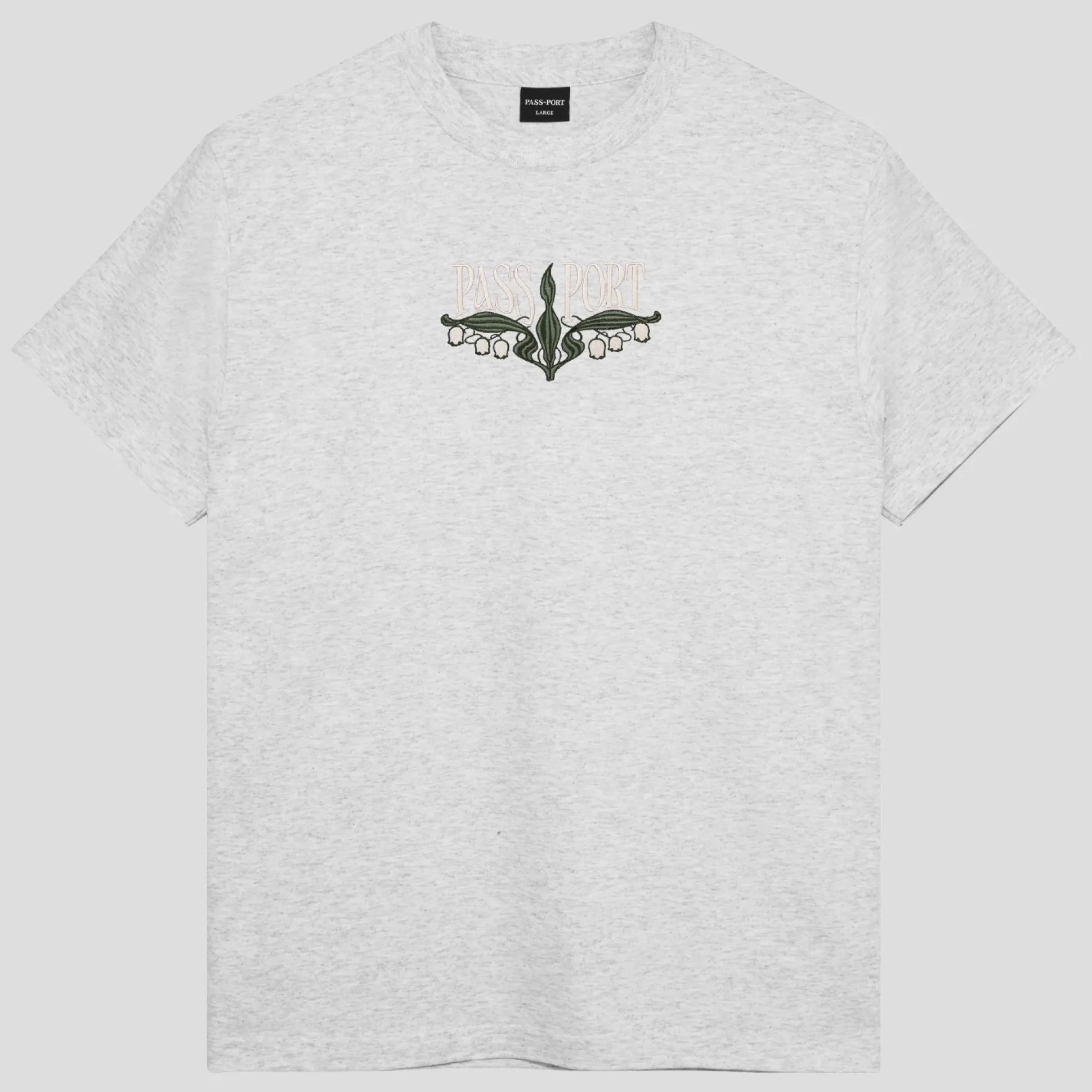 Pass~Port Lily of The Valley Tee. The Pass~Port t-shirt is made from 100% cotton and features embroidery on front. The Pass~Port T-shirt is finished in the classic Pass~Port tee fit.