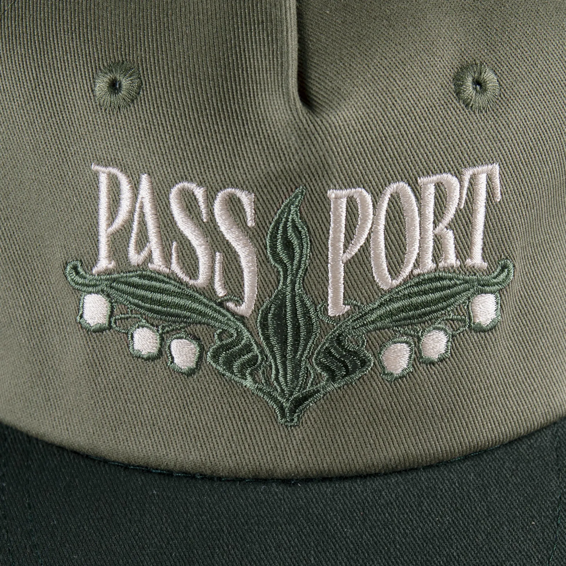 Pass~Port Lily of the Valley workers cap from range #43. The Pass~Port hat is a 5 panel construction made from 100% cotton twill and features direct embroidery with strap back adjustment.