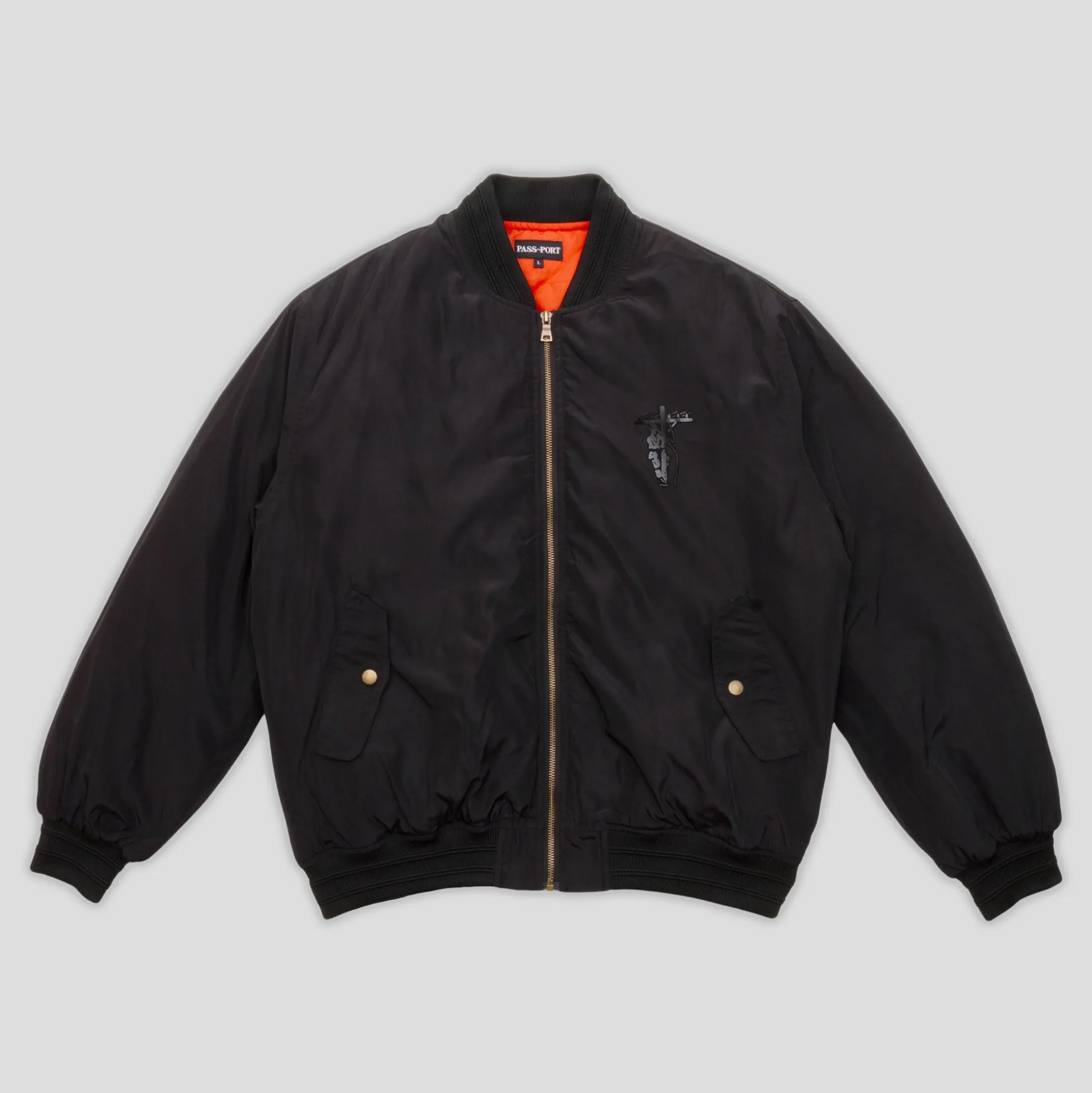 Pass~Port Line~Worx freight jacket in black is apart of the cut and sew for range #40. The bomber jacket is made from 100% heavy nylon with cotton poplin lining. The jacket features reflective screen printed front and back graphic.