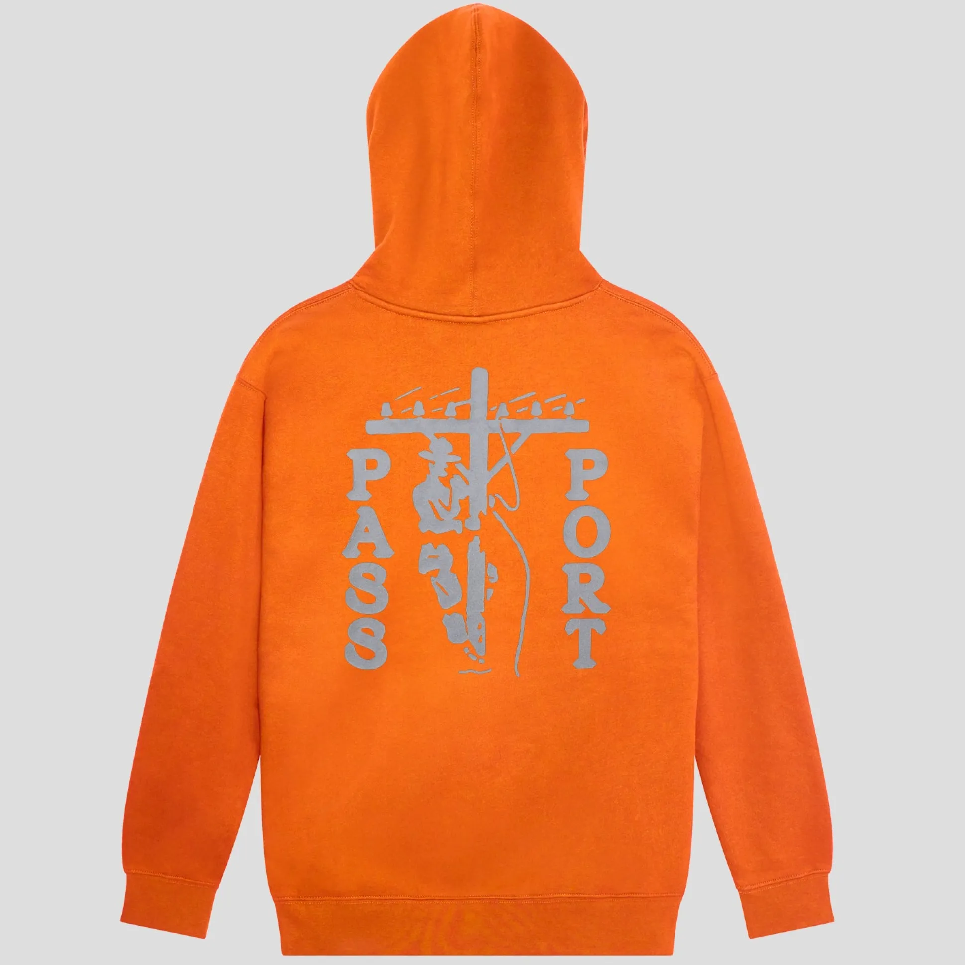 Pass~Port Line~Worx Hoodie in safety orange is apart of the fleece collection for range #40. The Line~Worx Pass~Port jumper is made from a cotton polyester blend and features reflective screen printed graphic on front and back and is finished in the classic Pass~Port hoodie fit.