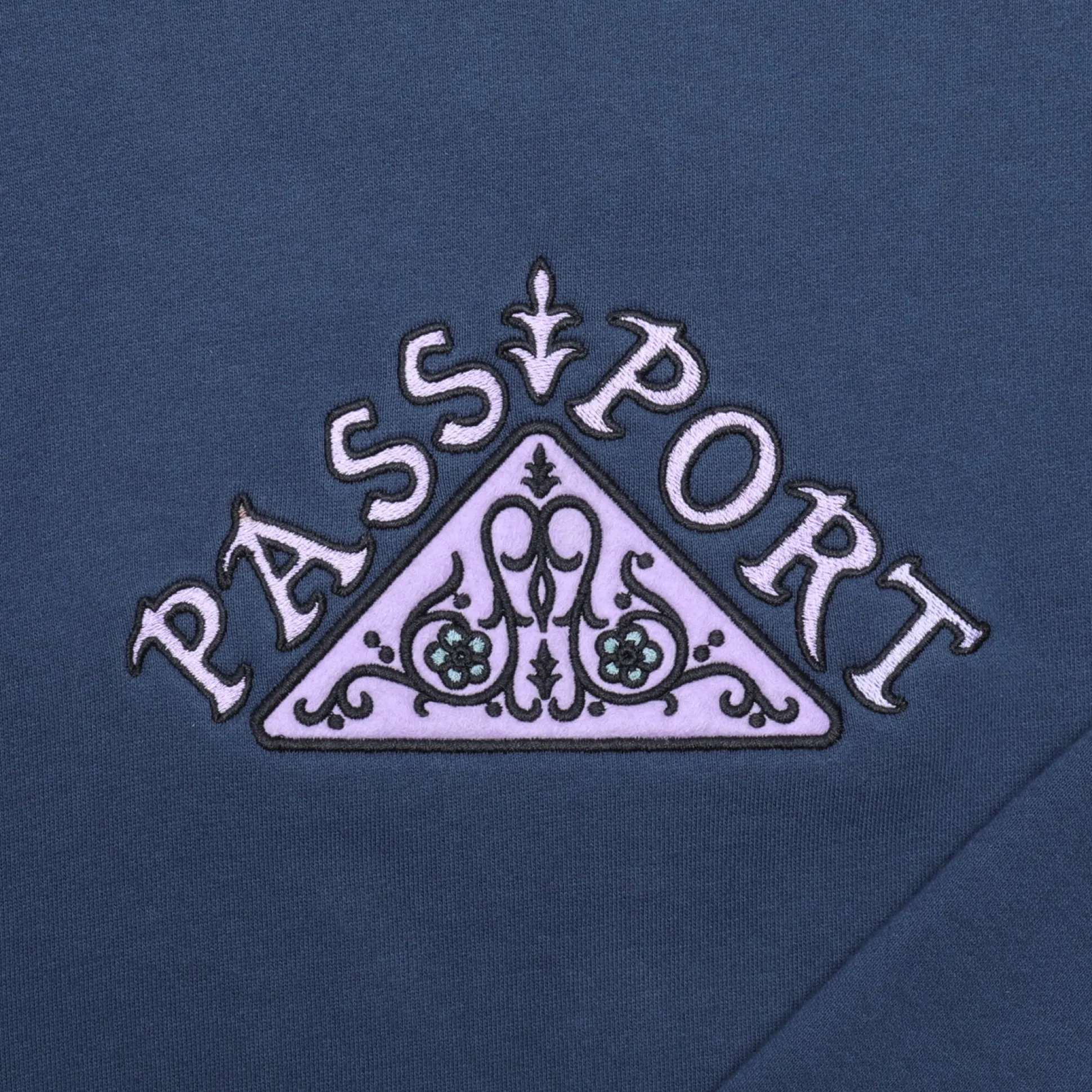 Pass~Port Manuscript crewneck in navy is apart of the fleece collection for range #40. The Manuscript Pass~Port jumper is made from a cotton polyester blend and features embroidery applique on front in the classic Pass~Port sweater fit.