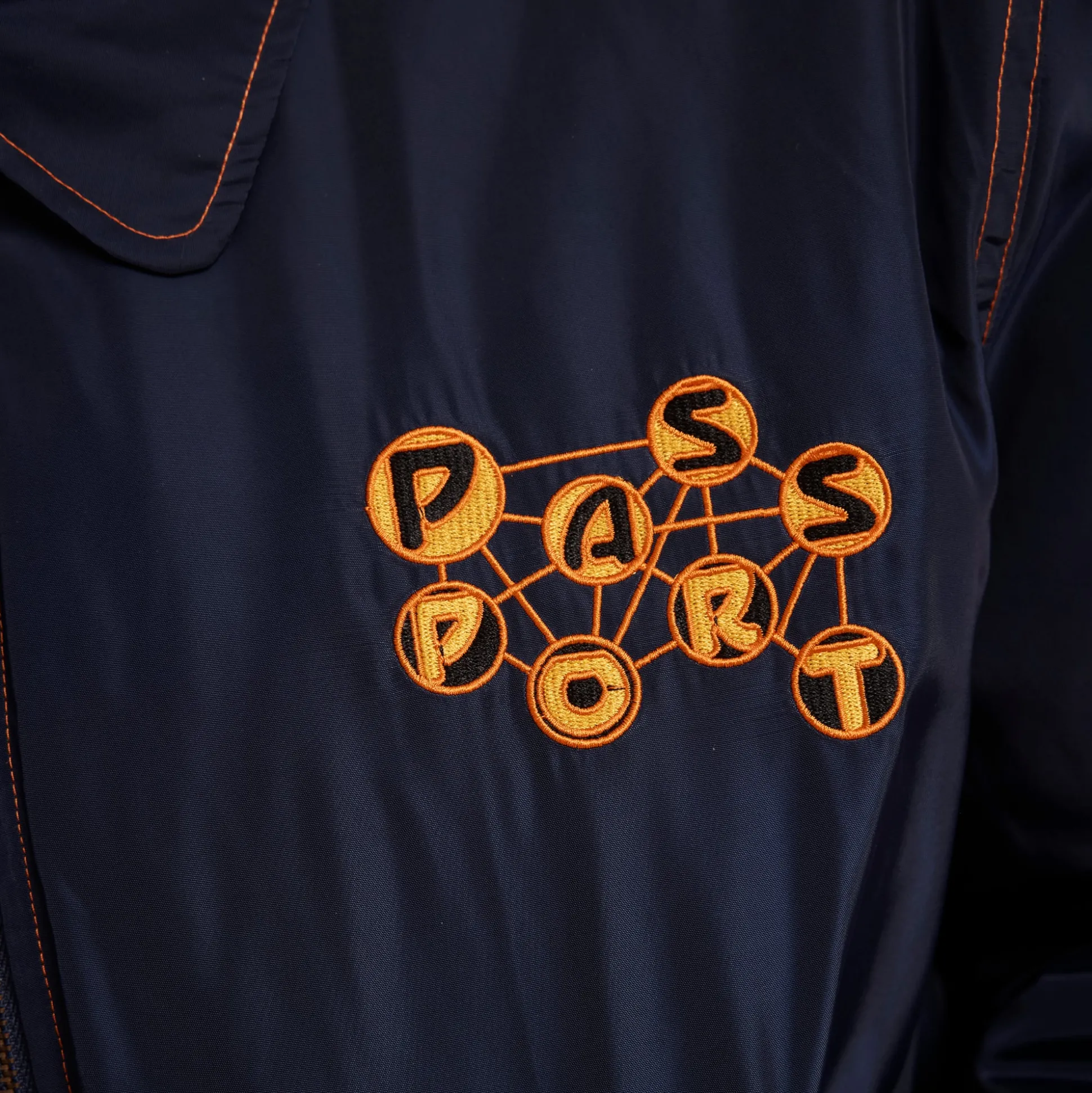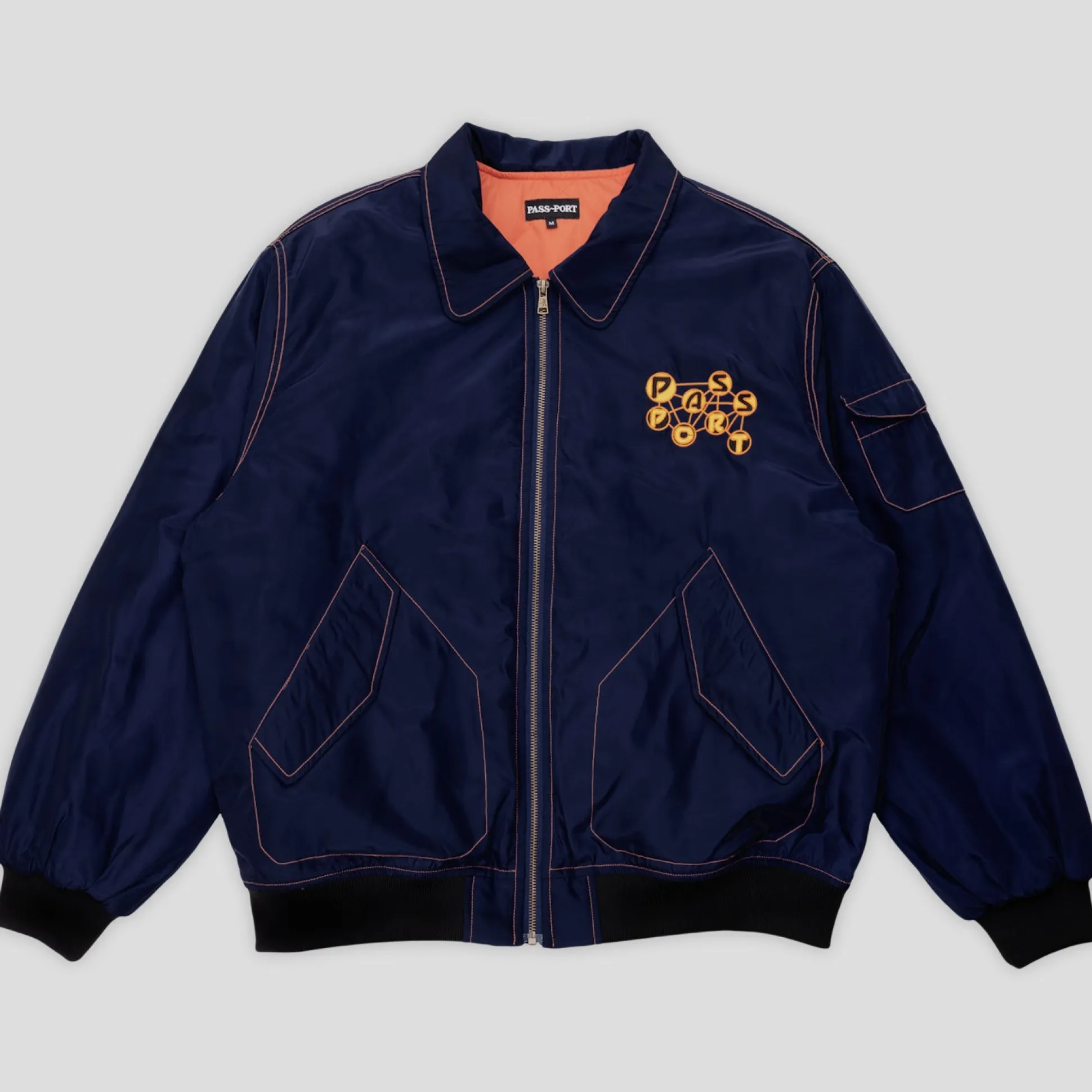 Pass~Port Molecular freight jacket in navy is a part of the cut and sew for range #44. The bomber jacket is made from 100% heavy duty nylon shell with cotton poplin lining. The jacket features a direct embroidered on front and contrast stitch.