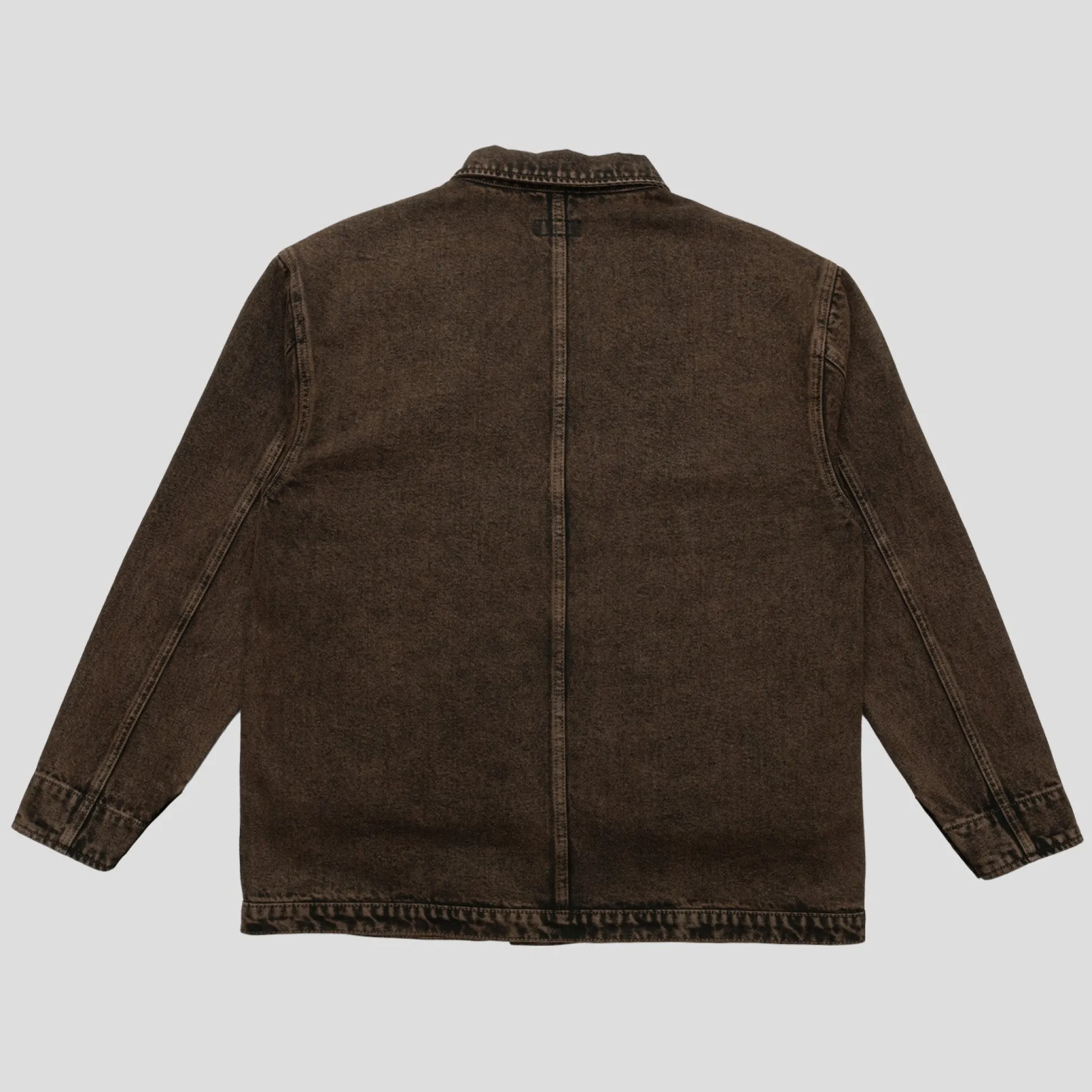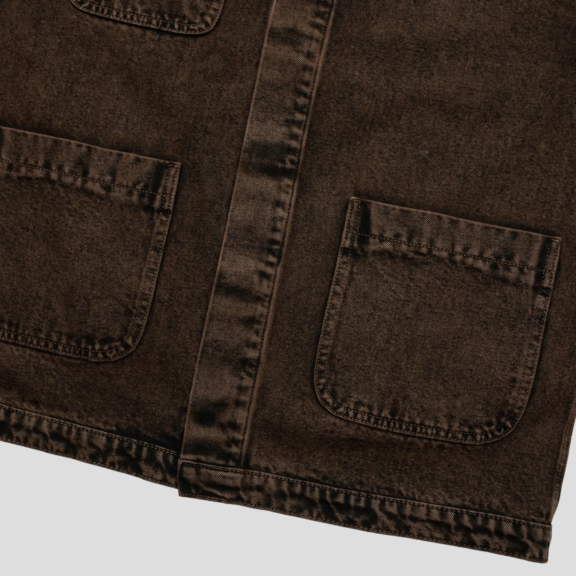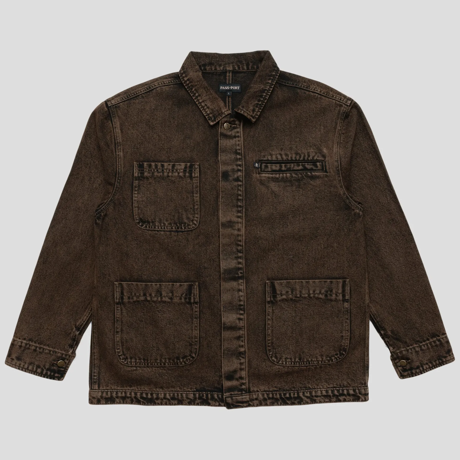 Pass~Port Painters Jacket in brown over-dye from range #39. Made from 100% Cotton 16oz Rigid Denim and fine yarn for extra strength. The jacket features 4 external pockets and hidden buttons with the top button exposed.