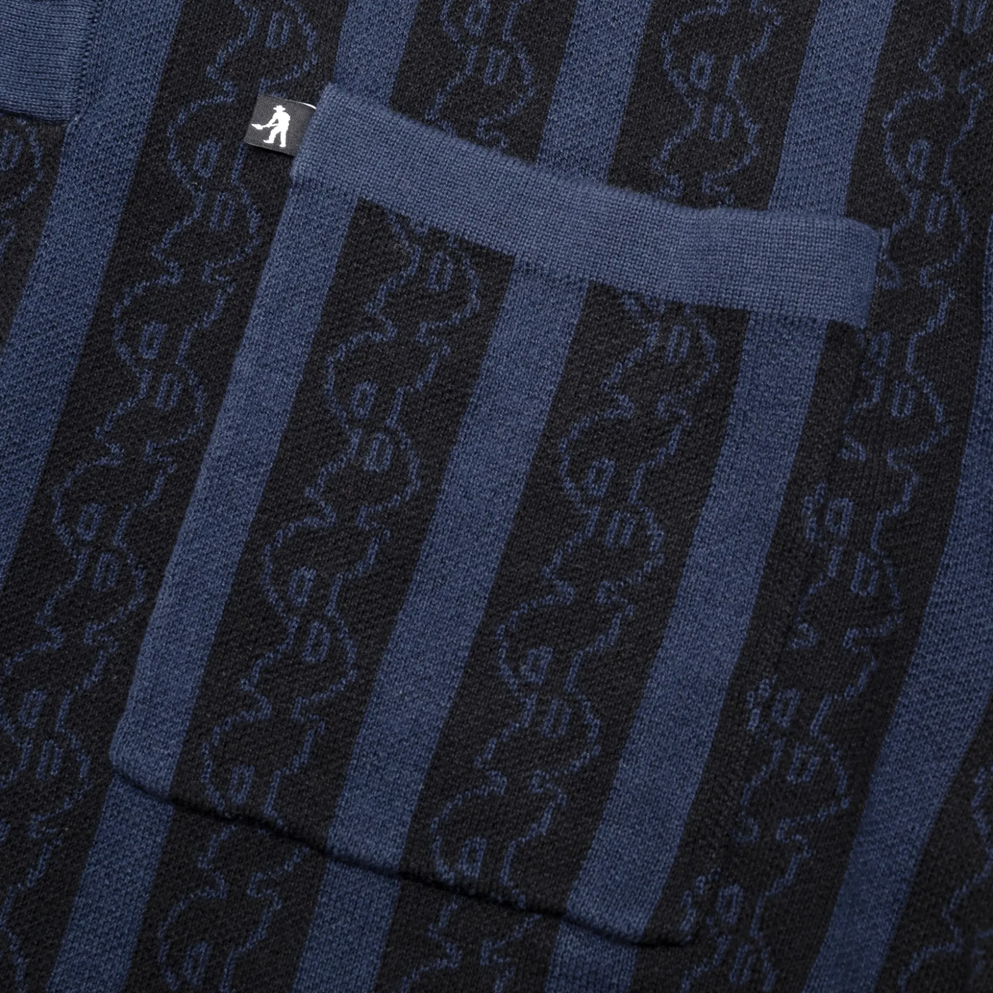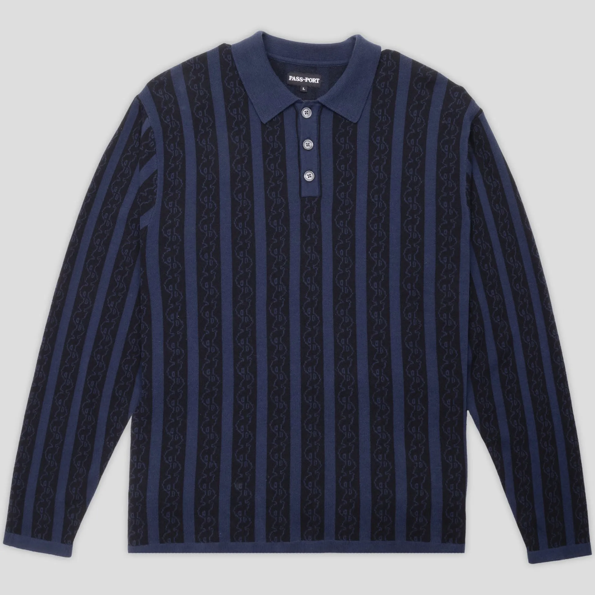 Pass~Port Pattoned Knit Polo Long Sleeve in navy from range #41. The Knit Polo shirt is made from 100% acrylic jacquard and features embossed pattern all over. The Polo also features recycled buttons and ribbed cuffs.