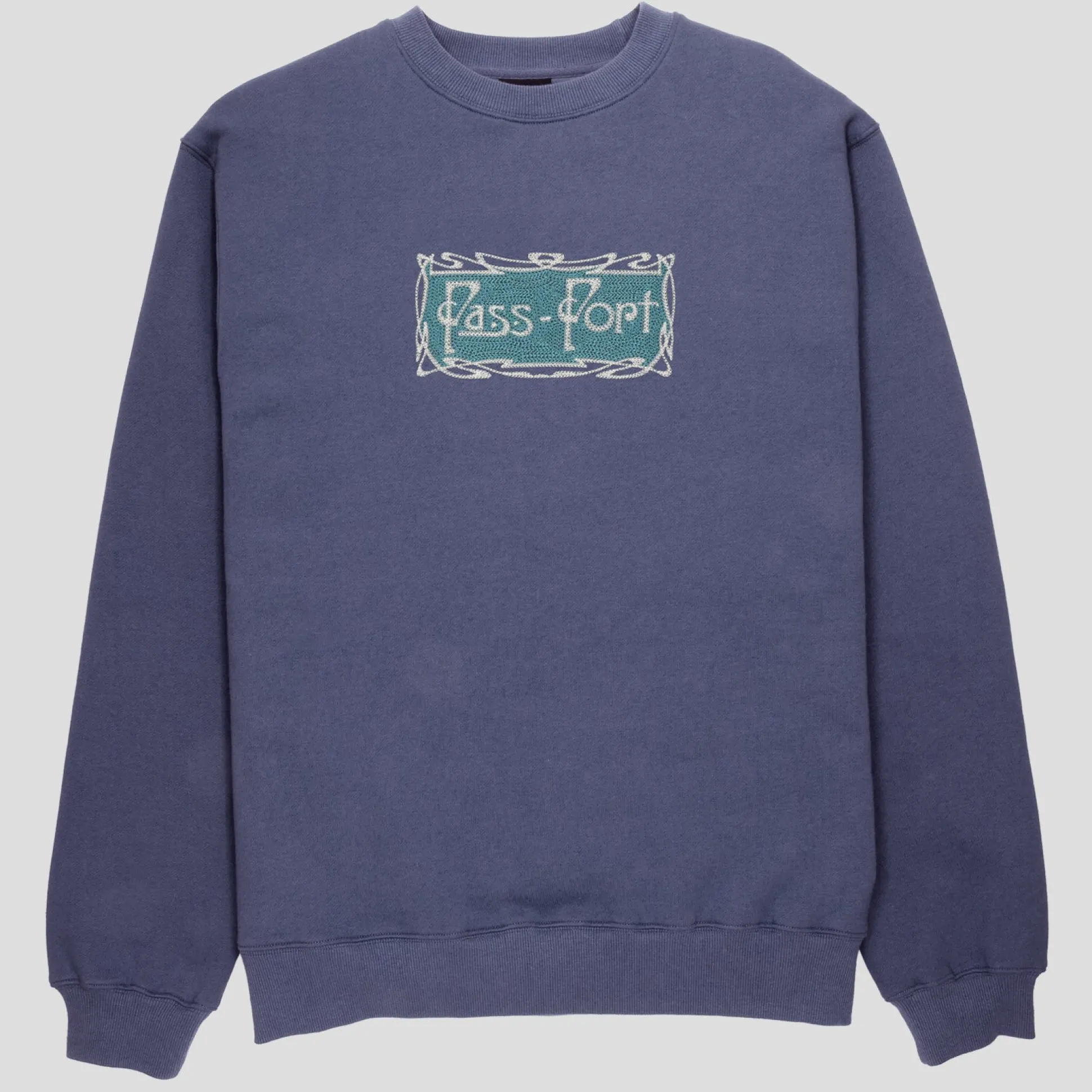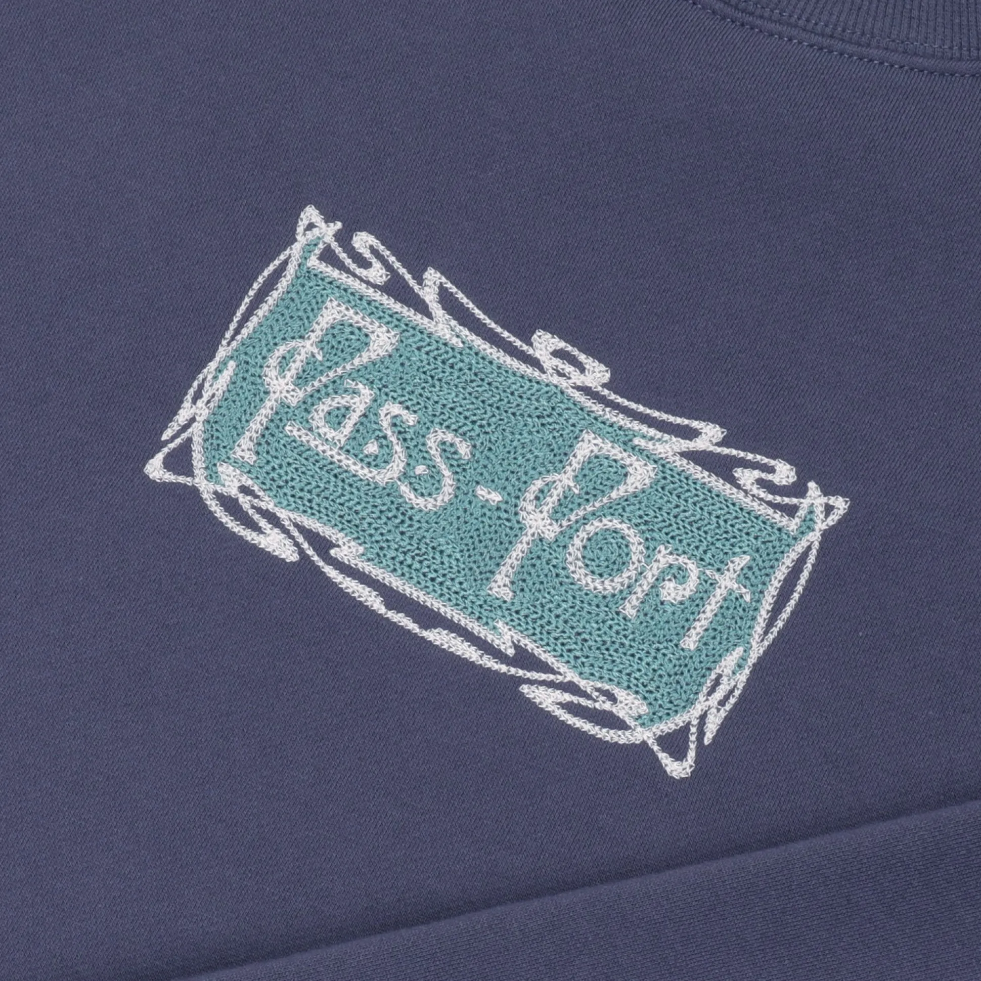 Pass~Port Plume crewneck in dusty blue is apart of range #41. The Plume Pass~Port jumper is made from a cotton polyester blend and features a chainstitch embroidered graphic on front which is finished in the classic Pass~Port sweater fit.