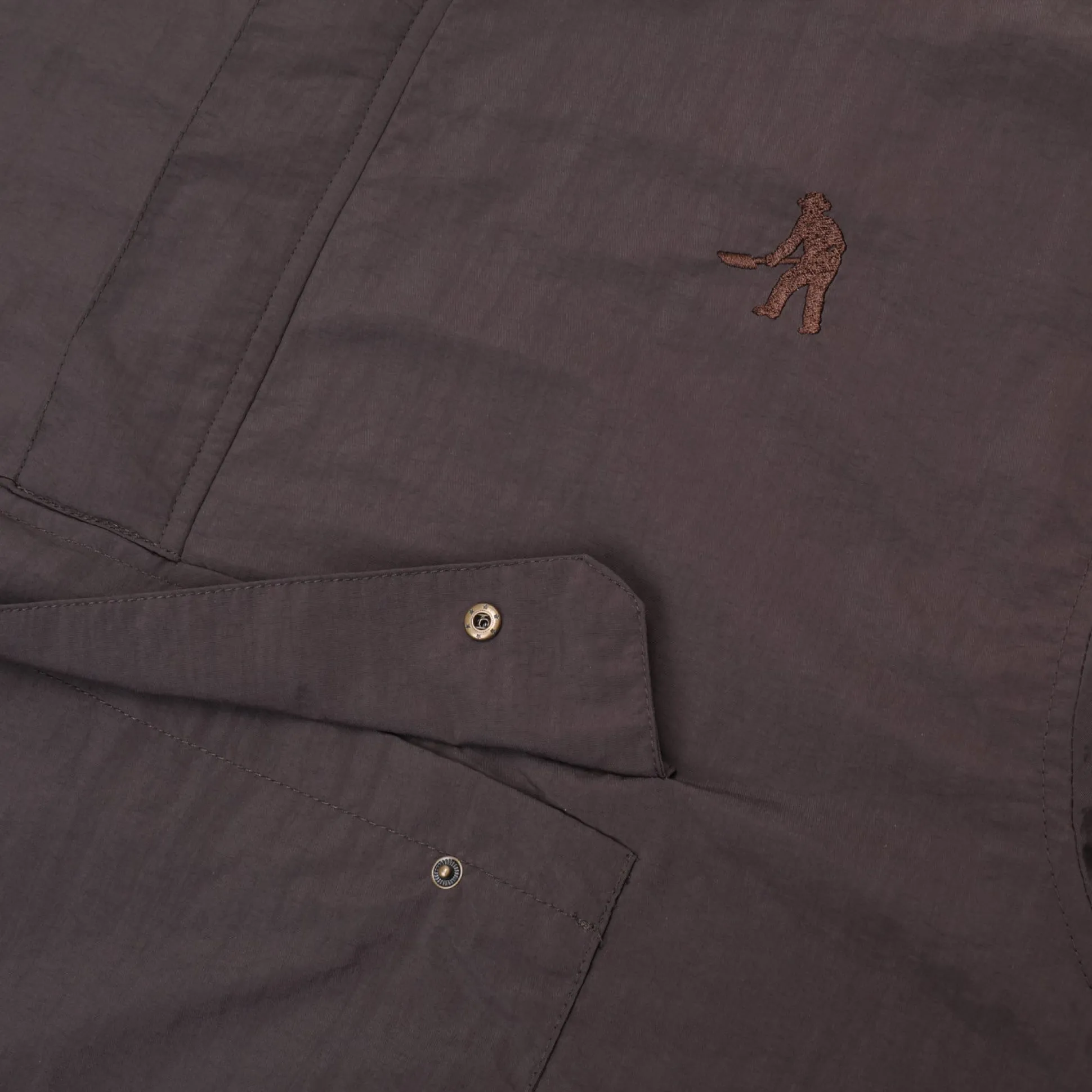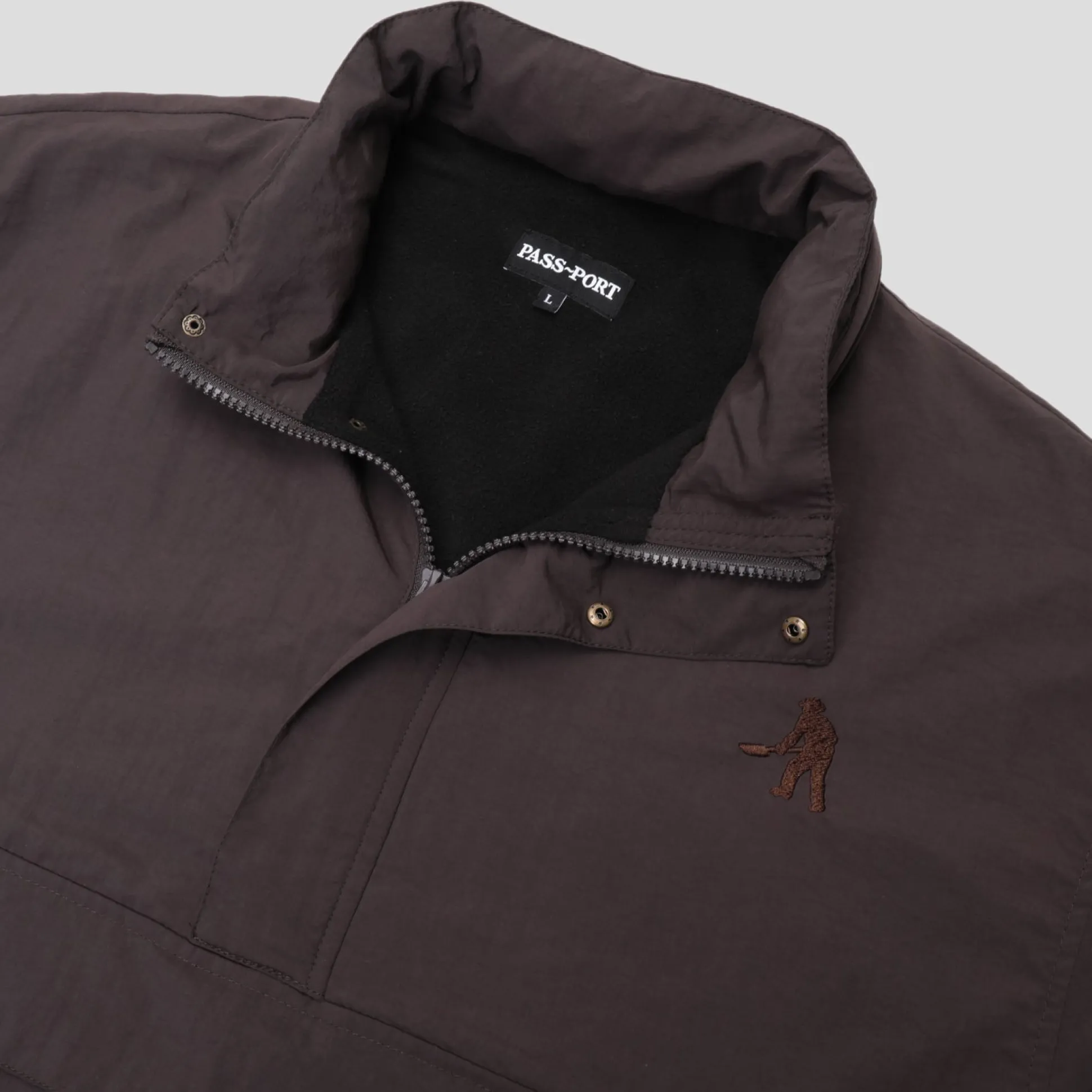 Pass~Port Pullover Lined Spray Jacket in Dark Choc is a part of the cut and sew for range #41. The Pullover Anorak Jacket is made from 100% recycled water bottles (RPET polyester) with fleece lining and packable hood. Featuring a brass snap buttons and kangaroo pouch.