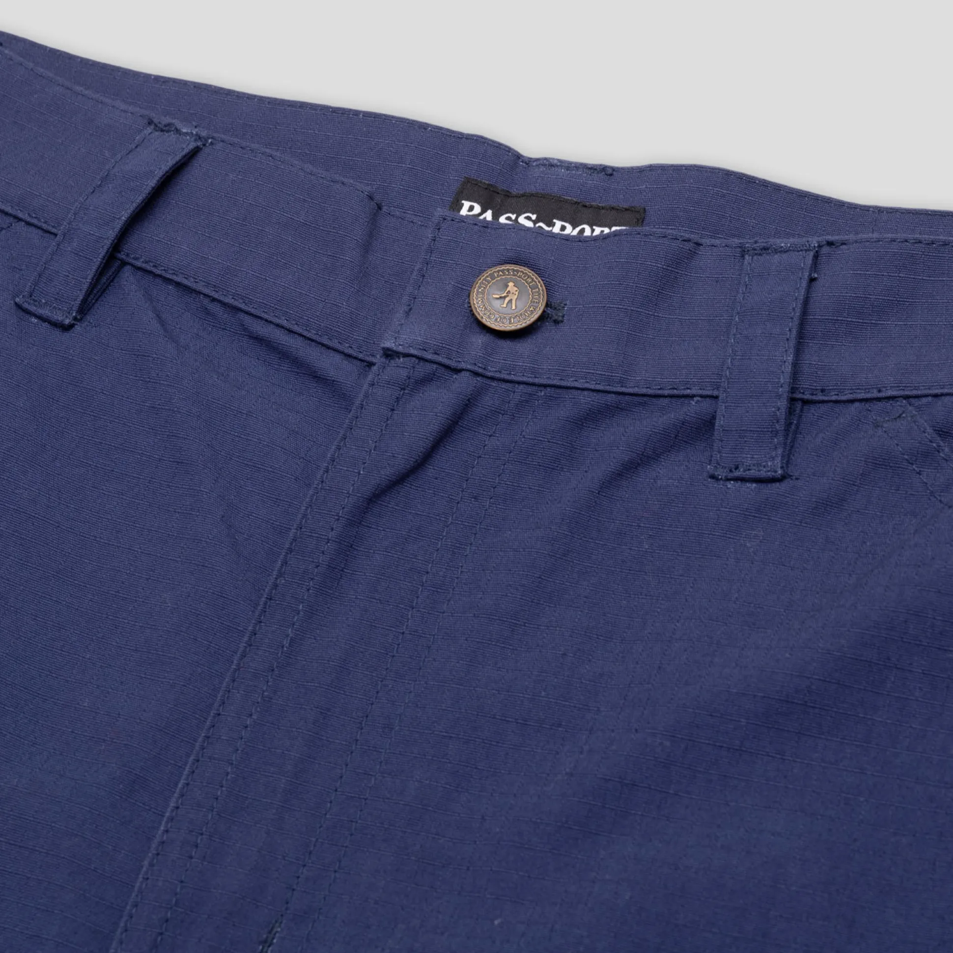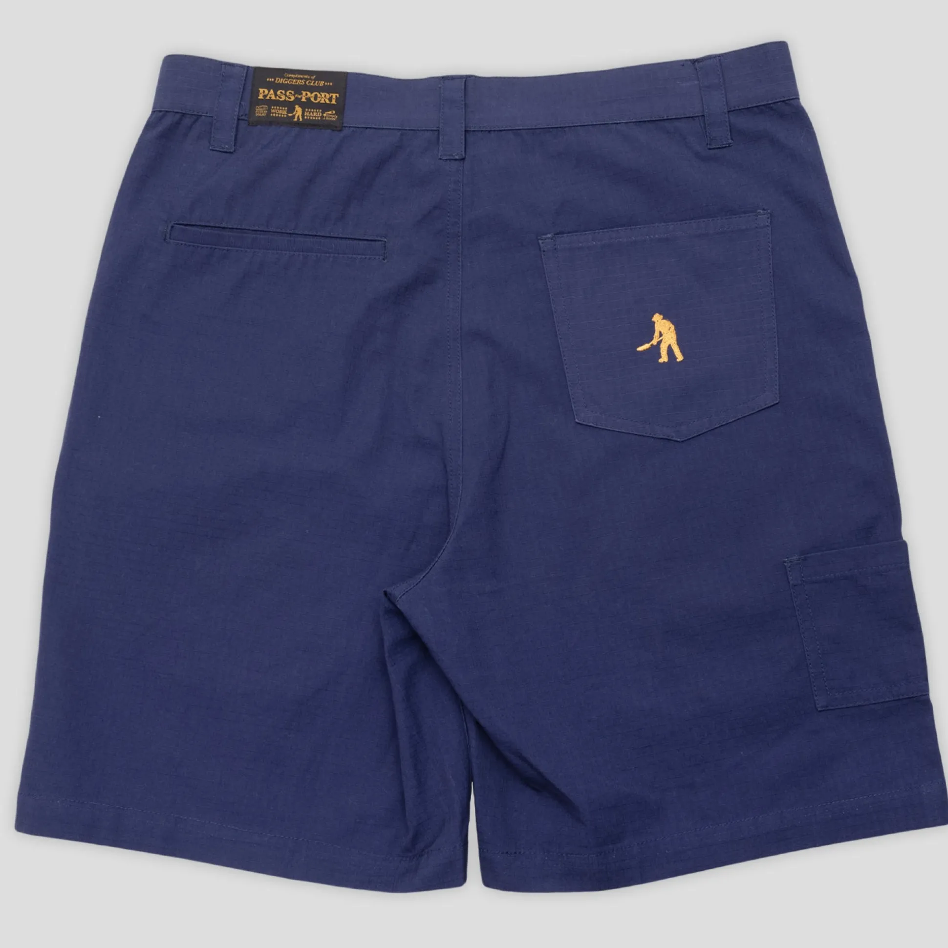 Pass~Port Ripstop Double Knee Diggers Club short from range #44. The Double knee short is made from 100% cotton ripstop and has been updated with double paneling in the knees. Made for hard work these shorts feature the digger embroidery on back pocket as well tonal triple stitch construction.