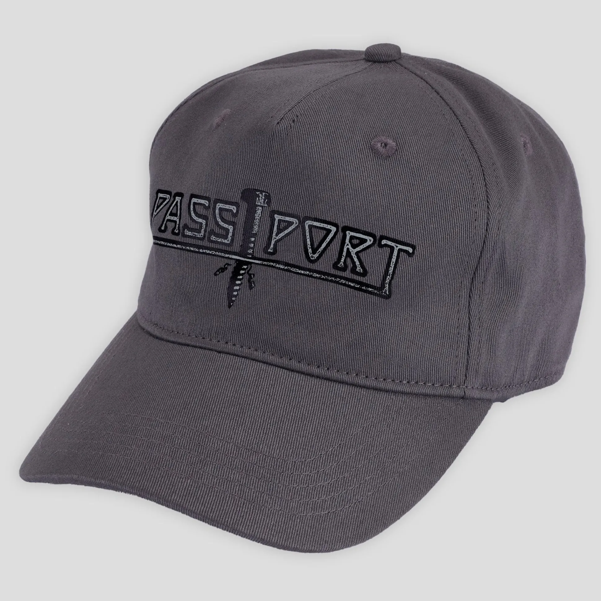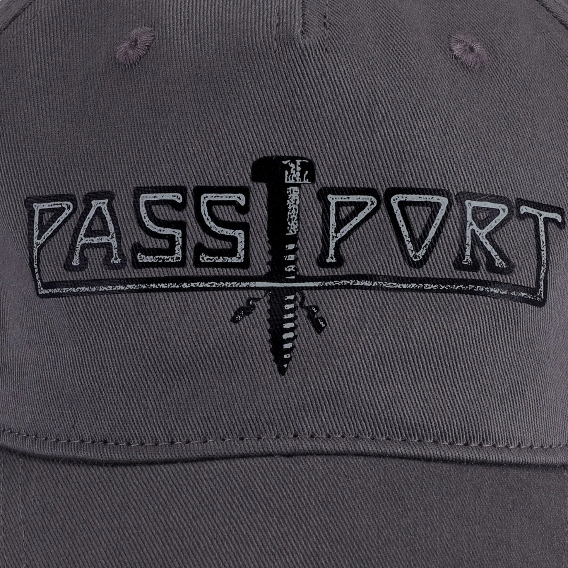 Pass~Port Screwed packers cap from range #44. The Pass~Port hat is a 5 panel construction made from 100% cotton twill and features screen print on front with adjustable strapback with brass buckle.