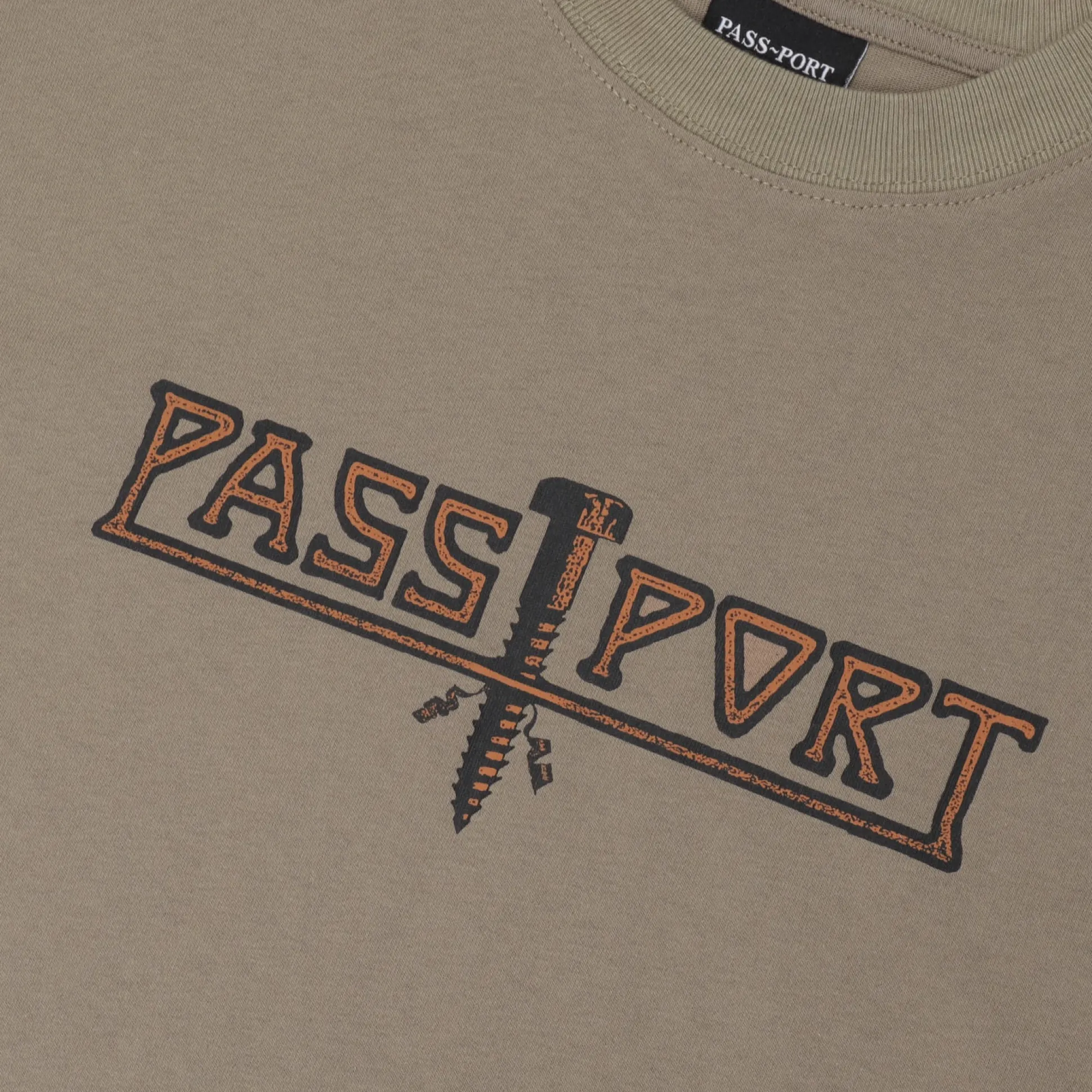 Introducing Range #44: The Pass-Port Screwed tee in khaki is made from 100% cotton and features a screen printed graphic on front. It offers the signature Pass-Port fit.