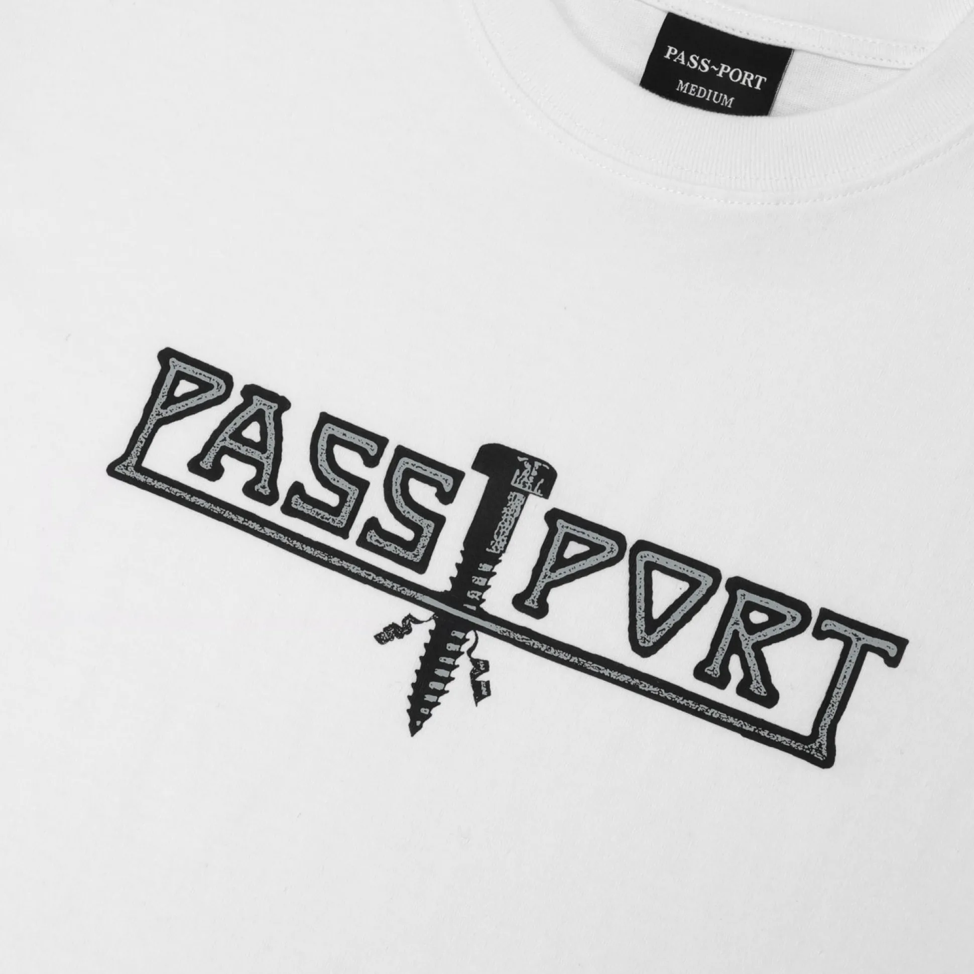 Introducing Range #44: The Pass-Port Screwed tee in white is made from 100% cotton and features a screen printed graphic on front. It offers the signature Pass-Port fit.