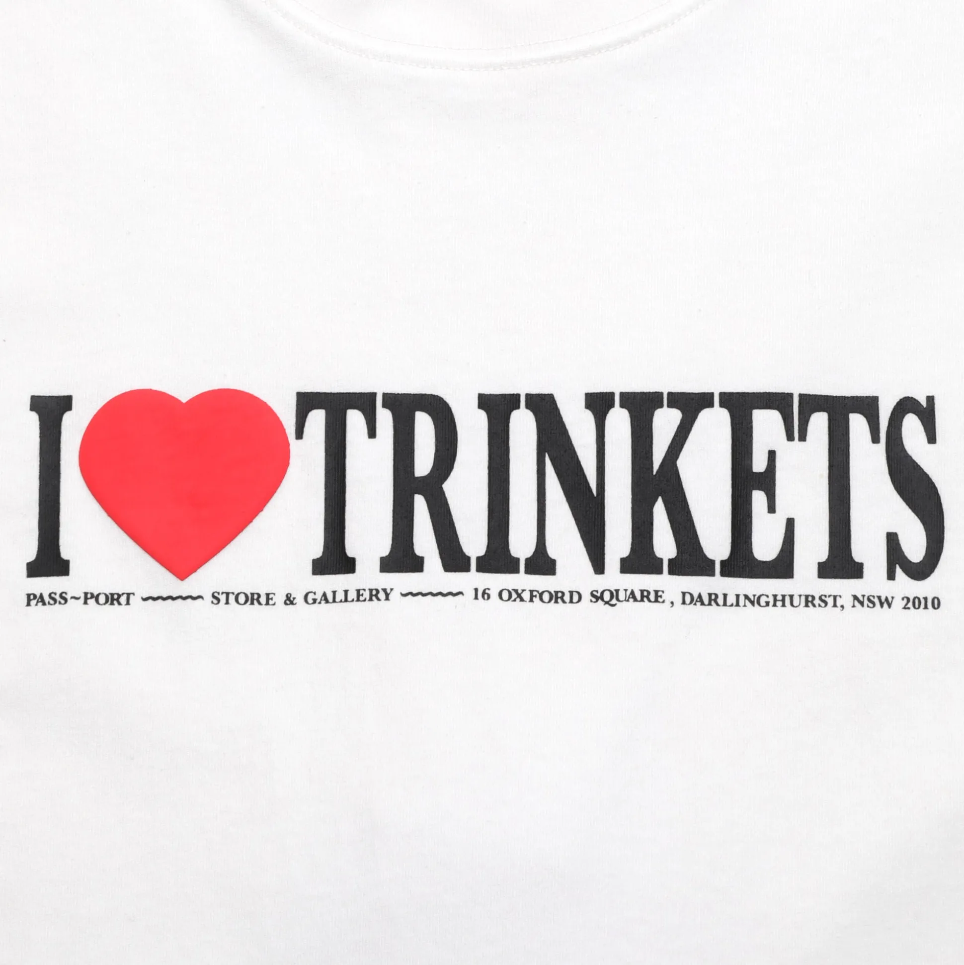 Pass~Port Store & Gallery exclusive merchandise returns with new graphics and colours. A new take on Sydney souvenir merchandise, The I Love Trinkets tee is made from 100% cotton with screen print on front and puff print.